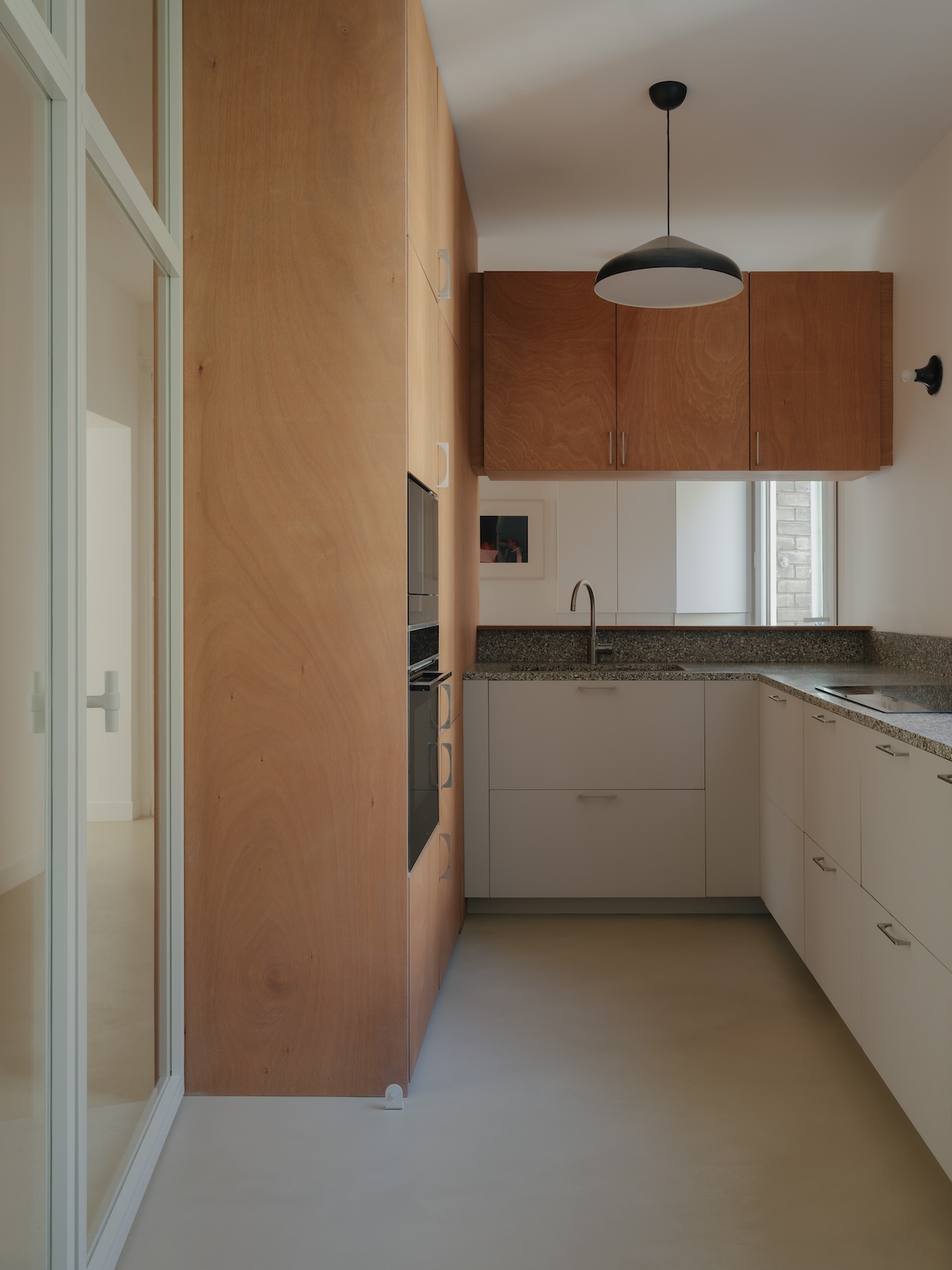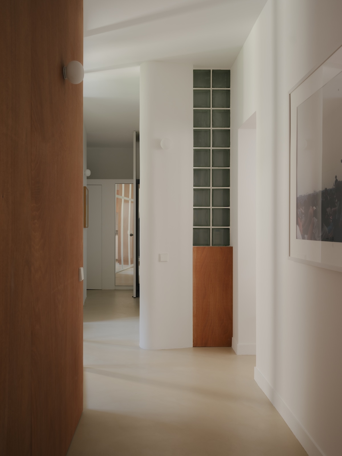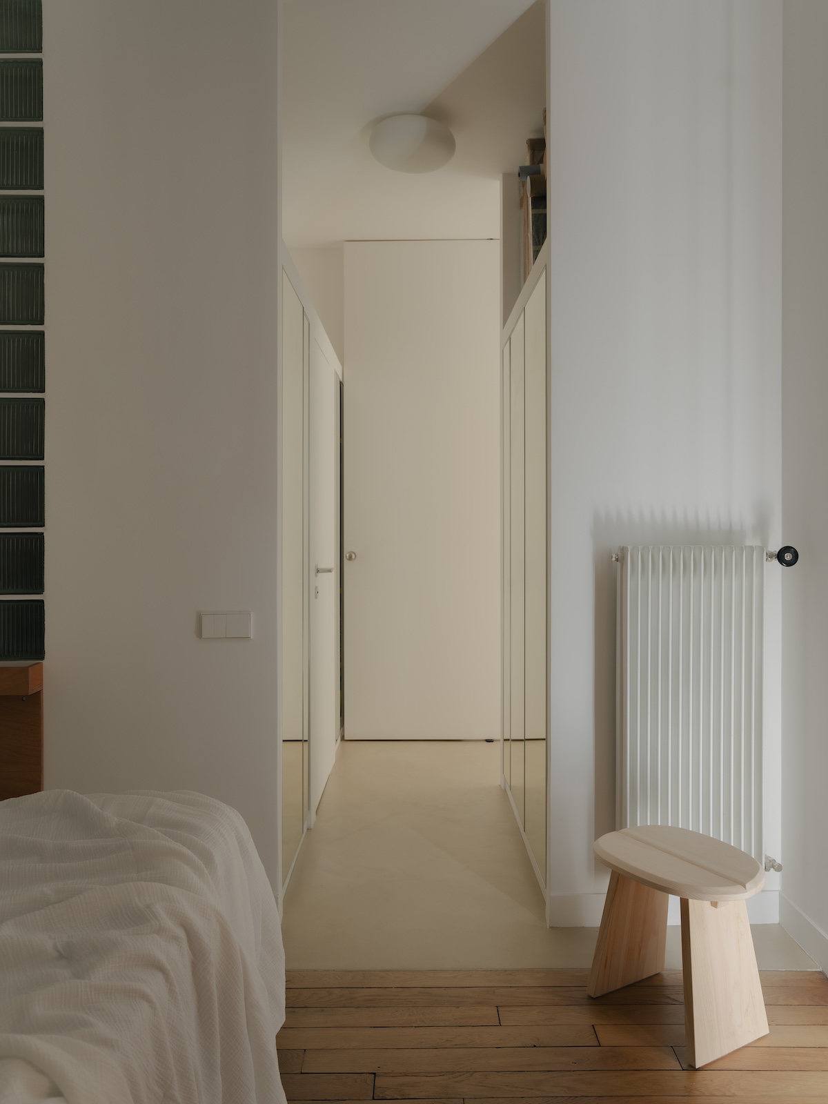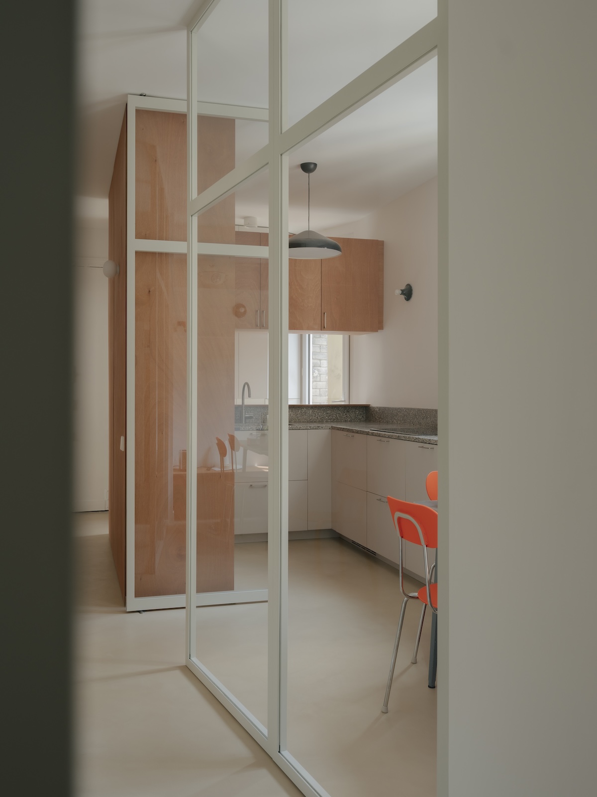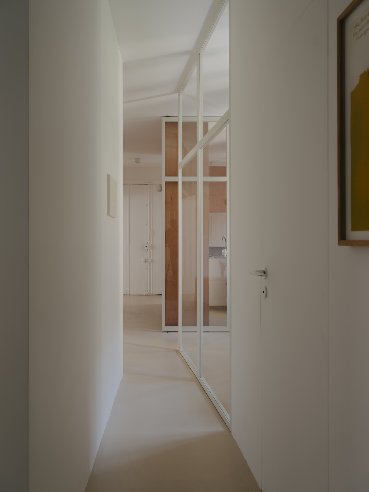 Le noyau central est entièrement retravaillé. La distribution et les espaces servants s’articulent de façon plus efficiente. Les partitions plus ou moins translucides, comme la verrière de la cuisine ou les pavés de verre, laissent pénétrer la lumière dans les volumes anciennement sombres.