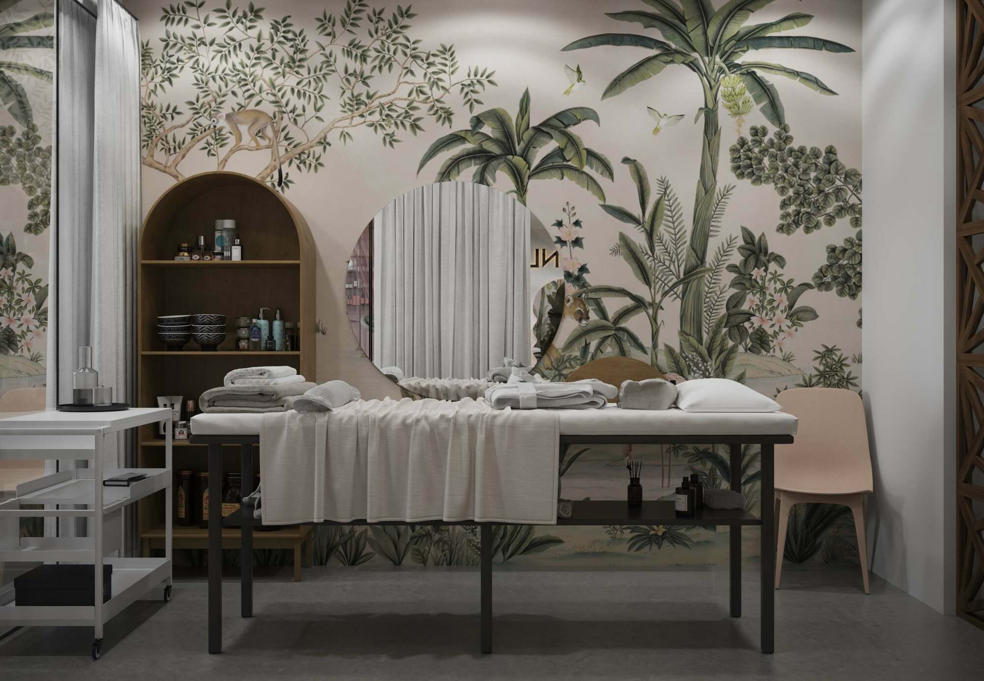 Le second, dissimulé derrière des parois vitrées, se transforme en refuge. Une lumière tamisée, des fresques tropicales évoquant l’Asie ou les archipels du Pacifique, une atmosphère plus secrète et enveloppante. C’est la zone du lâcher-prise, où l’on s’allonge, où l’on ferme les yeux, où l’on bascule vers un calme absolu.