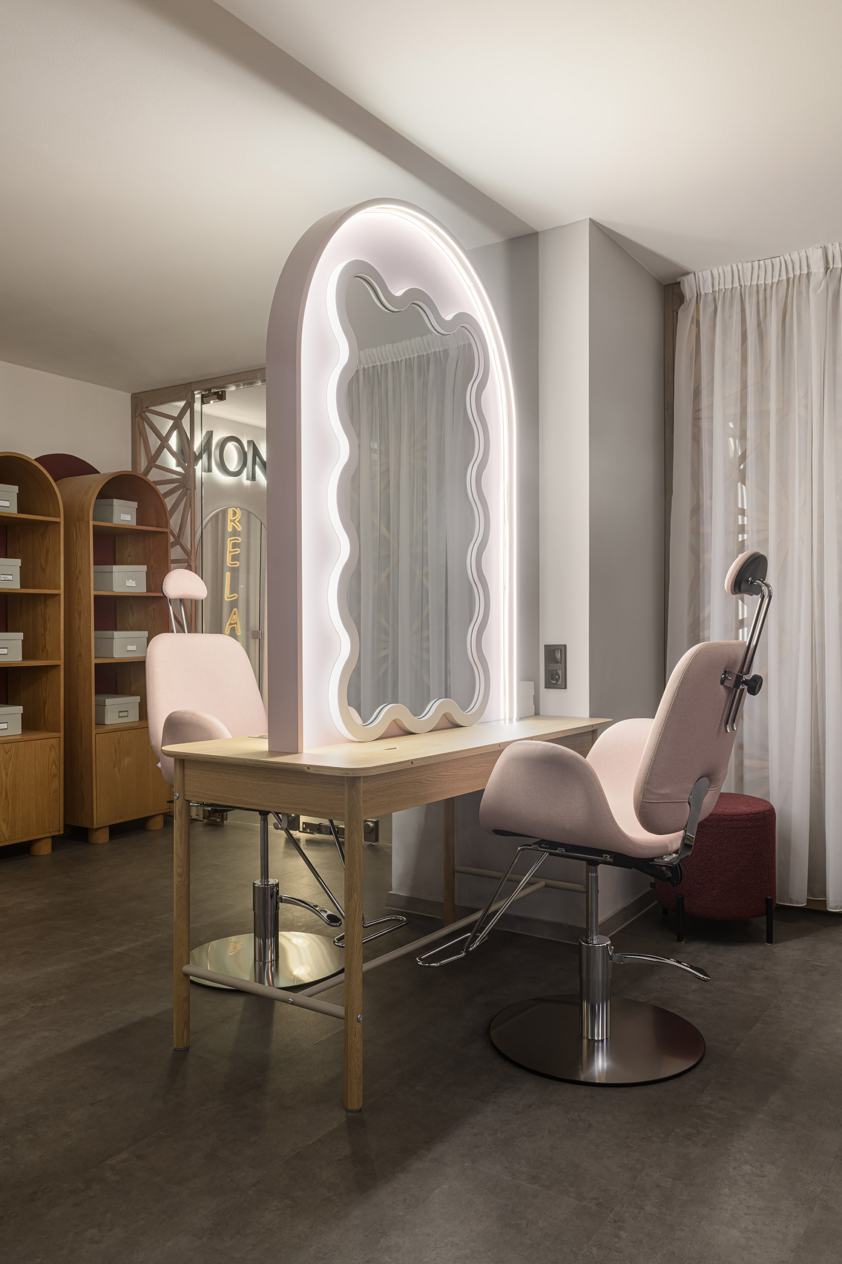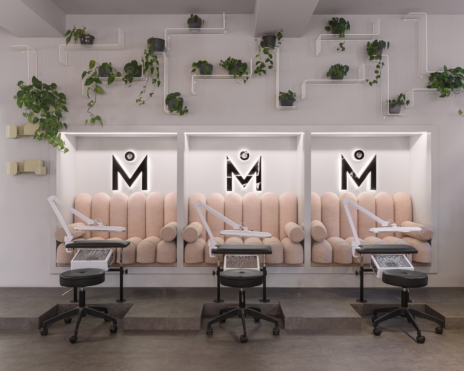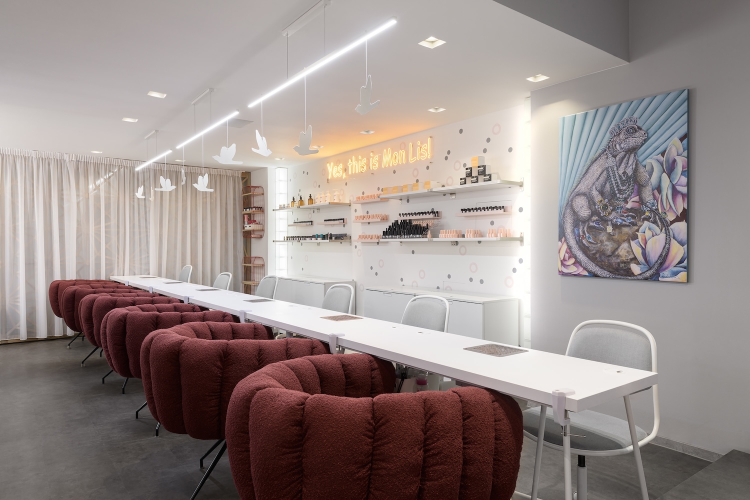 Monlis est une enseigne européenne bien établie, forte de dix ans d’expertise dans l’esthétique de l’ongle. Si chaque salon affirme sa propre identité, un langage chromatique commun – gris, noir, rose – crée le fil rouge de la marque. Pour Munich, Design Buro Odintsova propose une variation inattendue : un bourgogne profond, presque vineux, chargé d’intensité et de sensualité. Une nuance vibrante, sophistiquée, qui donne le ton global du lieu.