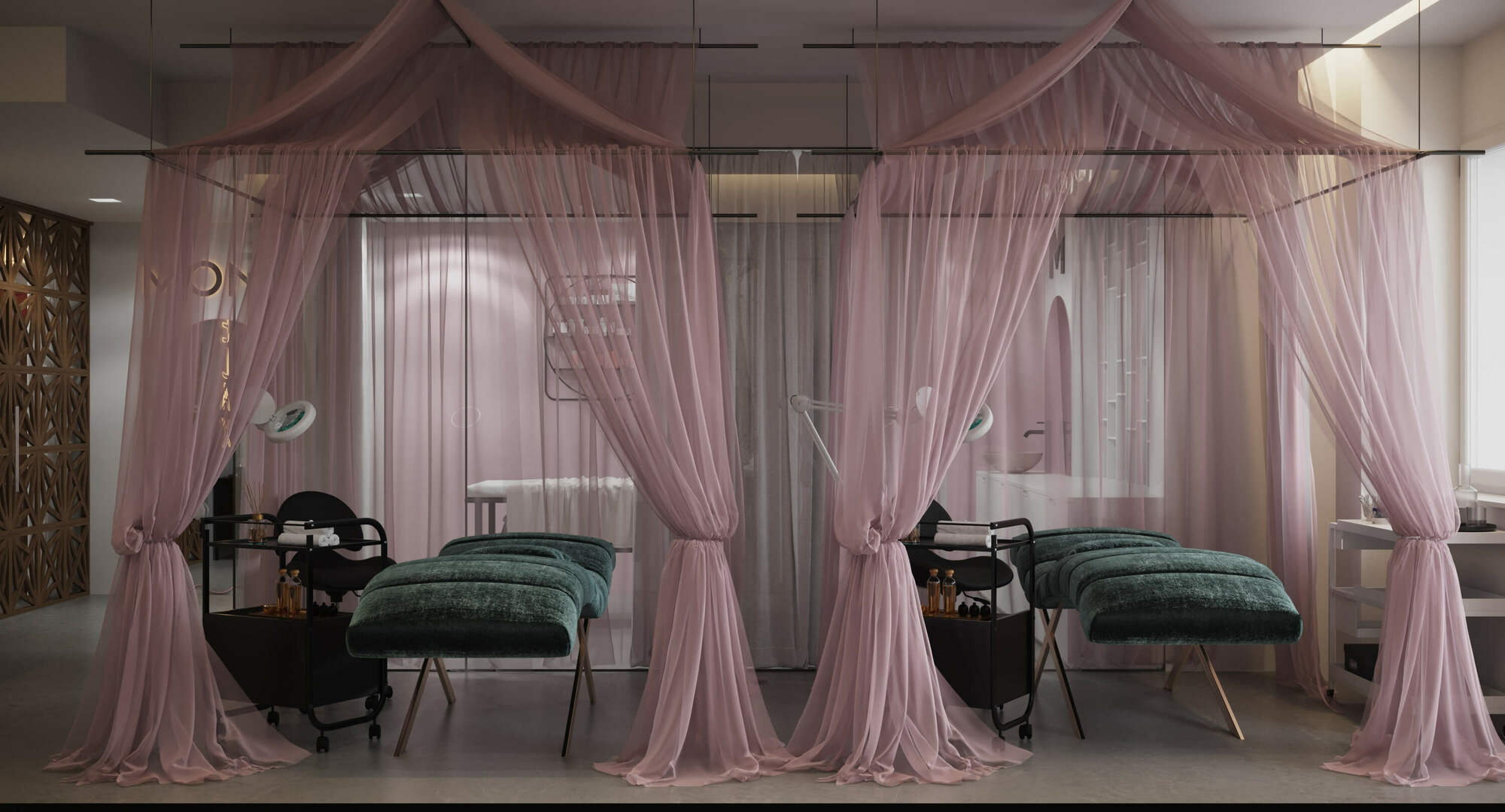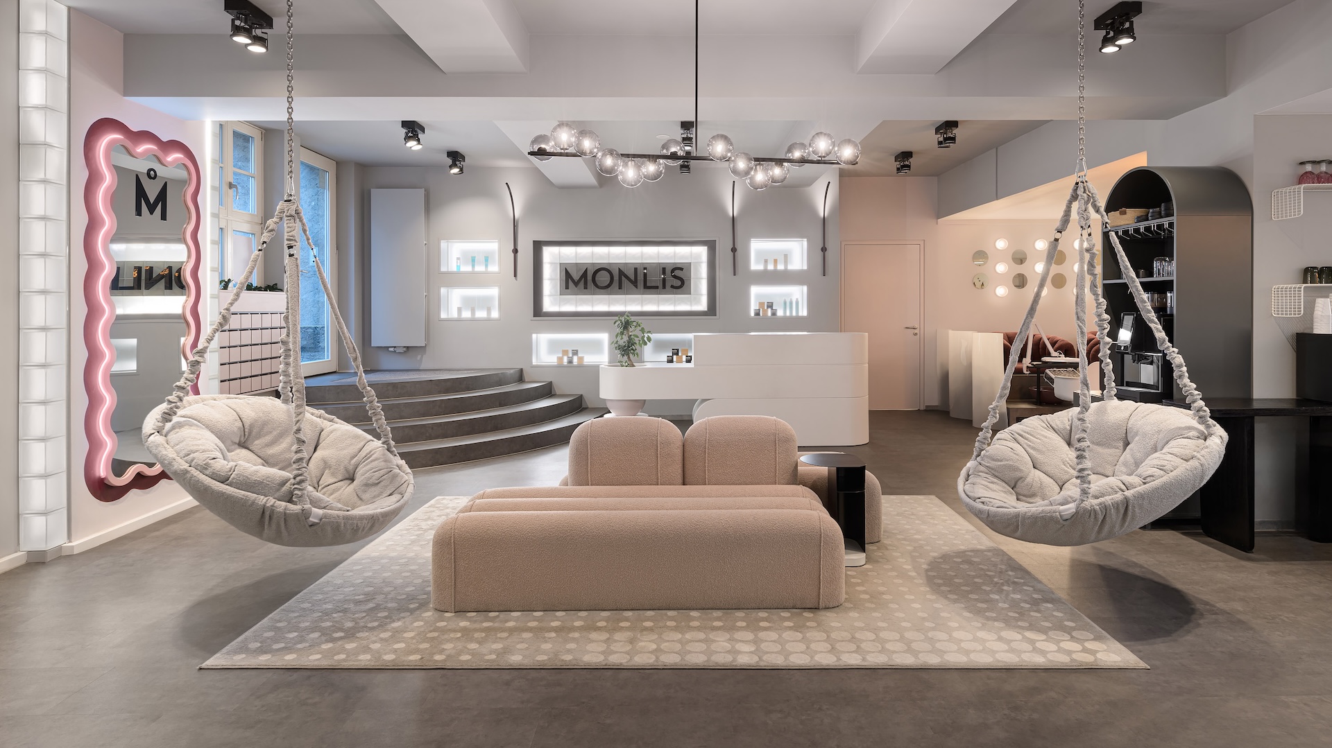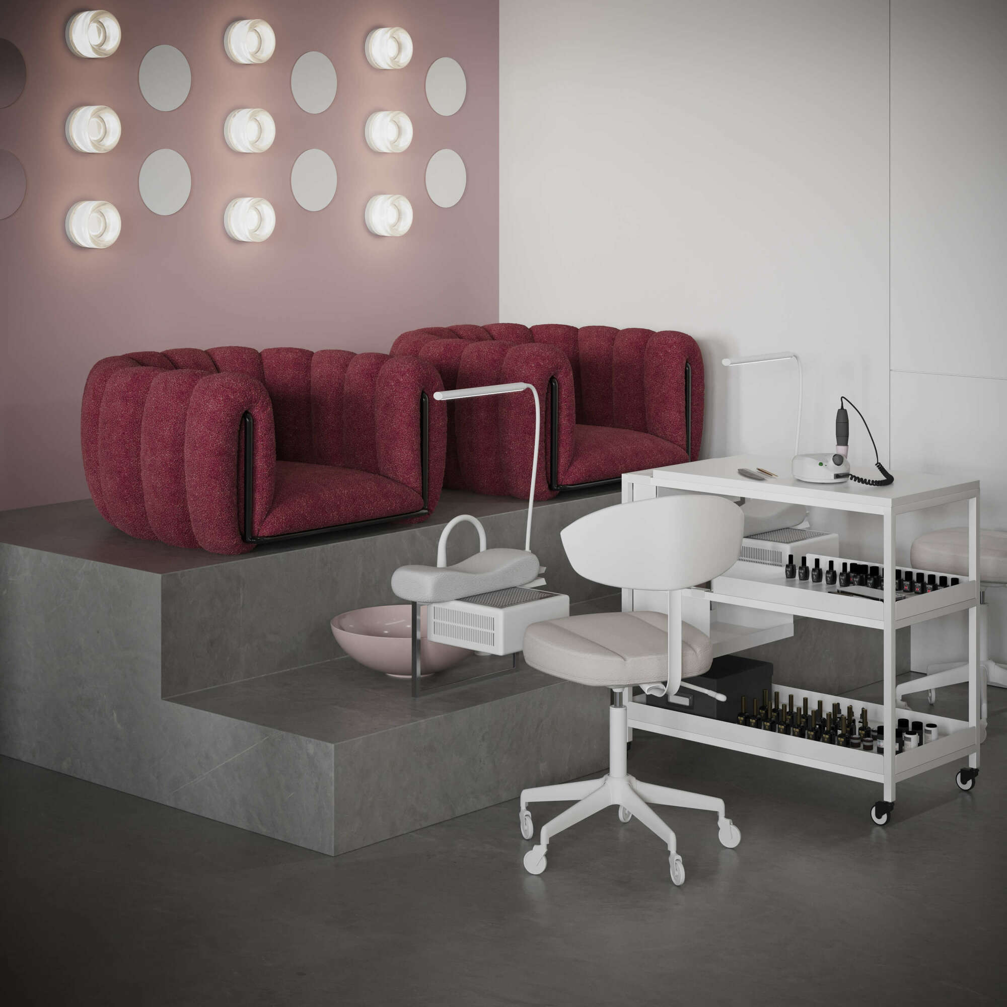 Monlis est une enseigne européenne bien établie, forte de dix ans d’expertise dans l’esthétique de l’ongle. Si chaque salon affirme sa propre identité, un langage chromatique commun – gris, noir, rose – crée le fil rouge de la marque. Pour Munich, Design Buro Odintsova propose une variation inattendue : un bourgogne profond, presque vineux, chargé d’intensité et de sensualité. Une nuance vibrante, sophistiquée, qui donne le ton global du lieu.