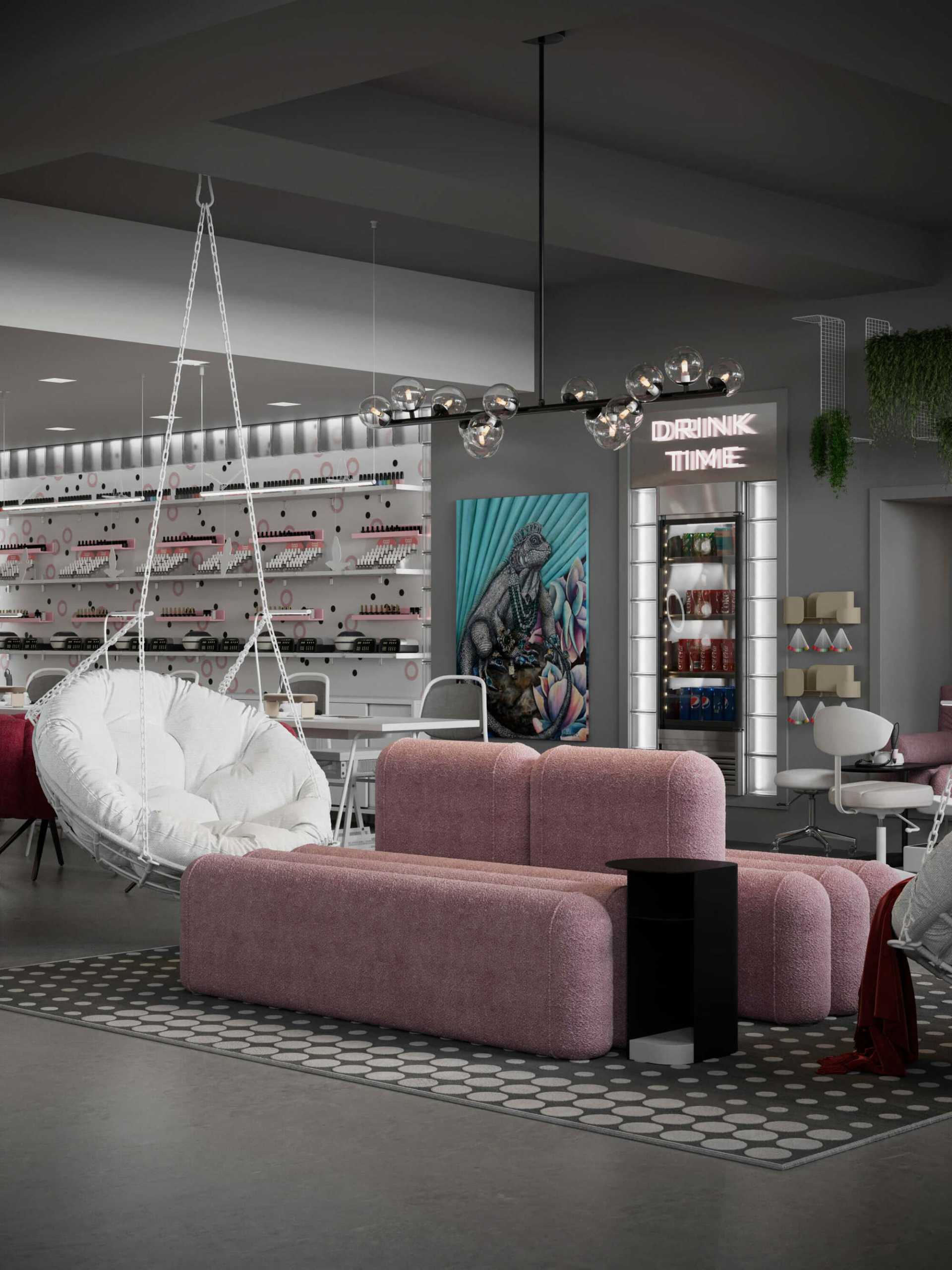 « Le volume du bâtiment nous a guidés dès les premières esquisses », raconte la designer Lizaveta Odintsova. Entre plafonds bas et hauteurs vertigineuses, l’espace imposait une narration verticale. Les zones intimes jouent la proximité, tandis que les parties les plus élevées invitent naturellement le regard à se hisser vers le haut. Une chorégraphie de lignes et de perspectives qui devient l’âme du projet.