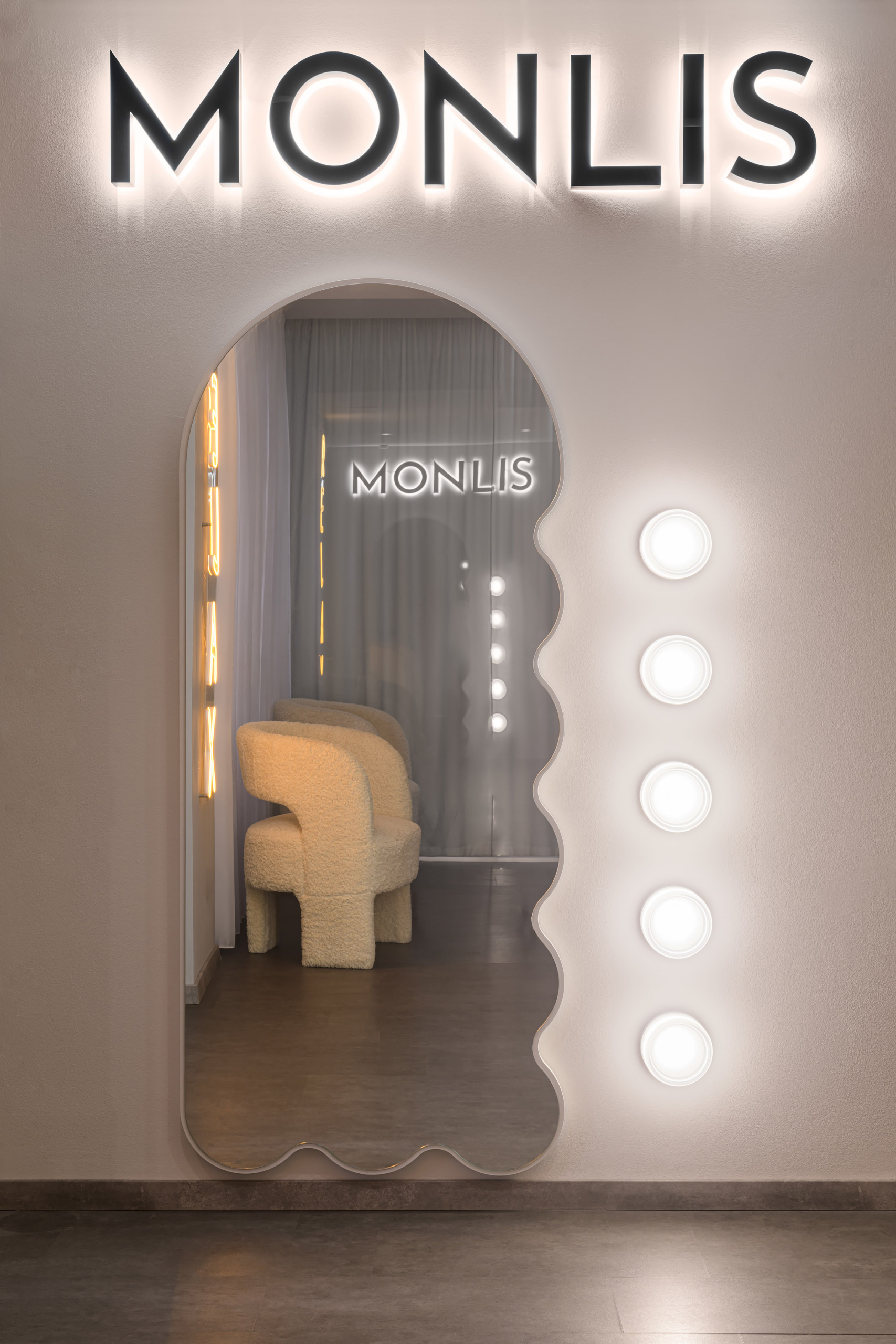 La sélection des matières suit un principe cher à la designer : « simple, mais avec caractère ». Le salon marie ainsi le chrome brillant, le métal noir, les surfaces grises texturées, et le moelleux de tissus bouclés. Un vocabulaire volontairement contrasté, enrichi de formes douces inspirées de la lettre M, élément fort du logo Monlis.