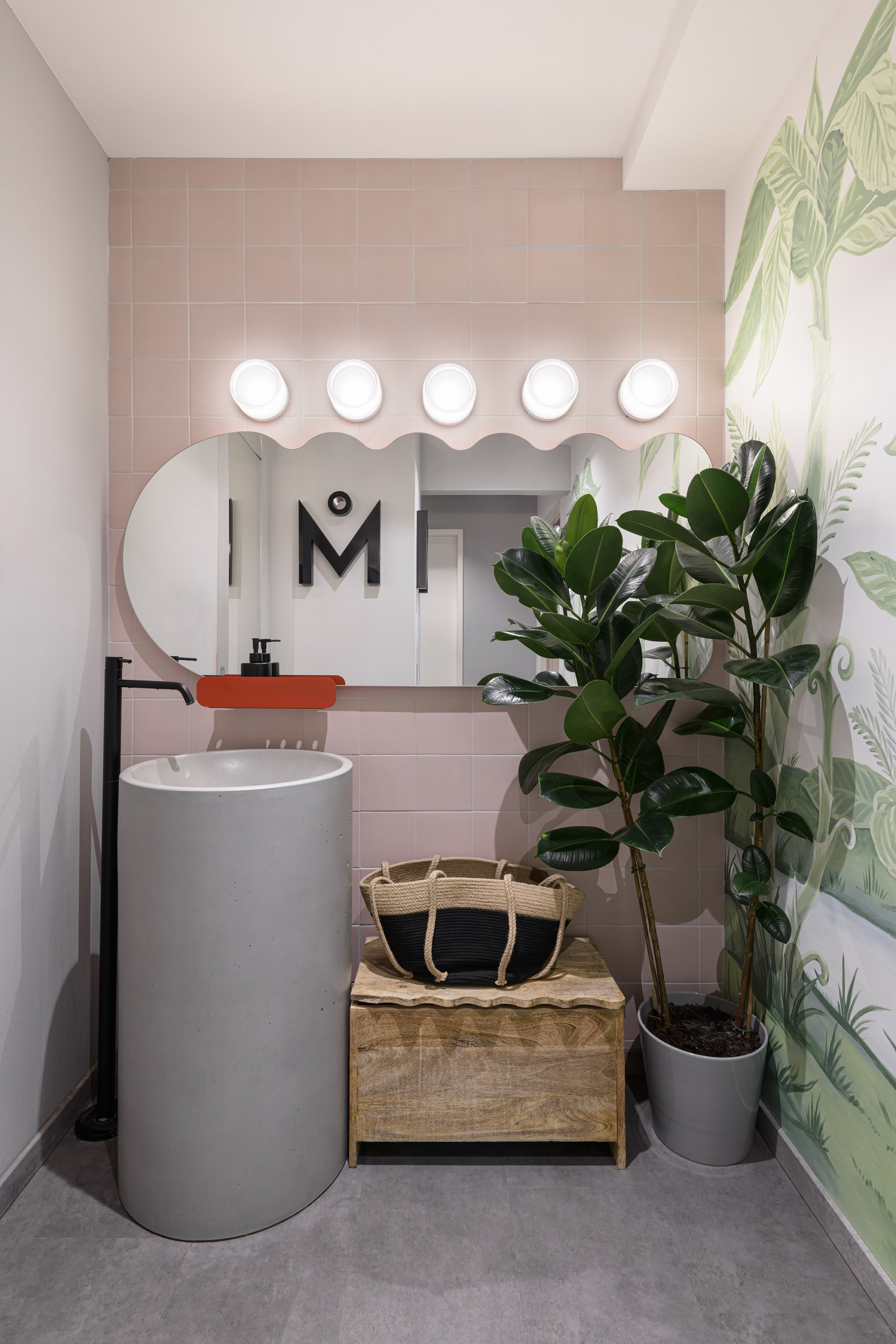 Les anciennes cabines de douche deviennent des espaces de pédicure, tandis que les niches existantes sont revisitées pour accueillir de nouvelles fonctions. Une manière ingénieuse d’honorer l’existant tout en lui insufflant un second souffle.