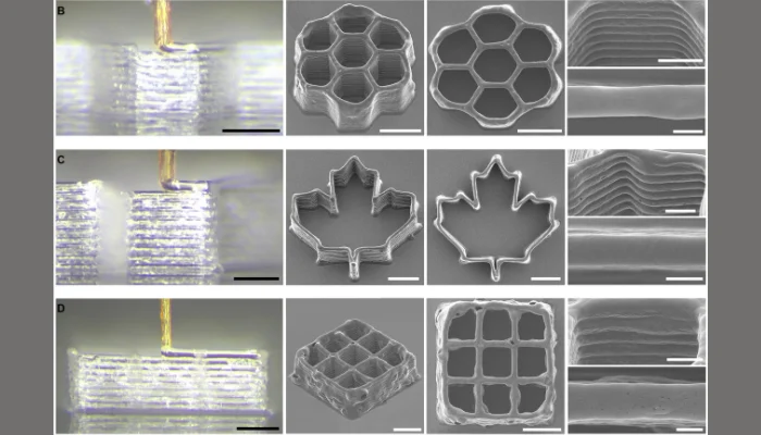 Afin de garantir une impression fiable, l’équipe a analysé la façon dont différentes encres s’écoulent à travers le canal naturel et a identifié les conditions de fonctionnement qui empêchent le colmatage ou la rupture. Dans le cadre de ces paramètres, la bio-buse a fonctionné de manière étonnamment efficace. À l’aide d’encres biologiques commerciales telles que Cellink Start et Pluronic F 127, l’équipe a imprimé des structures en nid d’abeille et des échafaudages tridimensionnels contenant des cellules cancéreuses B16. Les filaments mesuraient entre 18 et 28 micromètres, et la viabilité cellulaire est restée d’environ 86 % après l’impression.
