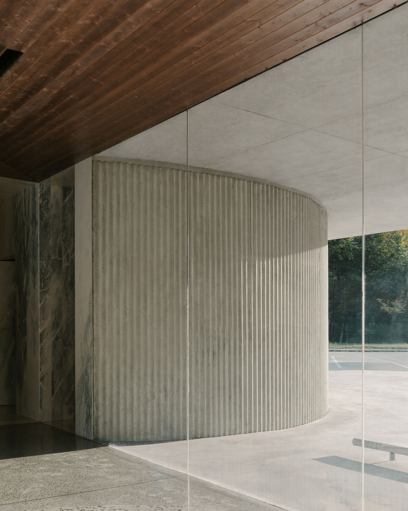 Sur le plan des matériaux, le pavillon est à la fois brut et raffiné. Le béton ondulé capte la lumière rasante du soleil et les ombres des montagnes, tandis que le marbre poli reflète le ciel et les silhouettes des personnes qui y évoluent. Des surfaces vitrées glissent entre ces textures, multipliant les reflets des arbres et de l’eau, si bien que le bâtiment apparaît parfois davantage comme un écrin que comme un objet. Sous le porte-à-faux de six mètres, des zones d’ombre et de lumière se déplacent au fil de la journée, créant des espaces informels propices à l’attente, à la contemplation du lac ou simplement à la contemplation.