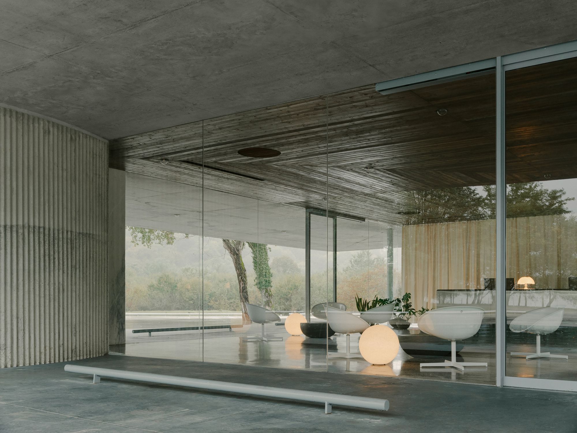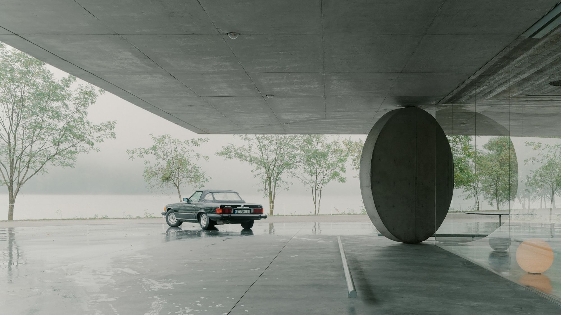 L’architecture se réduit à quelques éléments précis. Une dalle de toiture en béton armé repose sur quatre supports : un volume cylindrique abritant les sanitaires, un bloc carré regroupant les espaces techniques et deux colonnes élancées qui semblent porter plus de lumière que de charge. Entre eux, de vastes baies vitrées et des ouvertures forment un espace d’accueil à 360 degrés où intérieur et extérieur se fondent harmonieusement.