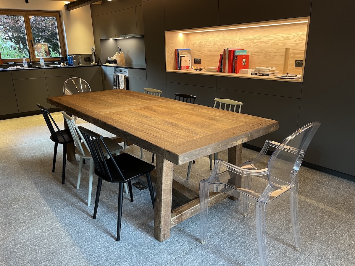 Chaque projet Follos Design est réalisé sur-mesure, qu’il s’agisse d’une table de ferme, d’une table monastère, d’une grande table familiale, d’une console ou d’une table de salle à manger contemporaine.