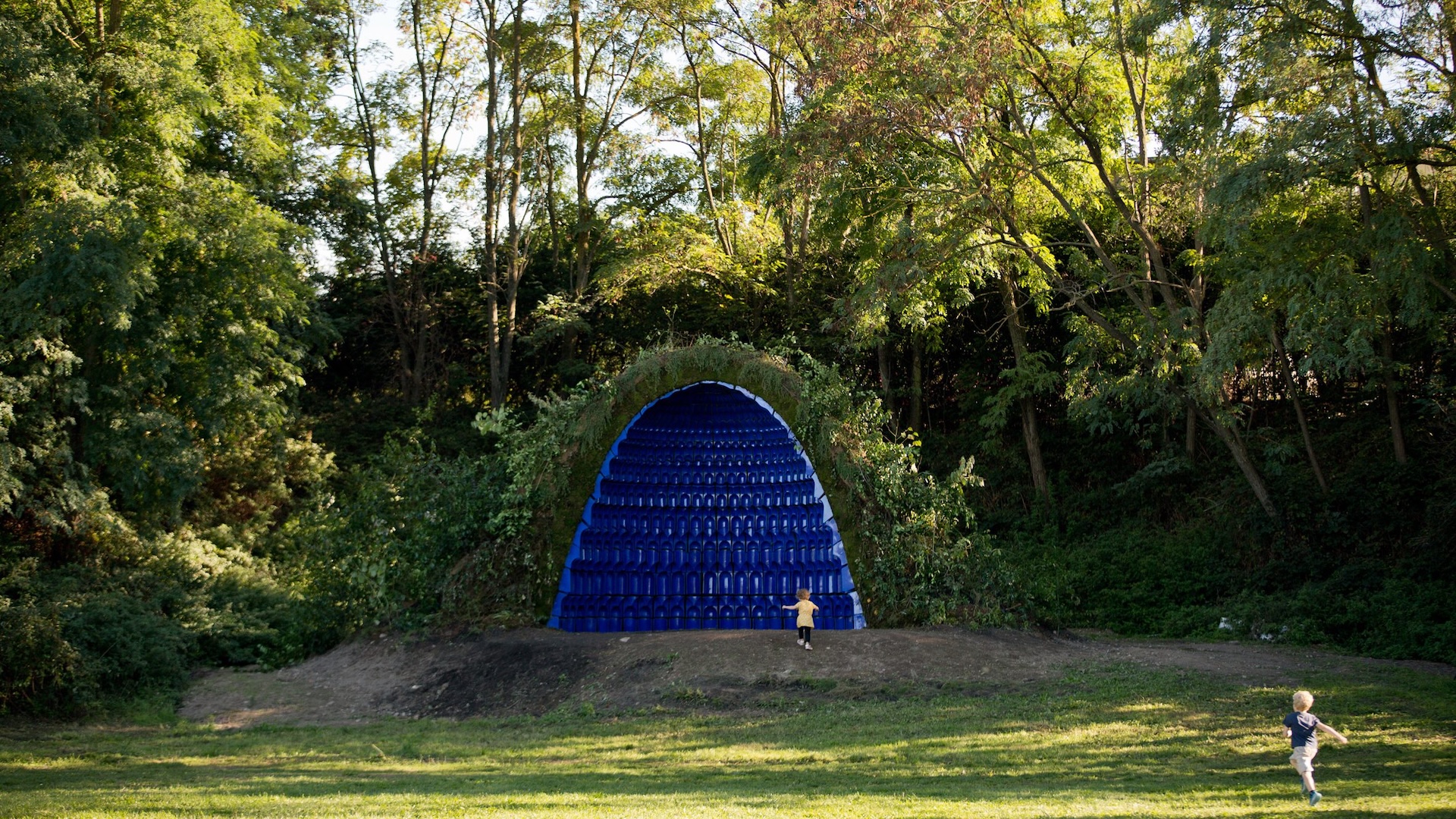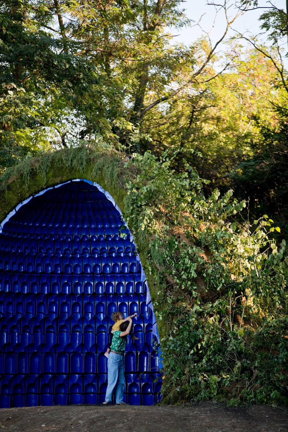 Ces blocs ont été empilés pour former une structure autoportante, puis recouverts de terre et de végétation. Le pavillon suit la logique d’une arche caténaire, une forme efficace qui répartit naturellement le poids tout en offrant à la fois intimité et ouverture. Cette géométrie a permis de créer une structure unique et continue qui est à la fois mur, toit et habitat.