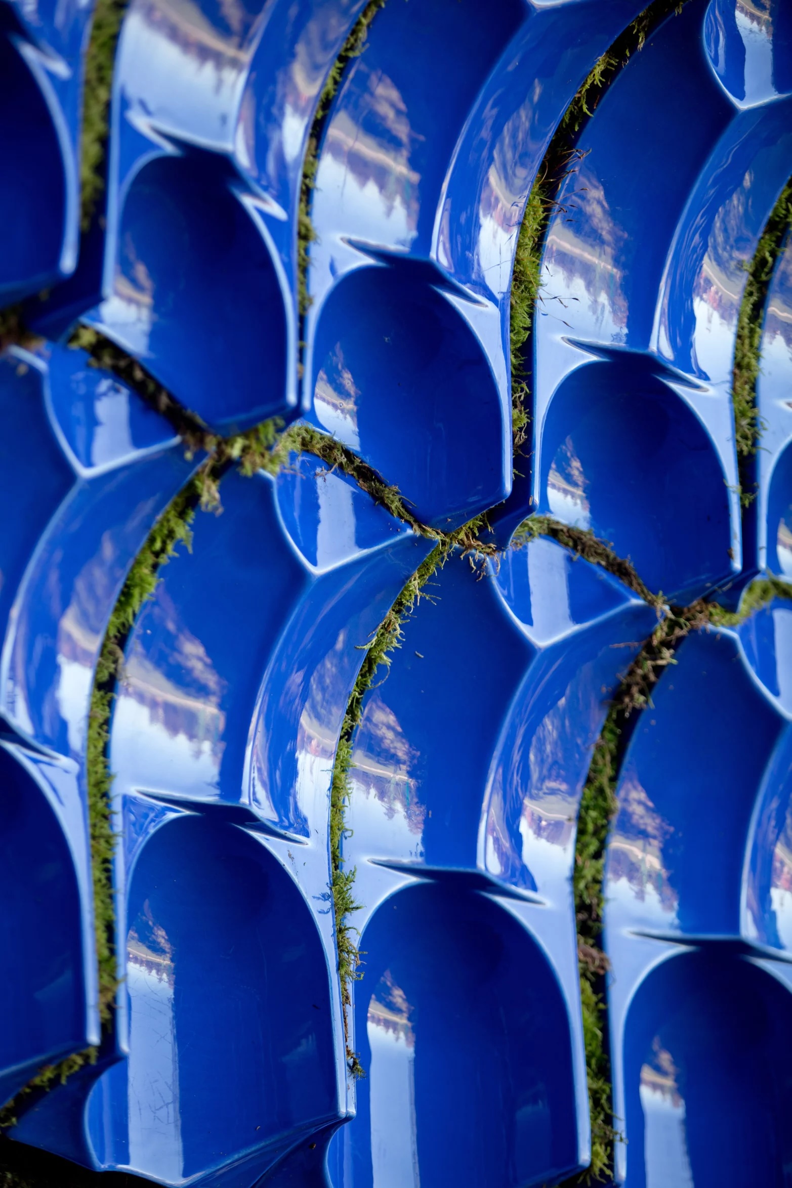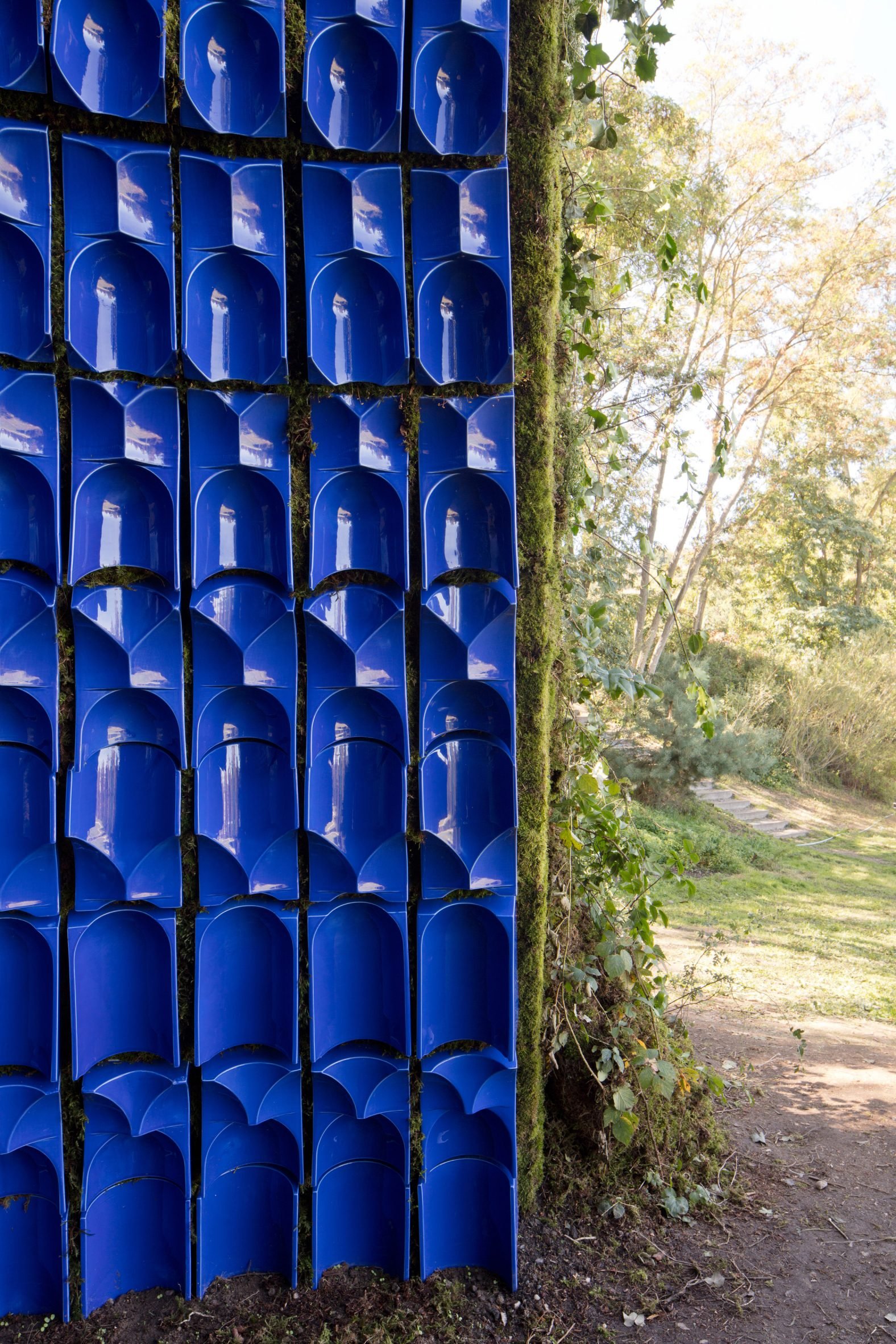 Le pavillon a été conçu à l’aide d’outils de calcul paramétriques et construit à partir de carreaux de céramique bleu profond, collés sur du béton pour former des blocs.