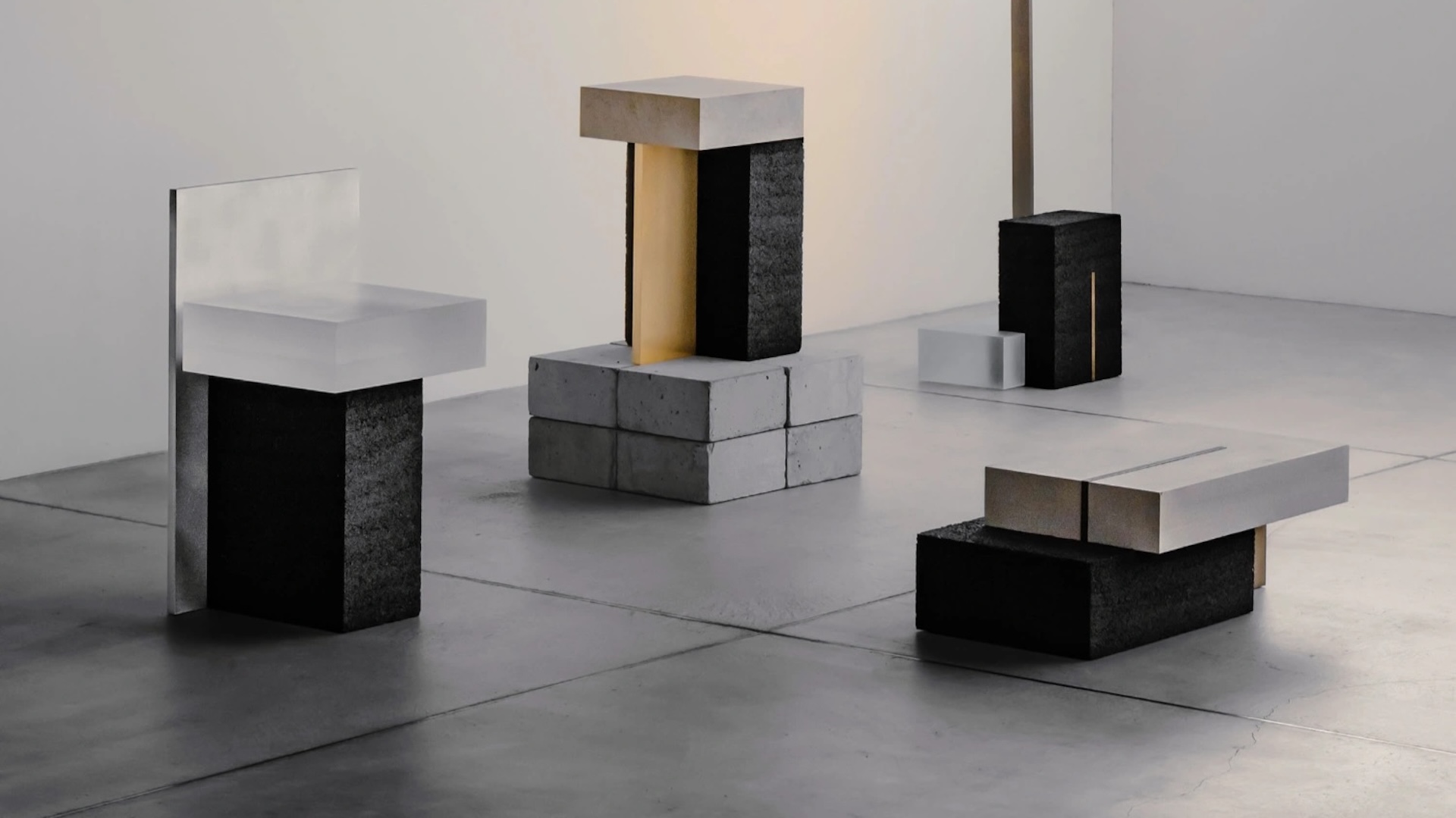 Sur les tabourets, les tables et les luminaires, des volumes de pierre, de métal, de résine et d’asphalte s’entrecroisent avec une sorte d’étrangeté délibérée, comme si l’on avait demandé aux matériaux de faire un compromis.