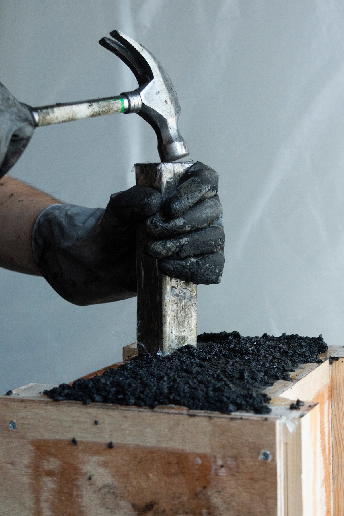 Ce qui distingue cette série, c’est une conscience aiguë de la matière. Koizumi conçoit la fabrication non comme un simple assemblage, mais comme un acte créateur : il façonne l’asphalte à la main, affinant sa texture par de multiples essais.