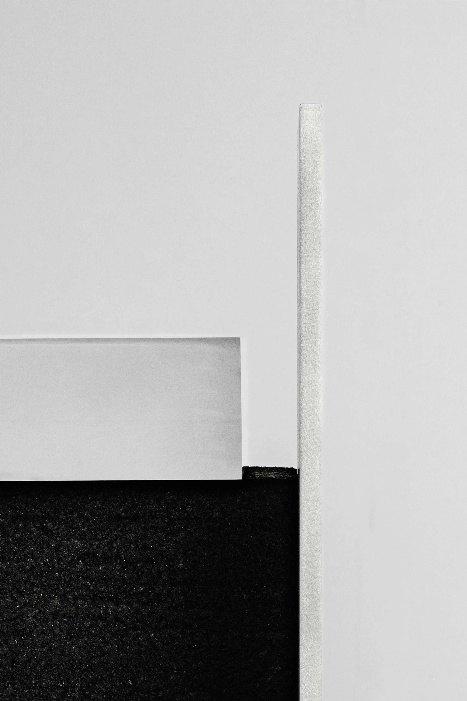 Les compositions semblent presque architecturales : des masses empilées, une tectonique décalée, des plans froids contrastant avec des blocs noirs poreux. L’asphalte apparaît non comme une surface, mais comme une structure : un ancrage fondamental qui à la fois ancre et met en valeur les éléments plus raffinés qui reposent dessus. Dans la lumière apaisante de la galerie, ces contrastes se lisent comme de lents dialogues spatiaux.