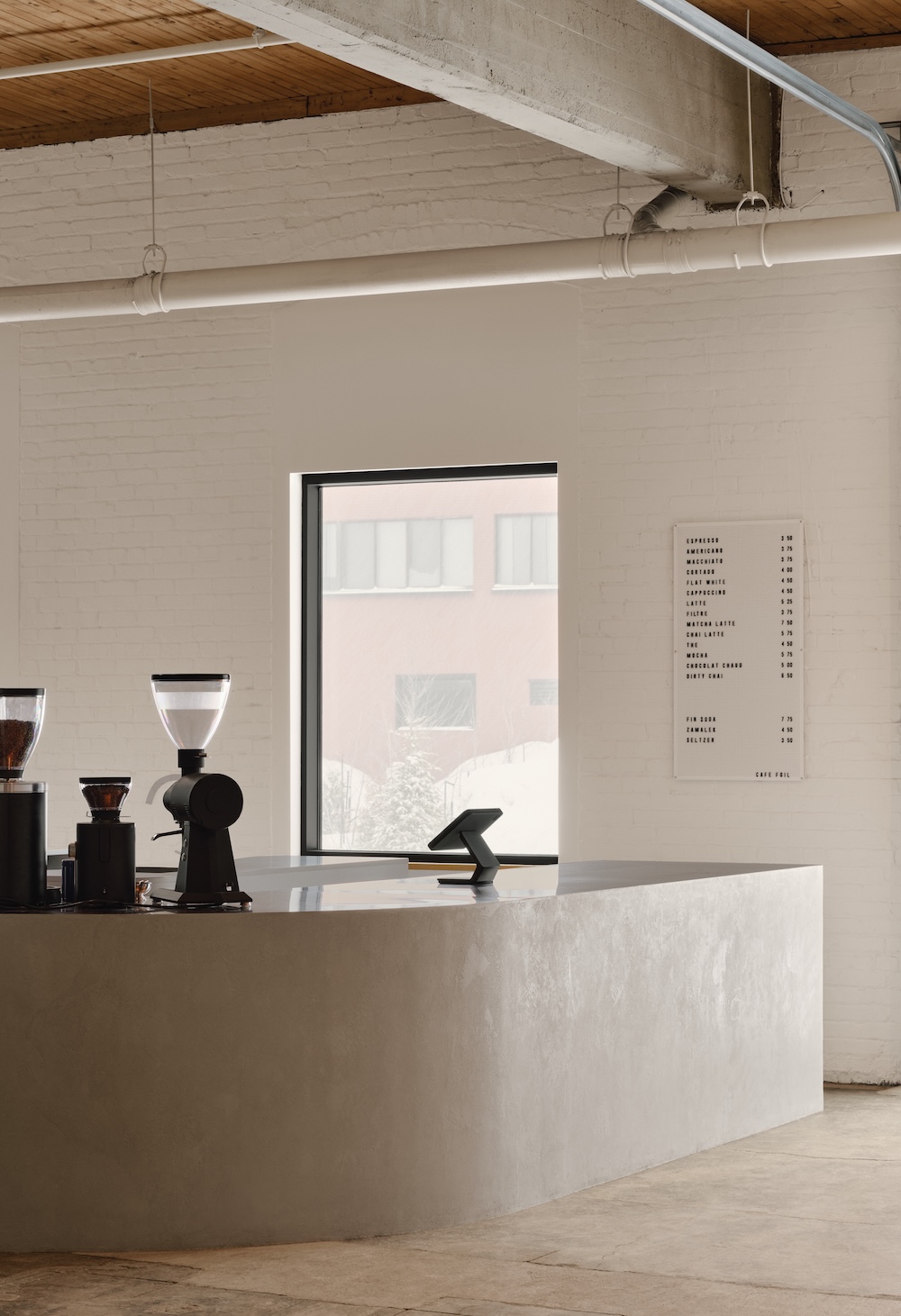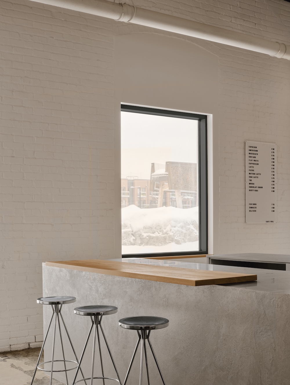 À l’avant de l’espace reconverti, le café lumineux s’ouvre sur le Parc des Gorilles par une grande porte de garage vitrée, accueillant les visiteurs dans une atmosphère à la fois brute et raffinée. Le comptoir courbe, aux lignes douces et minimalistes, est recouvert d’un enduit de microciment artisanal qui évoque la continuité avec la matérialité du lieu. À l’arrière, une salle de projection fermée offre un cadre intime pour les œuvres audiovisuelles et les événements immersifs. Le mobilier sur mesure du café, conçu par le designer montréalais Raymond Raymond, introduit une chaleur sobre et fonctionnelle qui contraste avec la rigueur de la structure existante. Le volume central de métal accueille un espace de travail et de rencontre, meublé d’une grande table de l’ébéniste Essai Mobilier et de chaises danoises Vipp, affirmant une esthétique épurée, à la croisée du design local et des références intemporelles.