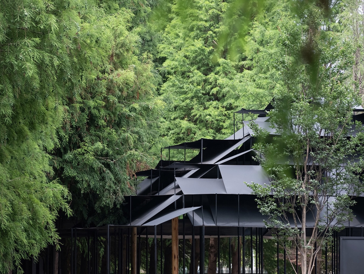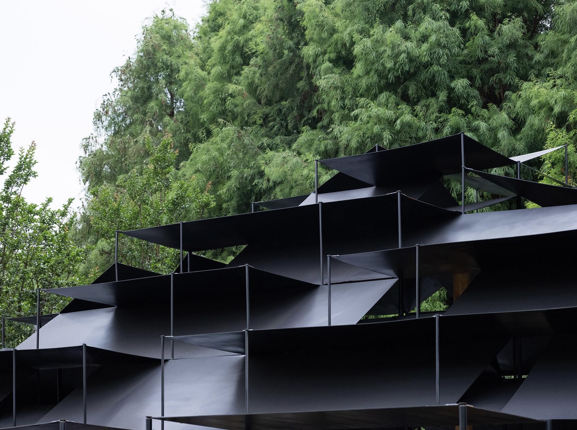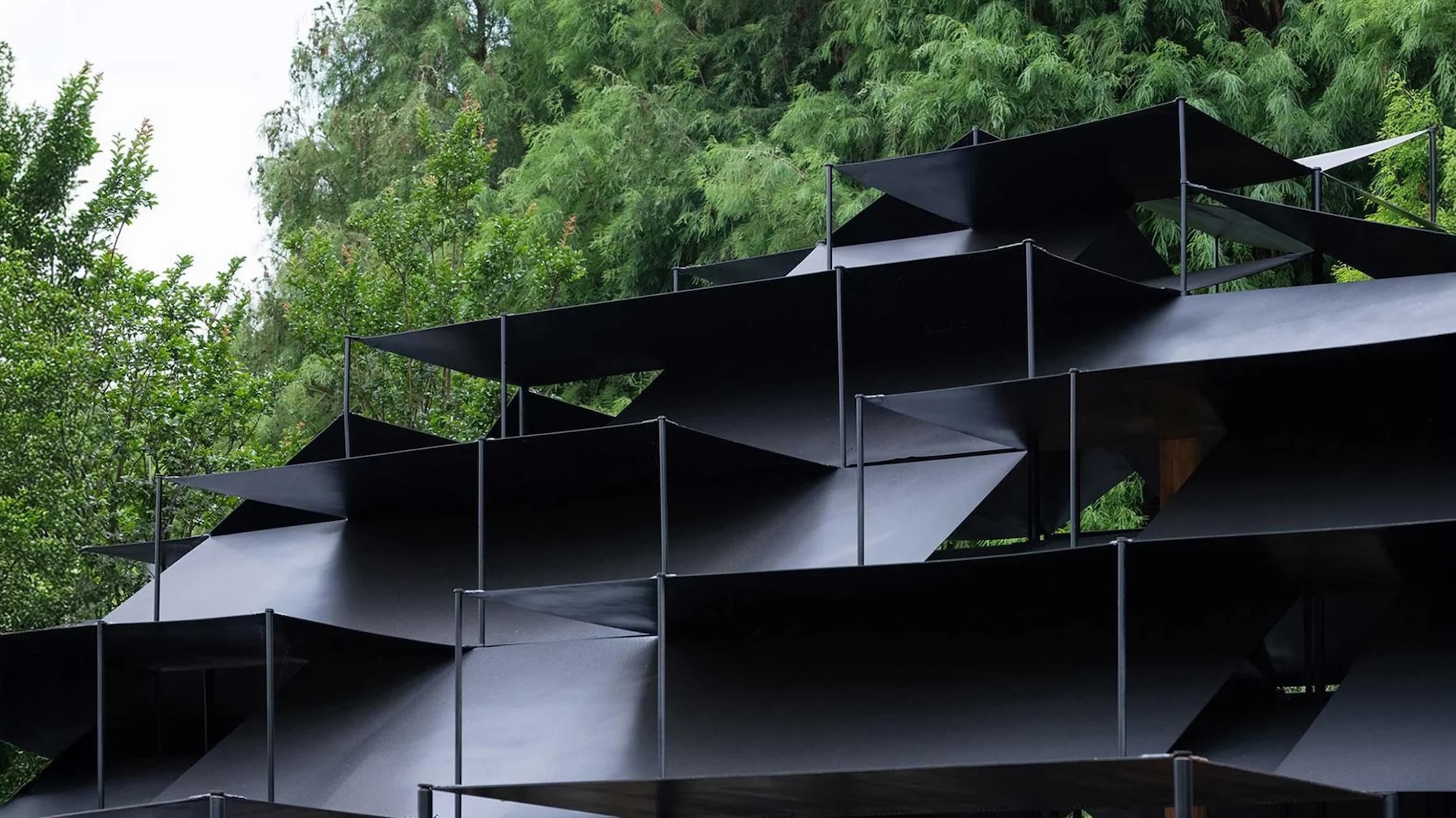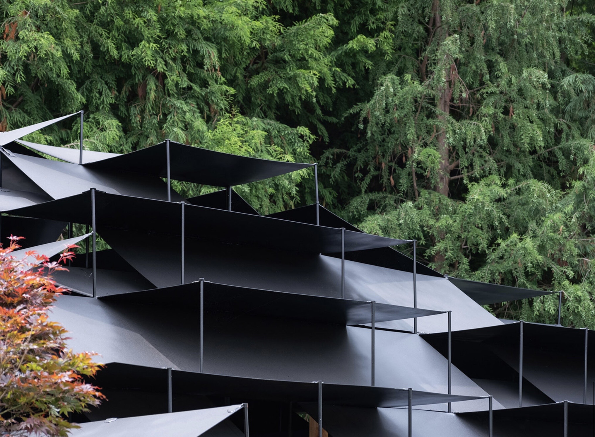Cette technique permet de dématérialiser subtilement l’acier massif, son aspect industriel cédant la place à une illusion d’ombre profonde et à l’apparence d’un toit de chaume vu de loin. En déconstruisant la toiture traditionnelle à quatre pans en ces strates fragmentées, le pavillon atteint une remarquable légèreté visuelle.