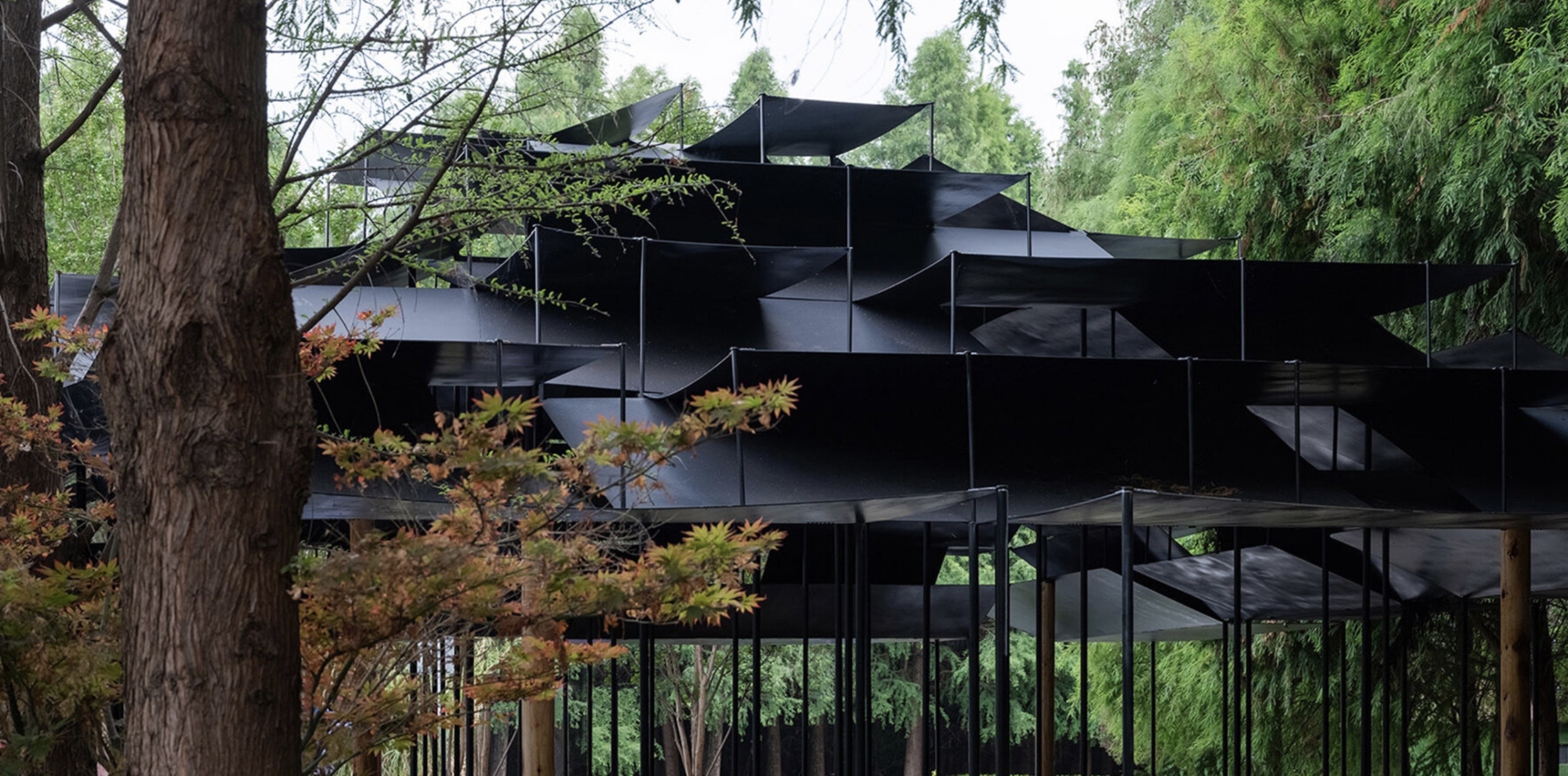 Cette intention architecturale se manifeste par une composition saisissante de 93 colonnes d’acier, chacune constituée d’une barre ronde pleine de 40 mm de diamètre, affleurant au sol et soutenant une toiture fragmentée et multicouche. Les architectes décrivent l’expérience qui en résulte comme une immersion poétique, brouillant avec subtilité la frontière entre l’artificiel et le naturel.