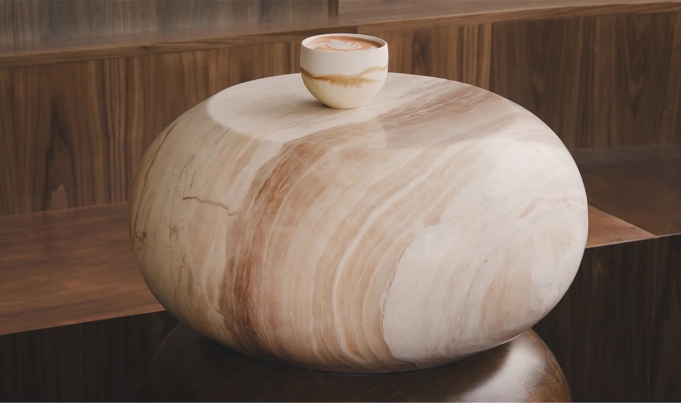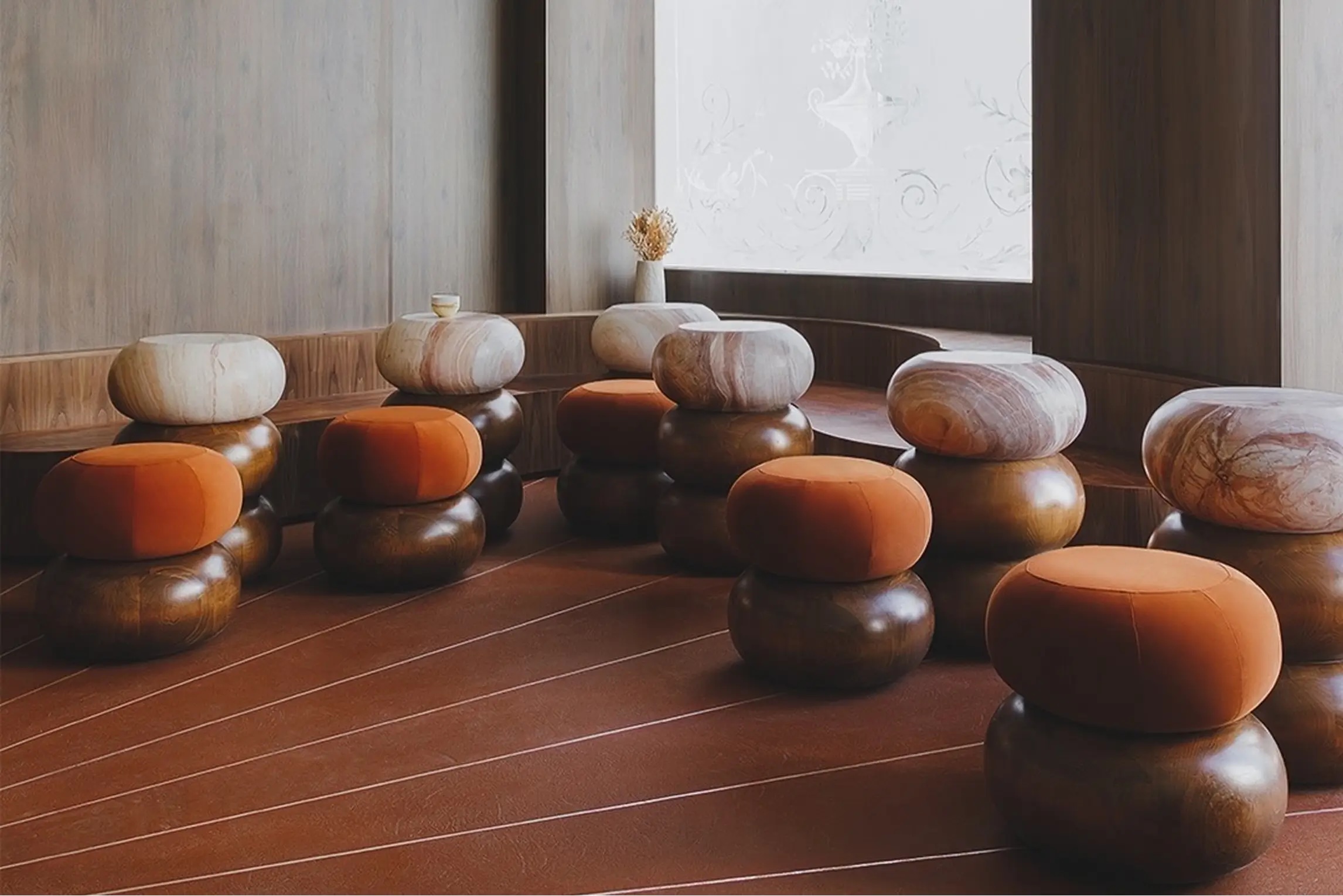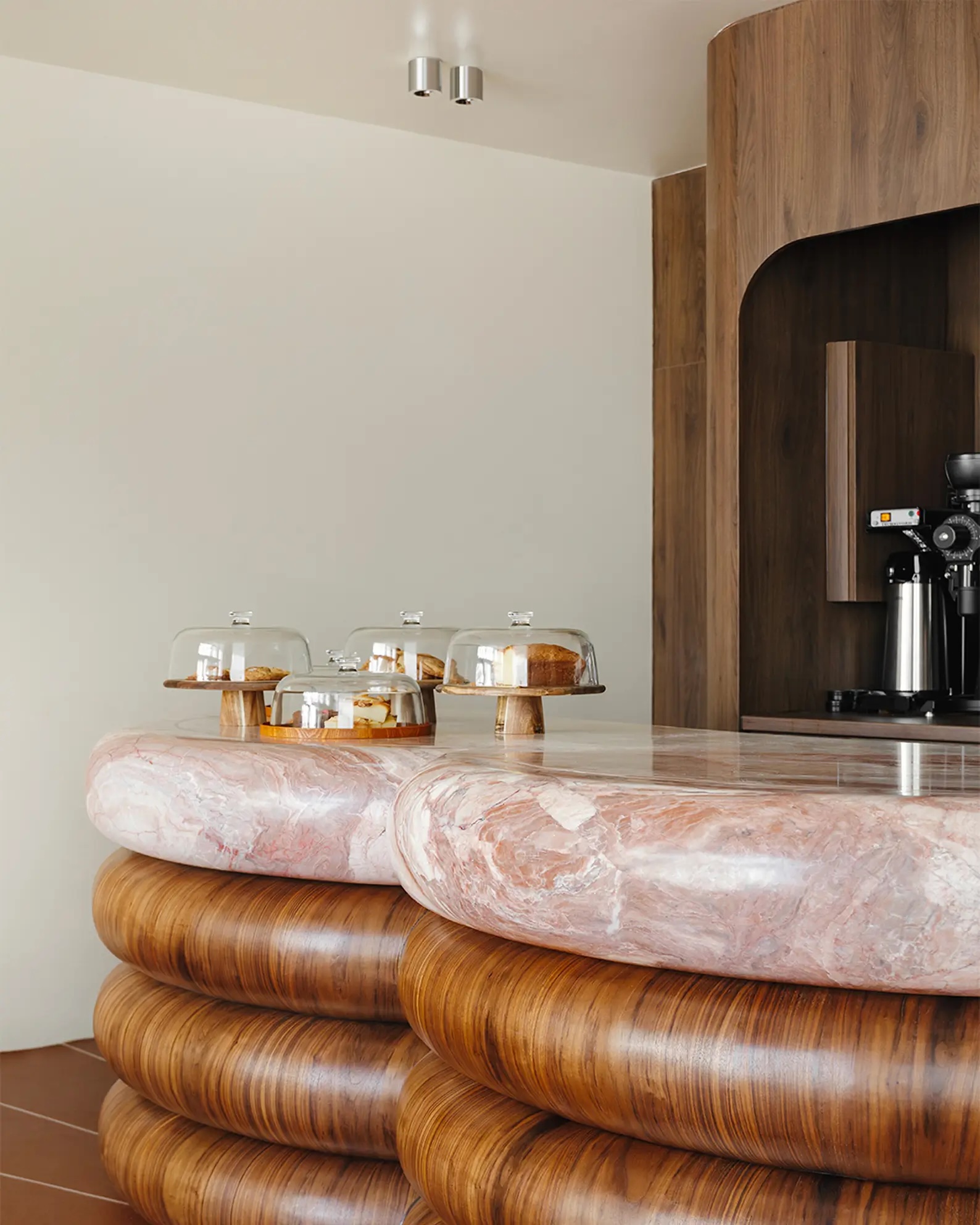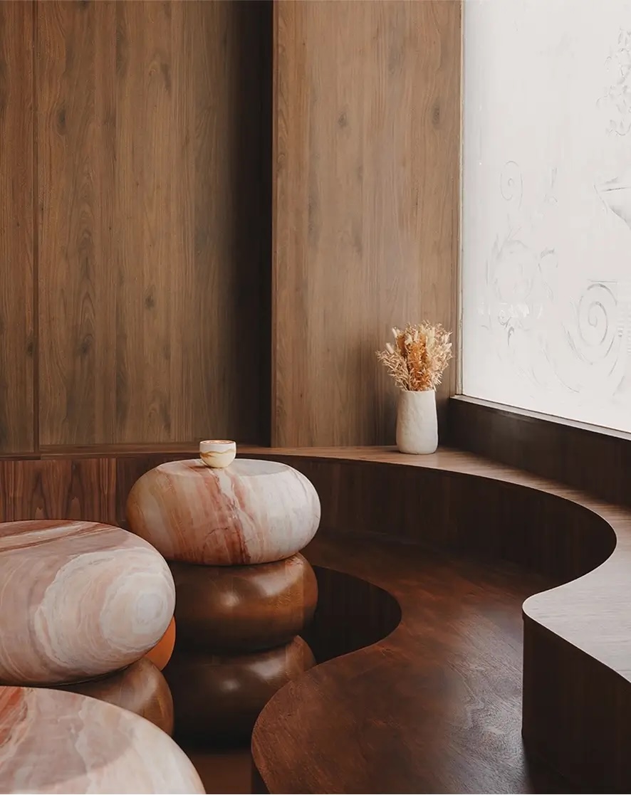 L’intérieur prolonge cette thématique avec un choix harmonieux de sièges, dont les formes superposées font écho au design du comptoir. Ces sièges sont confectionnés en marbre veiné, en bois chaleureux et agrémentés de coussins moelleux couleur orange brûlé. Chaque élément est réalisé avec une méticulosité extrême, insufflant une dimension artistique à l’expérience quotidienne de la dégustation d’un café.