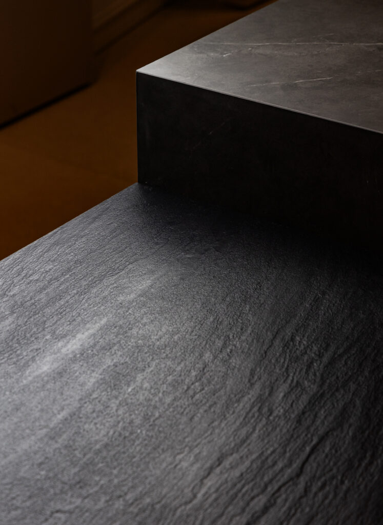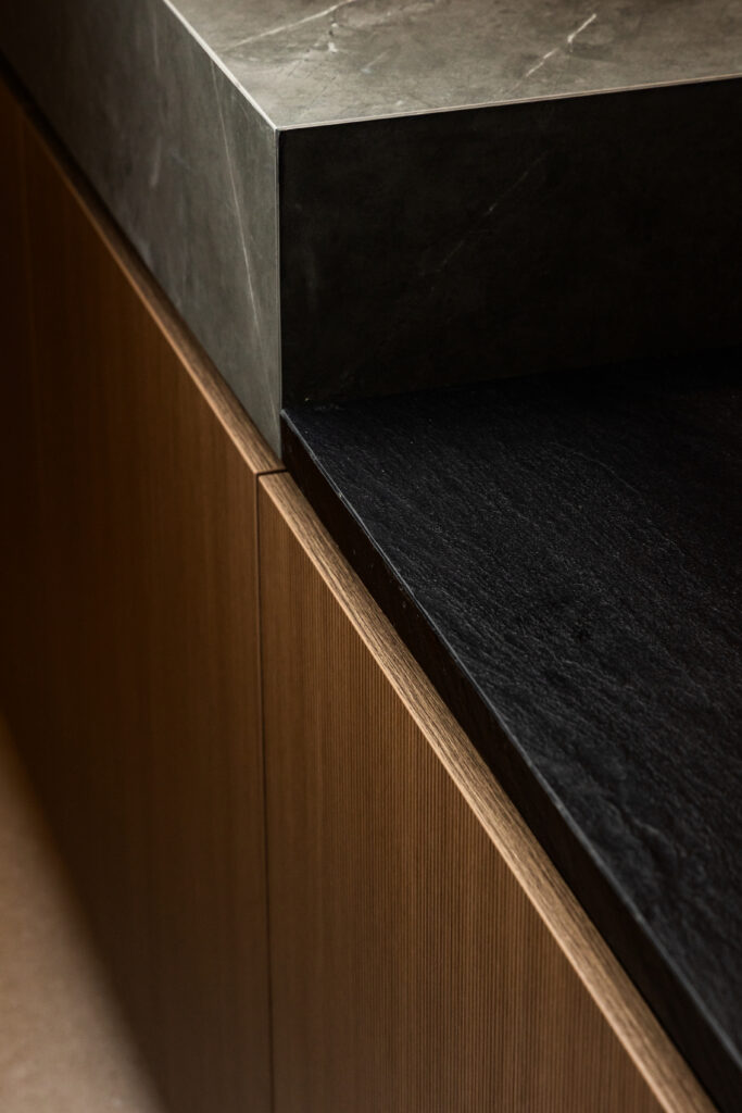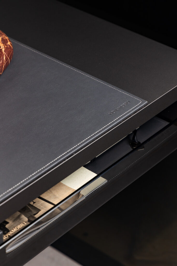 Ses lignes épurées, ses matériaux nobles et son ergonomie parfaite en font un point d’ancrage naturel autour duquel s’organise toute la dynamique de la pièce.