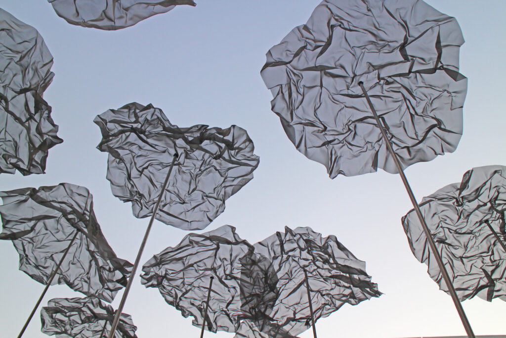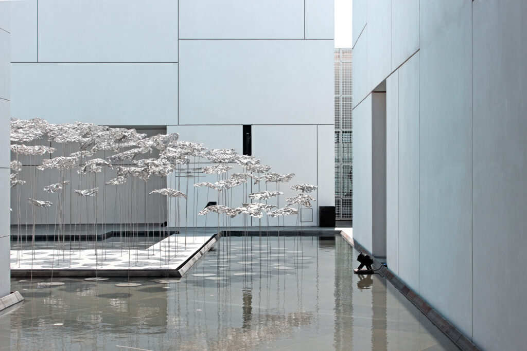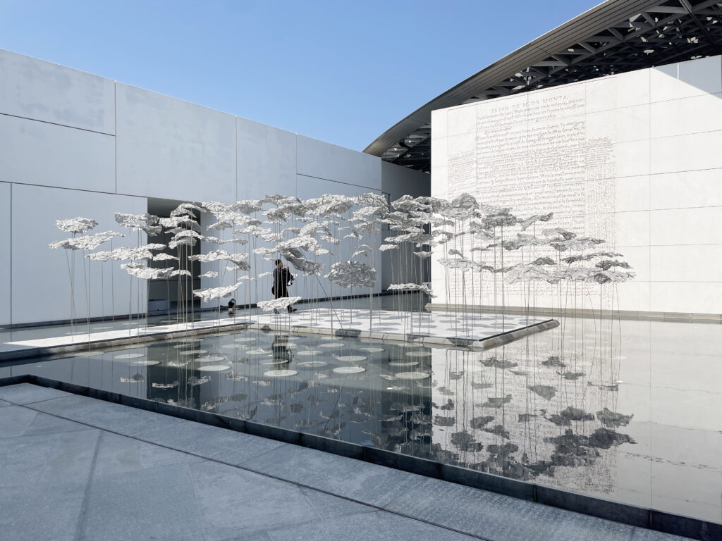En contraste avec la voûte géométrique du musée, cette structure légère danse au gré de la brise d’Abu Dhabi, projetant des ombres changeantes qui redessinent continuellement l’espace.