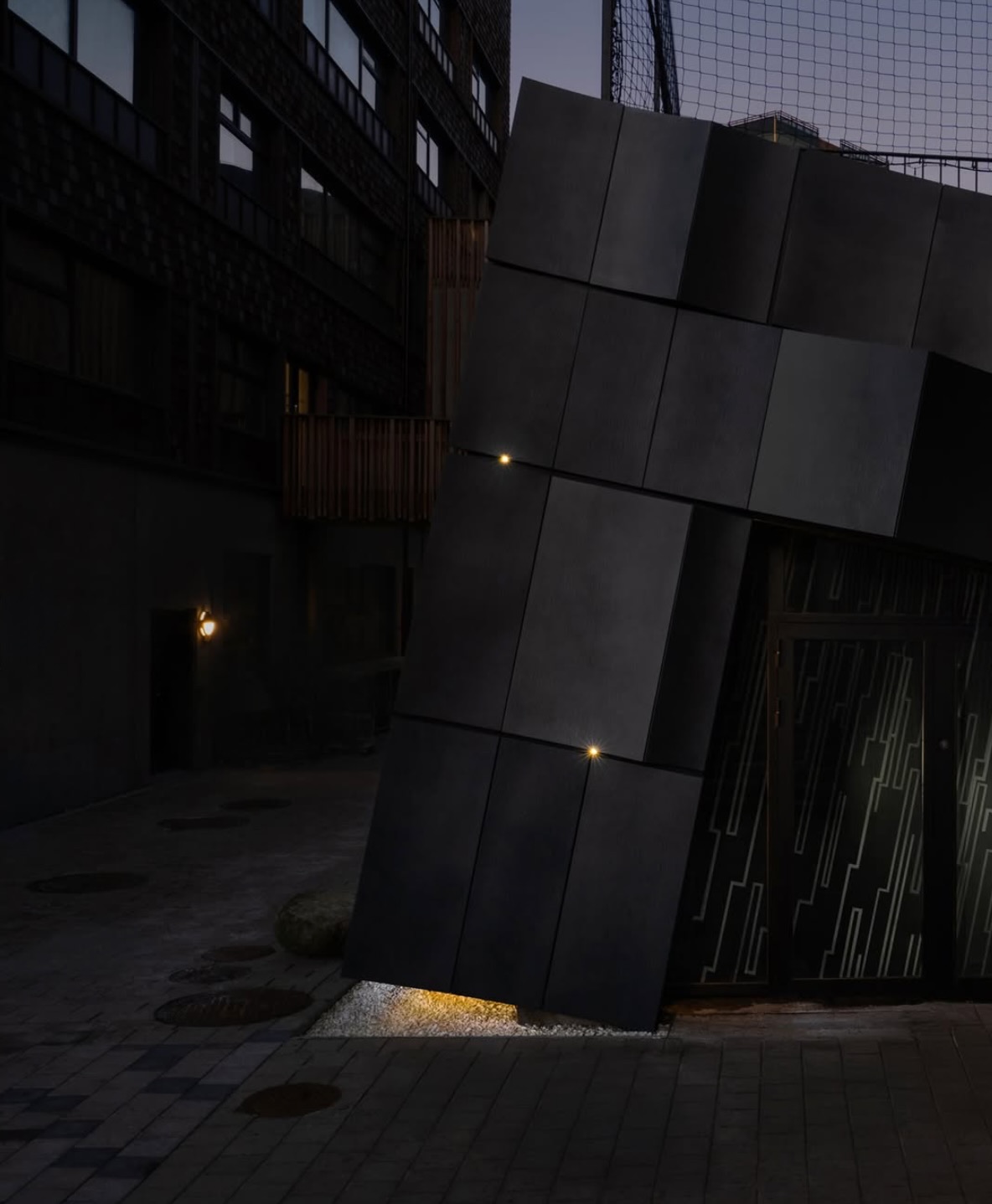 Au cœur d’un complexe d’habitations, le bâtiment sculptural descend vers un monde caché dans la roche. L’entrée se dresse comme un monolithe, à la fois architecture, artefact et œuvre de science-fiction. Son origine et son époque restent incertaines.