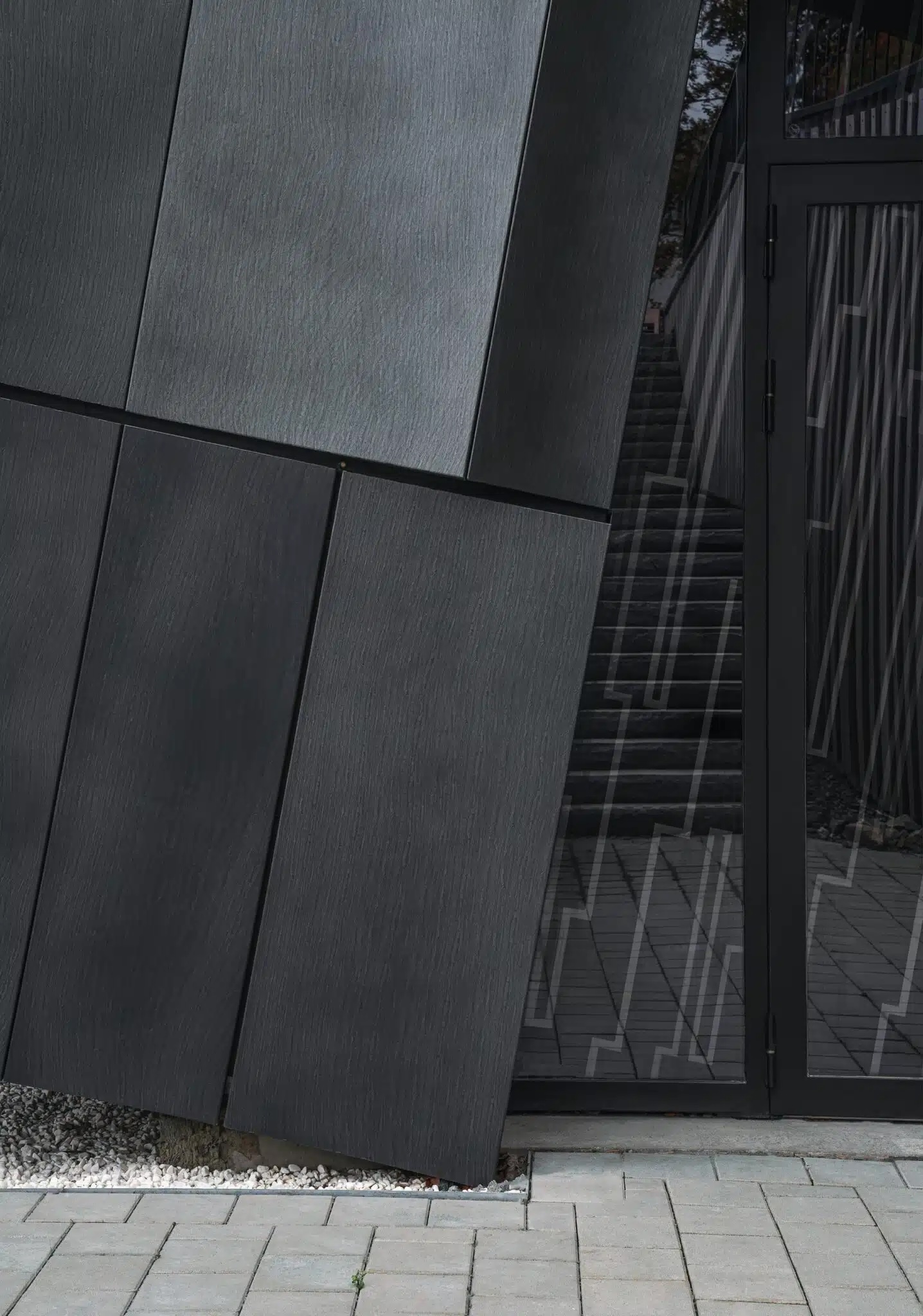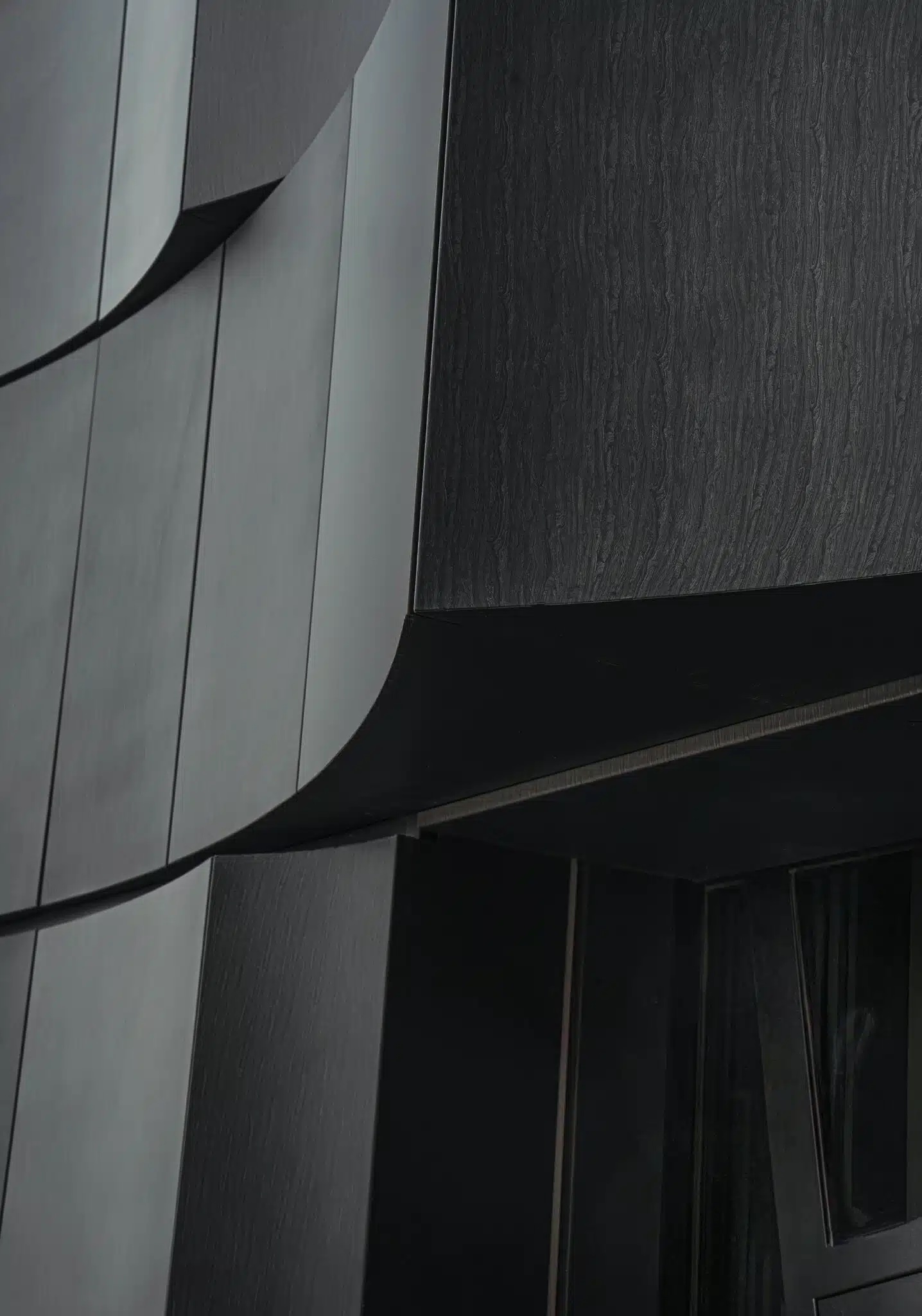 La façade du bâtiment est composée de cassettes métalliques sur mesure, ou dalles, fabriquées au millimètre près grâce à la production numérique et soigneusement finies sur place. Chaque cassette est traitée par la technique d’impression par trempage dans un bain d’eau à 37 degrés, où un film à motifs se dépose en surface, créant un chatoiement subtil qui varie selon la lumière du jour.
