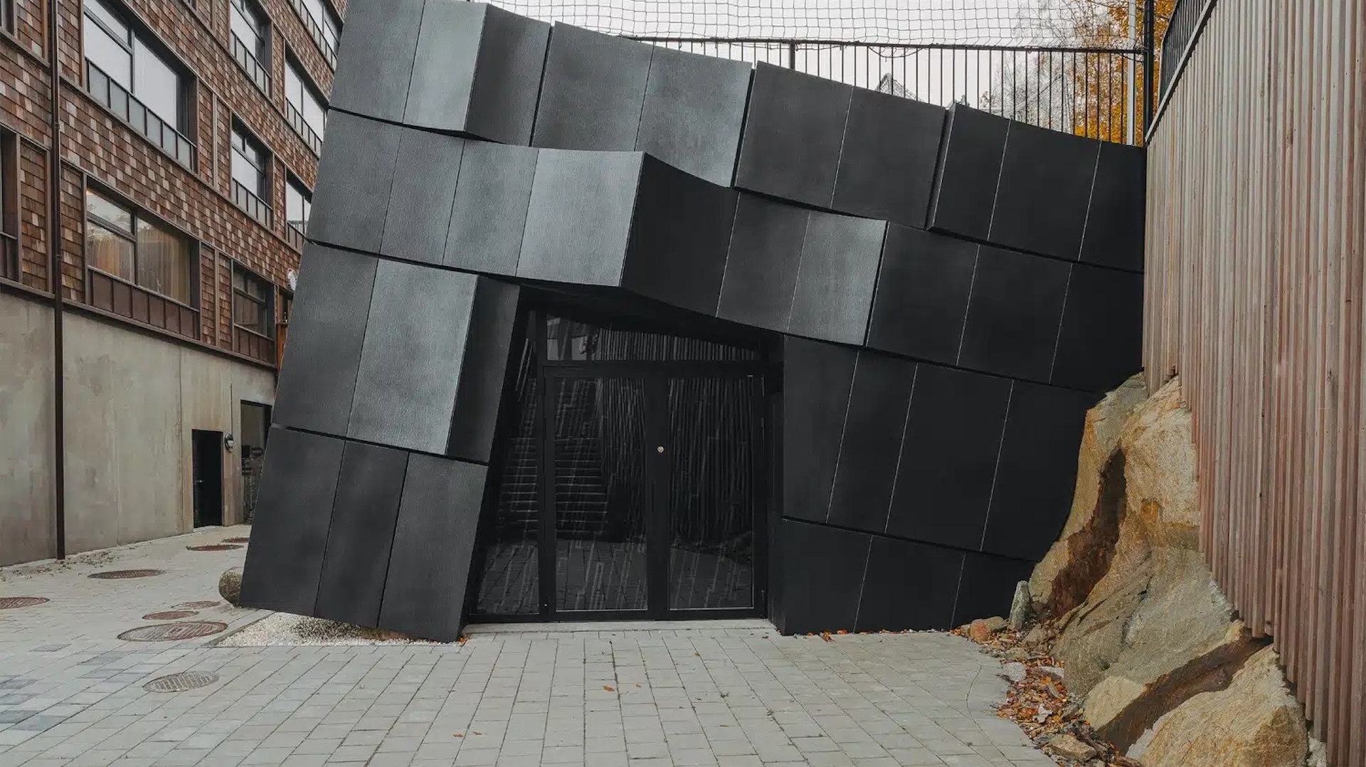 Au cœur d’un complexe d’habitations, le bâtiment sculptural descend vers un monde caché dans la roche. L’entrée se dresse comme un monolithe, à la fois architecture, artefact et œuvre de science-fiction. Son origine et son époque restent incertaines.