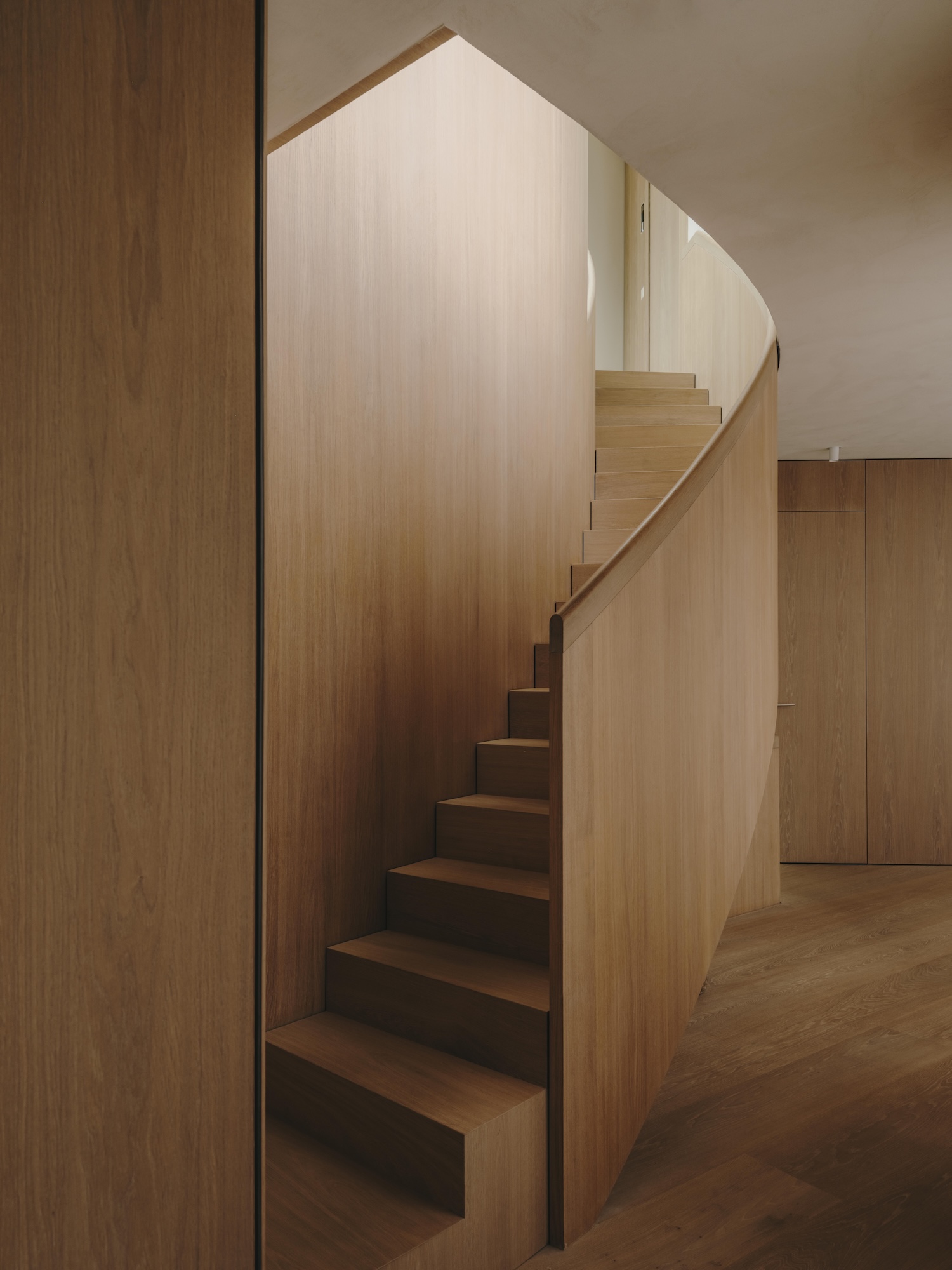 Tout l’éclairage est encastré, la plupart des meubles sont intégrés et les appareils électroménagers sont dissimulés derrière des portes en bois. Si les sols en béton ont été conservés, la façade et les verrières sont neuves, car toutes les fenêtres de ce bâtiment en L donnent uniquement sur la cour. L’apport de lumière naturelle depuis le toit est devenu essentiel, dictant la conception et la forme de l’escalier sculptural qui diffuse la lumière à travers tous les niveaux de la maison. Son bois correspond au chêne élégant utilisé pour les panneaux muraux et le mobilier.