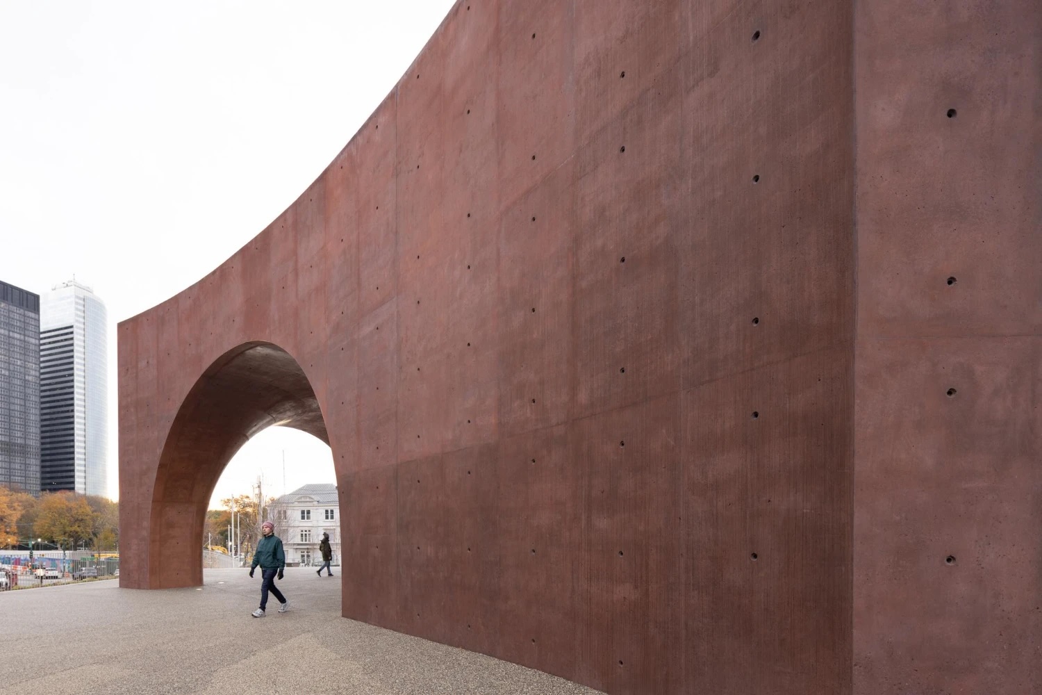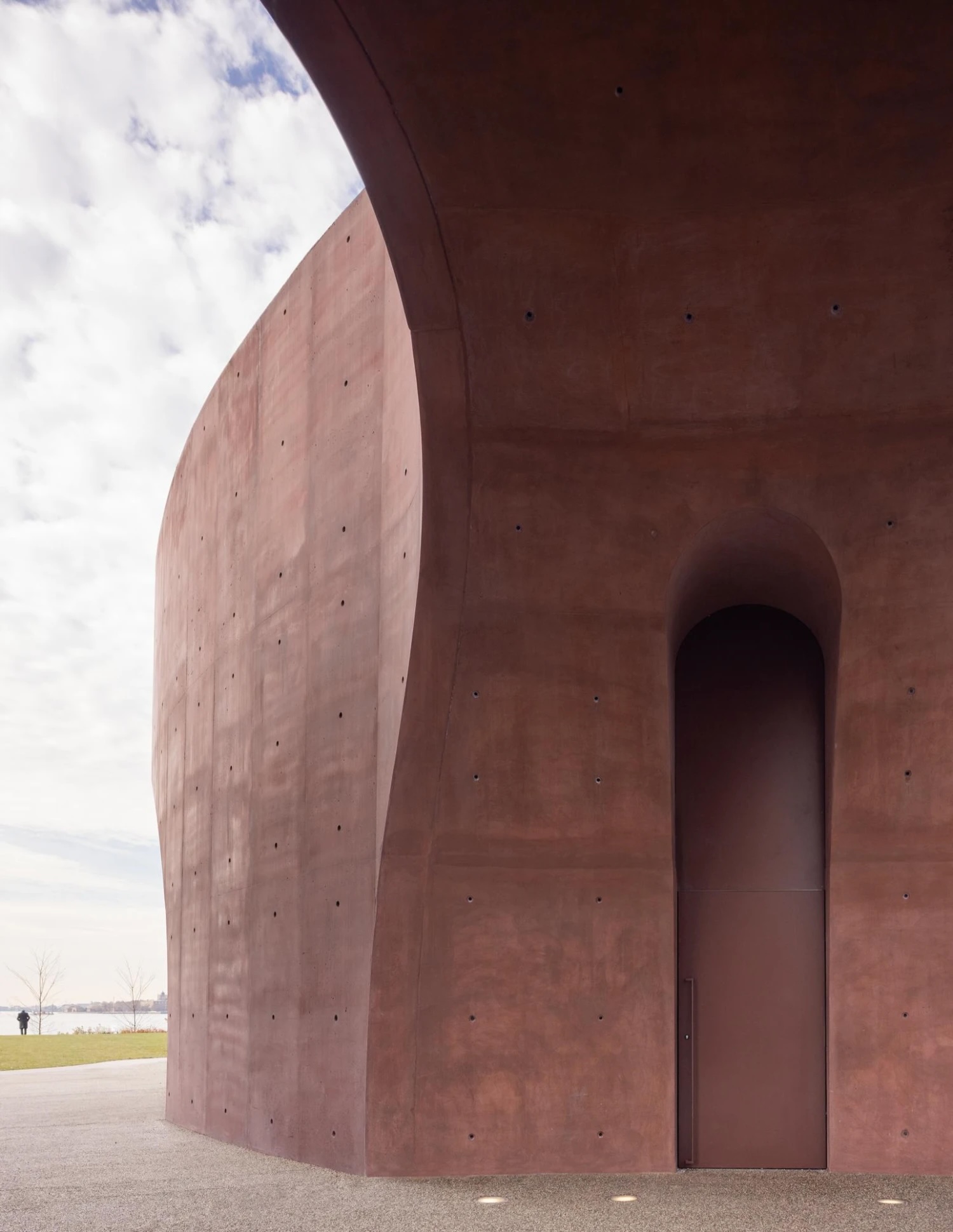 Une seconde approche, depuis l’esplanade au bord de l’eau, révèle un tout autre caractère : des rampes et des escaliers invitent le visiteur à s’élever le long de lignes adoucies et de perspectives changeantes. Ces parcours circulaires renforcent le rôle du bâtiment comme trait d’union entre le parc, la ville et le port. La lumière glisse sur les murs courbes, conférant au béton une souplesse surprenante – une impression amplifiée par les oculi qui ponctuent la façade, véritables îlots de respiration dans une surface par ailleurs continue.