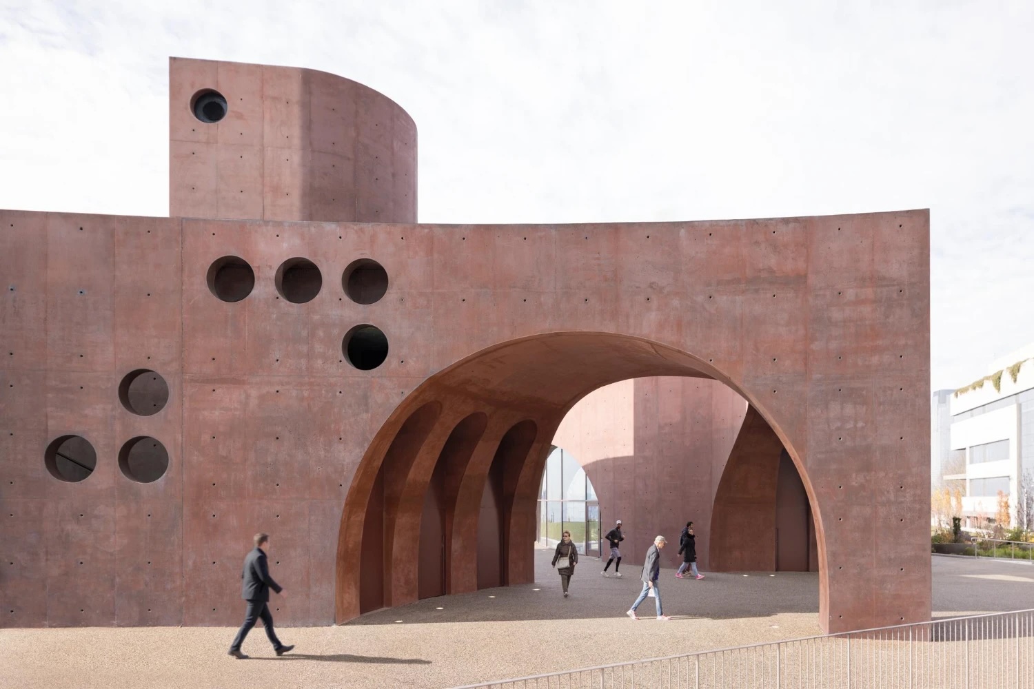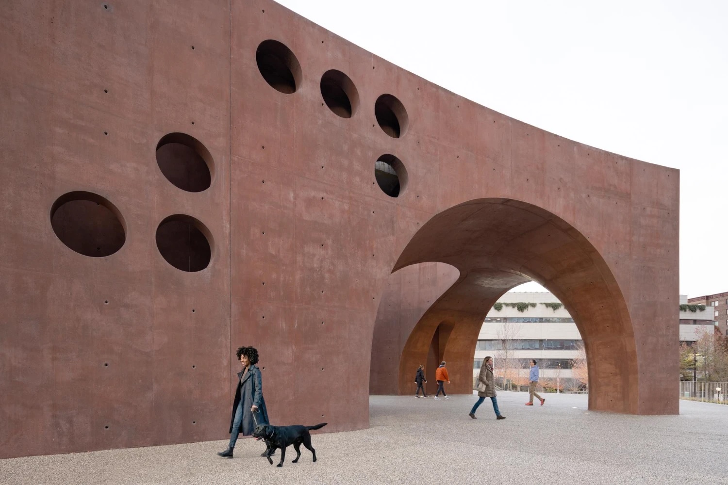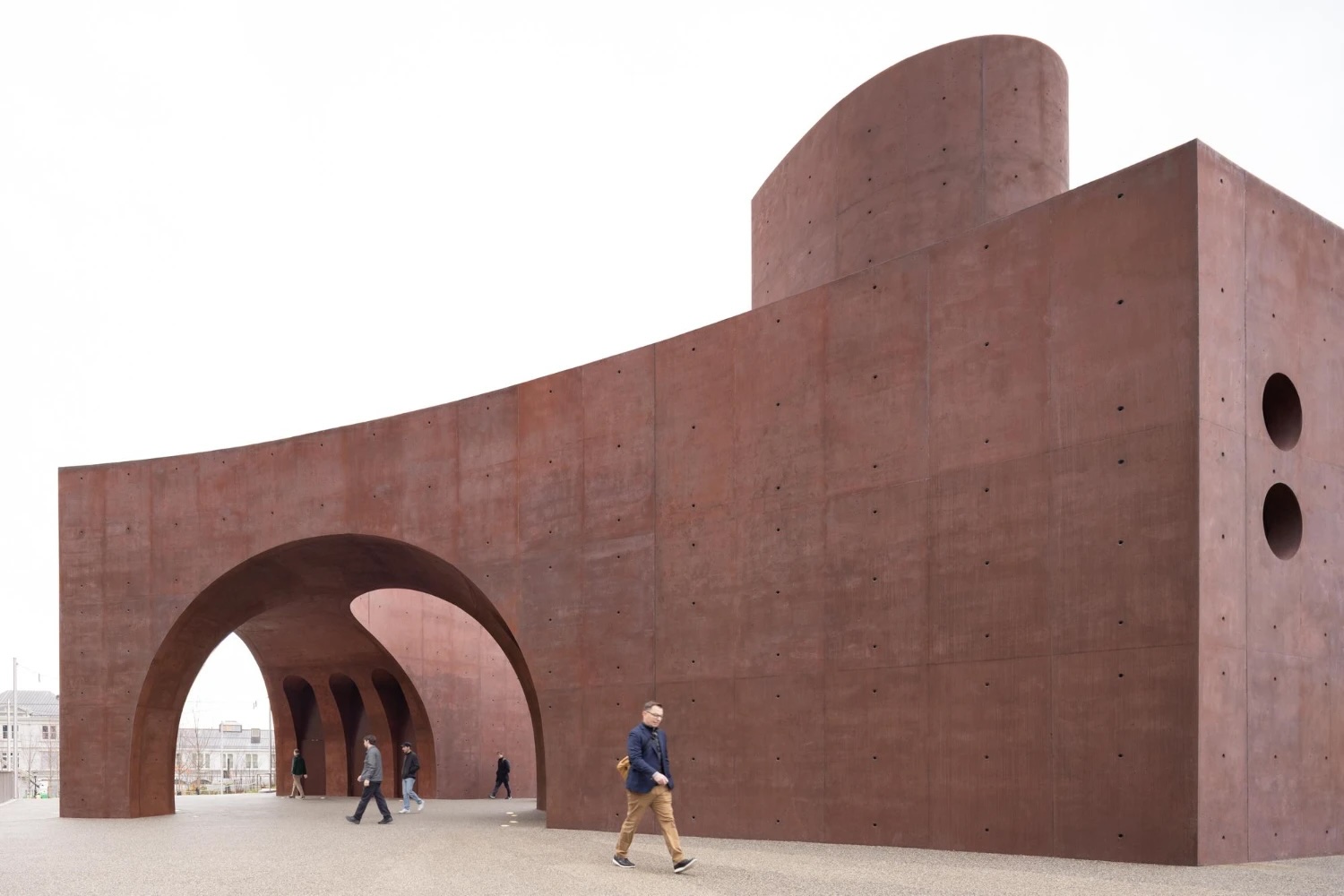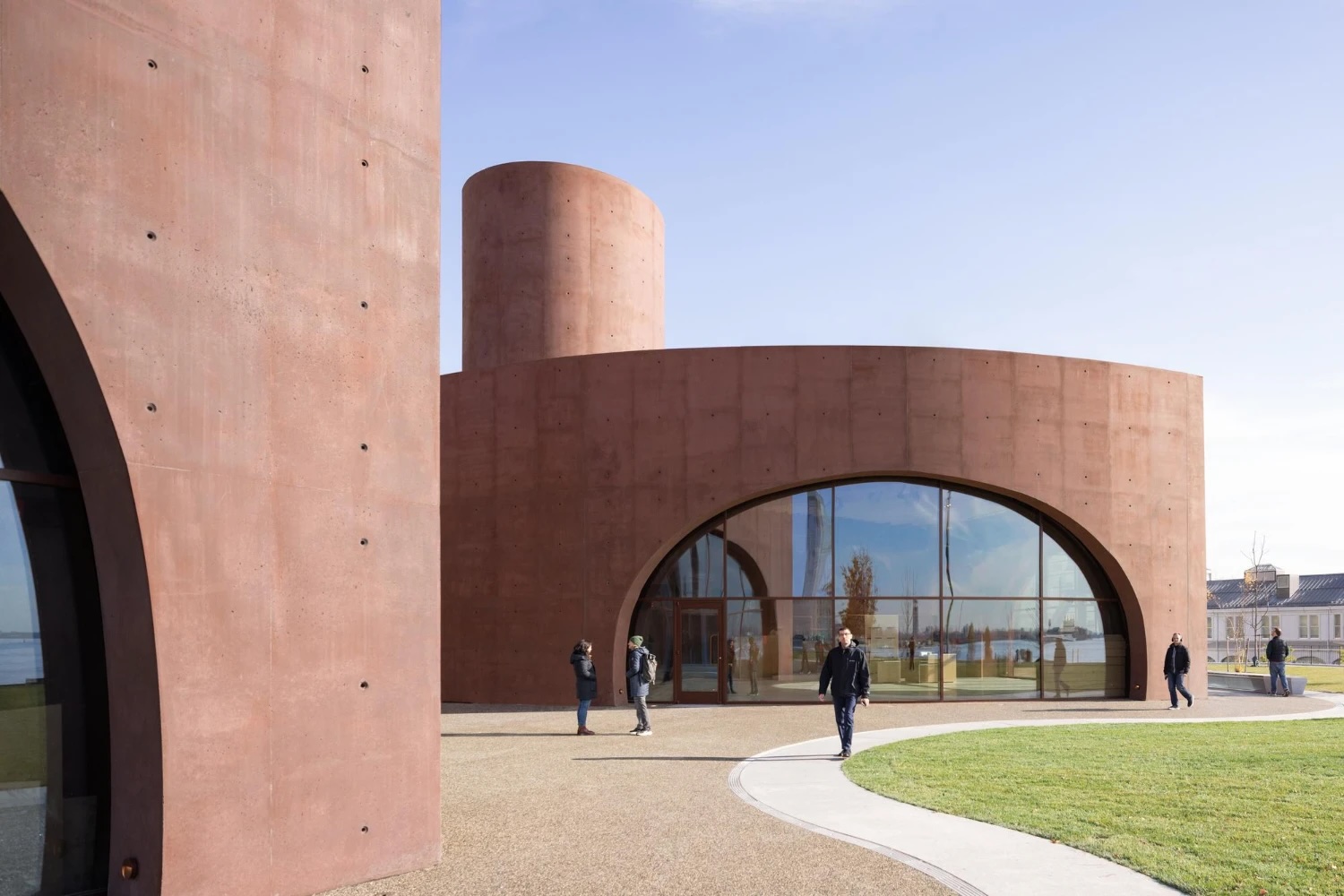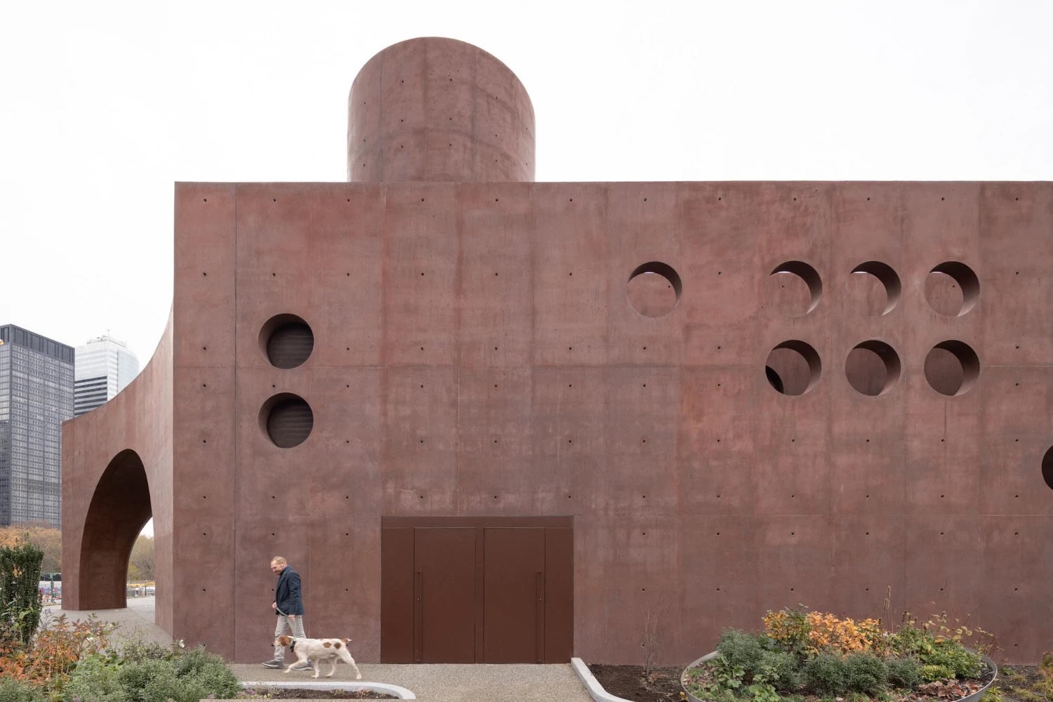 Le pavillon de Wagner Park, conçu par le studio Thomas Phifer à New York, émerge du sol avec une force tranquille, son béton teinté de rouge s’élevant en larges plans courbes qui semblent moins construits que sculptés par le vent côtier.