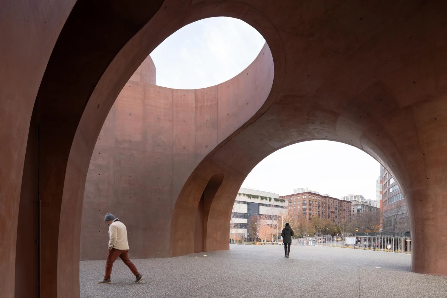 Sur la place d’entrée, de vastes voûtes rassemblent le public sous une canopée de béton qui semble presque une terre inversée. Les arches forment une porte d’entrée non seulement vers le parc Robert F. Wagner Jr., mais aussi vers une chorégraphie visuelle plus vaste. En passant sous la voûte centrale, la ville cède brusquement la place au ciel, au port et à l’herbe.
