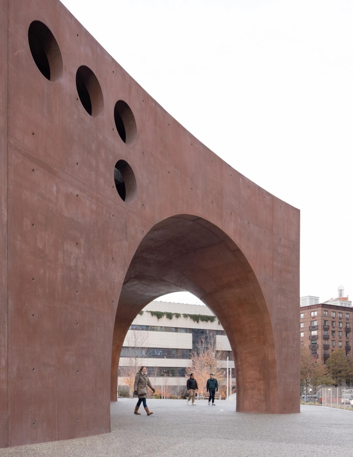 En arrivant par Battery Place, les visiteurs gravissent deux jardins en pente dont les allées d’arbres préparent le regard, par leur rythme, aux ouvertures étroites et aux arcs monumentaux de l’architecture. Le pavillon évoque les fortifications historiques du port de New York, s’imprégnant de leur masse et de la chaleur de leurs briques sans pour autant les reproduire fidèlement.