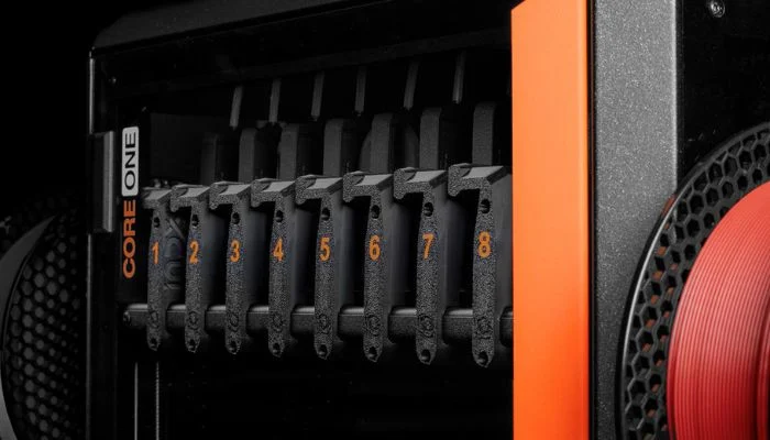 Mais ce qui est particulièrement intéressant est la mise à jour INDX dévoilée par Prusa lors du Formnext. Il s’agit d’une nouvelle architecture imaginée pour la Core One qui permet d’utiliser 8 bobines différentes en changeant rapidement et efficacement d’outils. L’utilisateur peut donc multiplier couleurs et matériaux plus facilement.