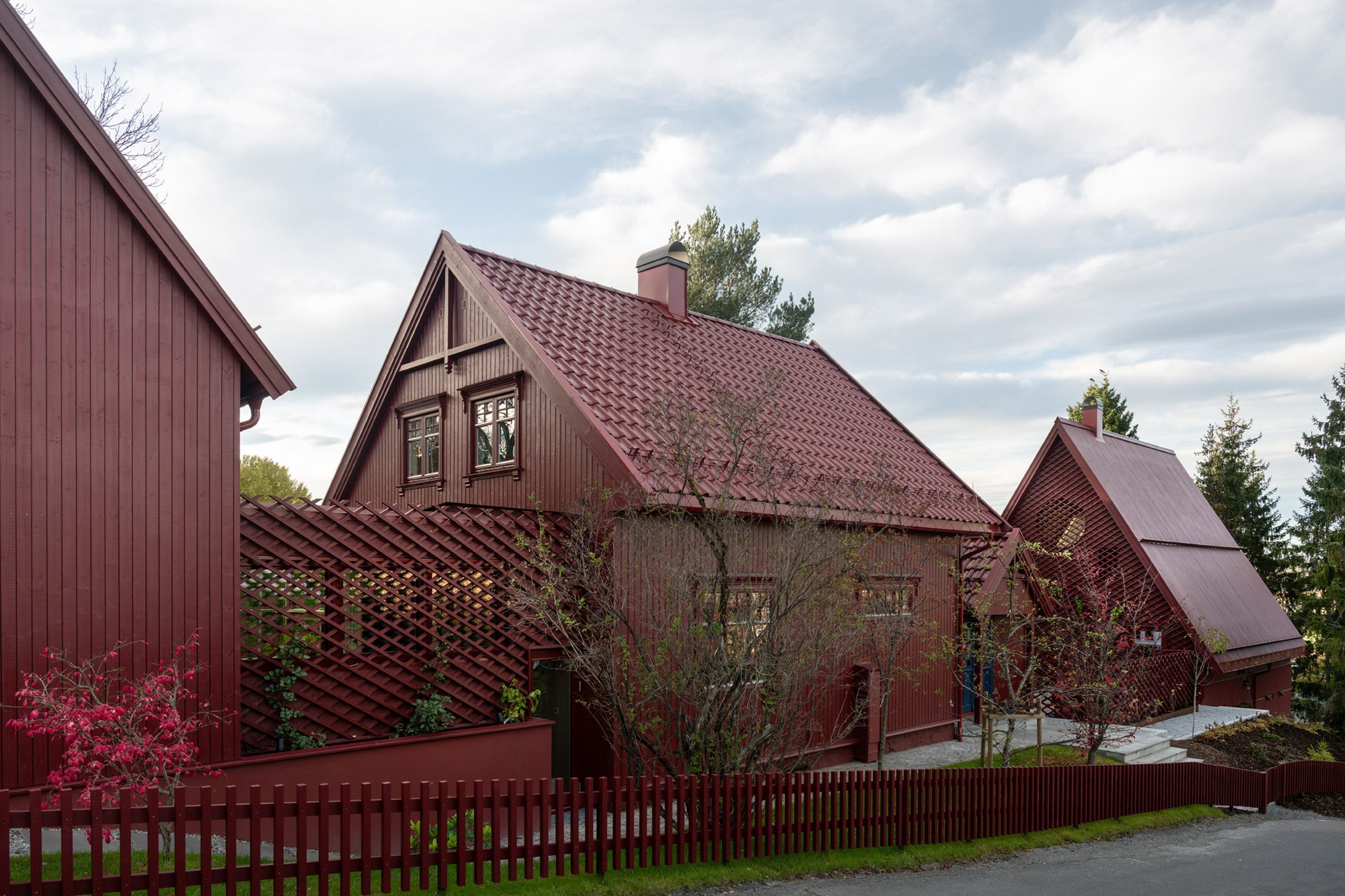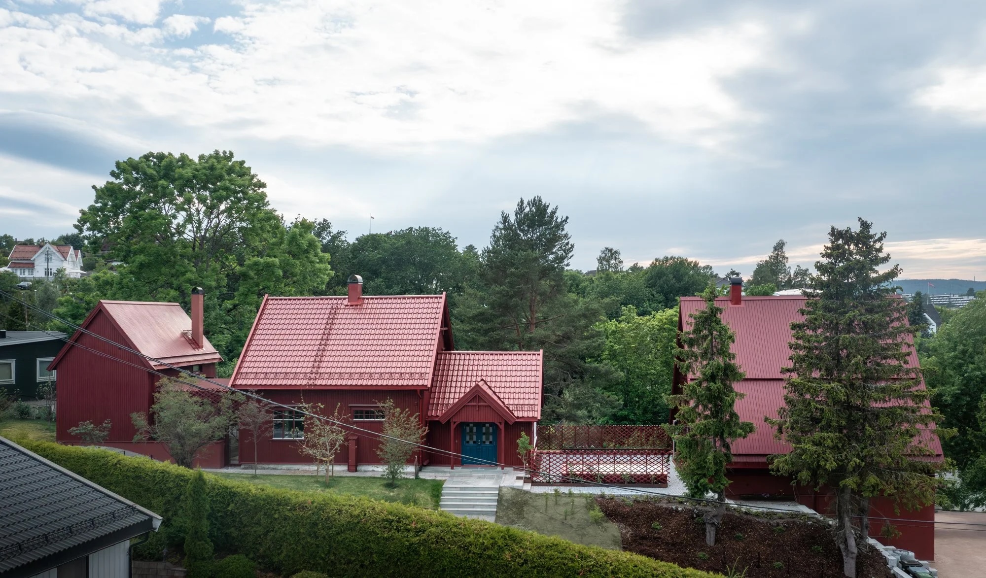 Le cabinet d’architecture Rever & Drage a agrandi une maison traditionnelle rouge à Raelingen, en Norvège, en y ajoutant deux volumes reliés par des espaces verts.