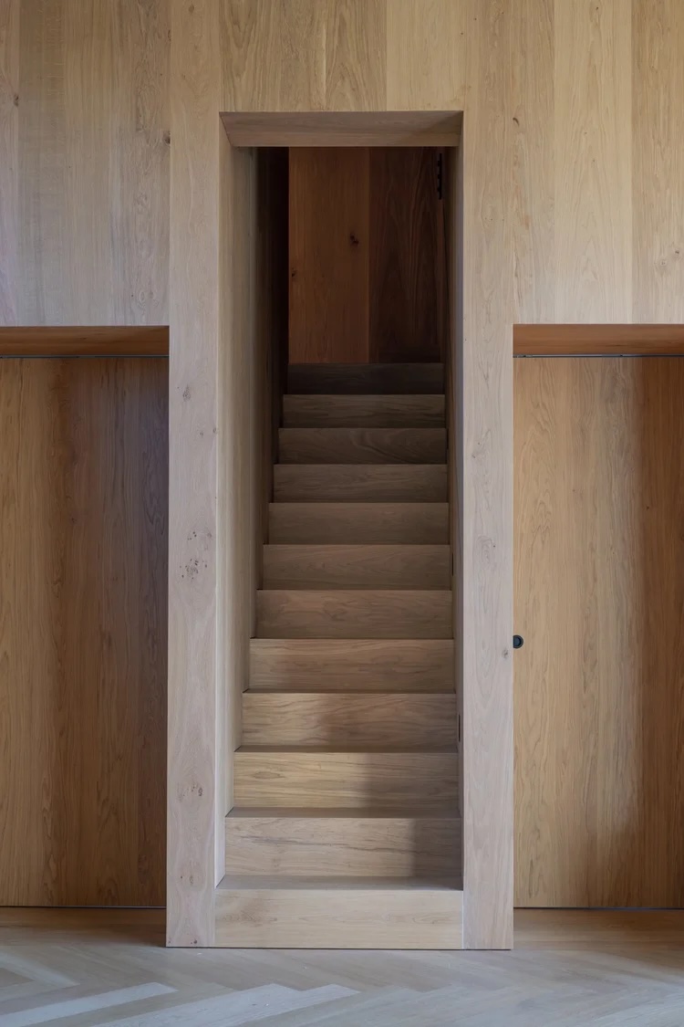 Le dialogue entre les bâtiments rouges et la verdure environnante évoque des associations nordiques intemporelles : la maison rouge dans la forêt, le cultivé et le sauvage, le domestique et le naturel. Un mur revêtu de chêne, conçu par le studio comme un élément solide dans lequel on s’immerge, mène à une chambre, une salle de bains, un bureau et un coin détente dans l’extension sud.
