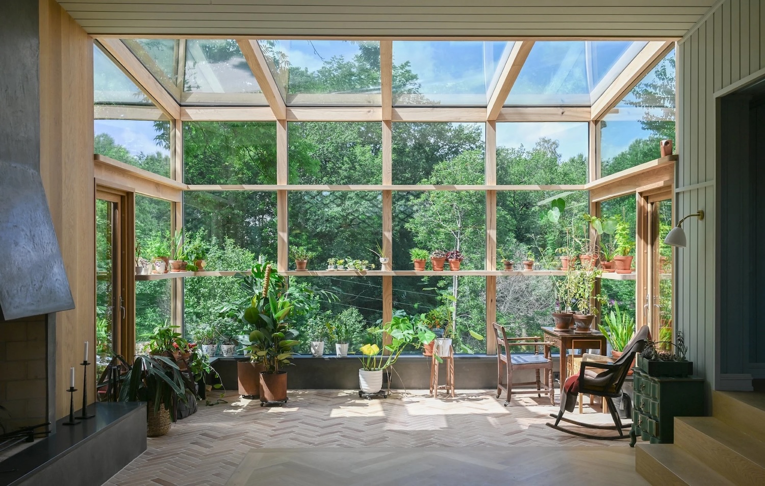 De grandes baies vitrées orientées à l’ouest ont été conçues pour relier l’intérieur à la verdure environnante et capter le soleil rasant de l’après-midi, assurant ainsi un apport solaire passif durant l’hiver. Les architectes ont créé deux espaces verts intermédiaires – une cour extérieure et un jardin d’hiver intérieur – entre les nouveaux volumes et la maison d’origine. Ces espaces apportent lumière, plantes et rythme des saisons au quotidien.