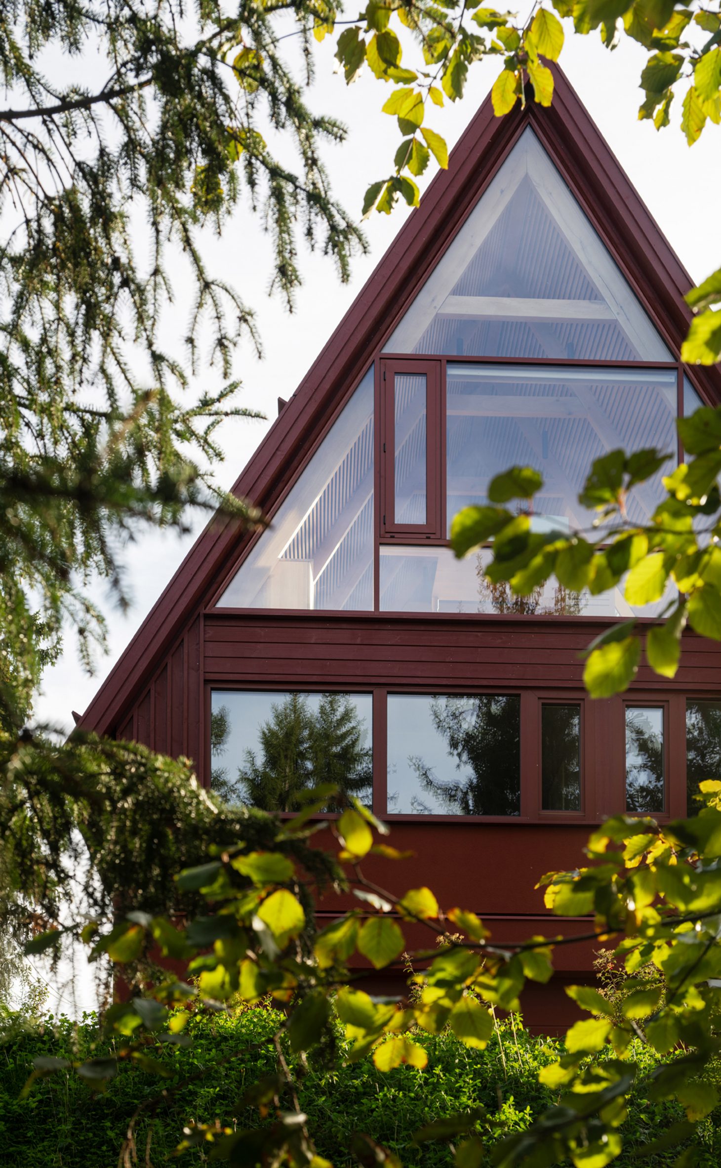L’une est positionnée au nord de la maison d’origine, tandis que la seconde se trouve au sud, formant ainsi un ensemble de trois volumes rouges reliés par des espaces verts. En harmonie avec le style de la maison d’origine, la palette extérieure des extensions combine divers matériaux aux tons rouges, notamment des bardages en bois peint, des briques, des tuiles et des surfaces en acier. Les façades intègrent également des treillis pour favoriser la croissance des plantes.