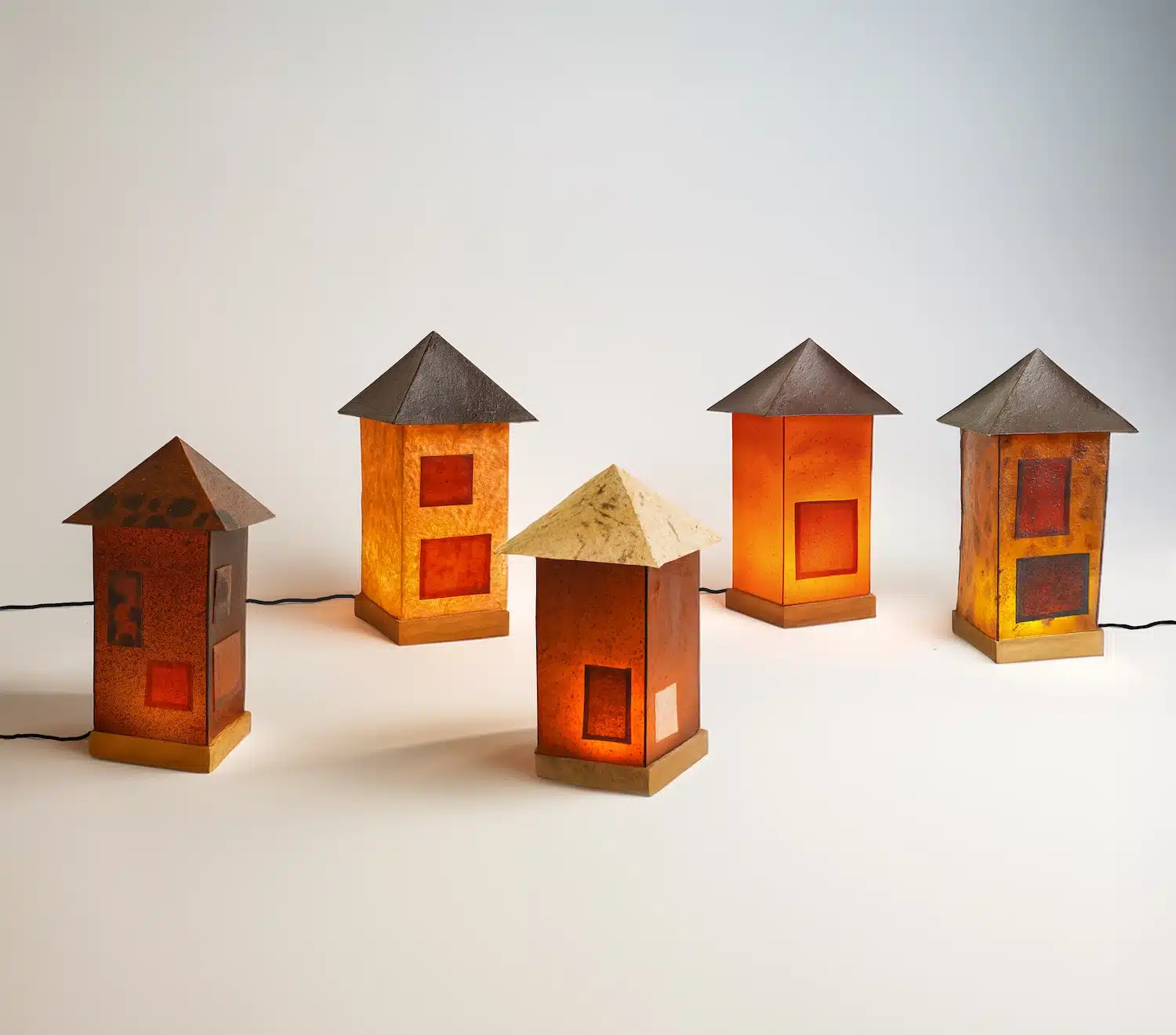 Par leur forme géométrique et leur construction verticale, ces lampes évoquent de petites folies architecturales, presque naïves dans leur simplicité. Un clin d’œil, peut-être, à la maison primitive de Ledoux ou aux maquettes de villages utopiques.