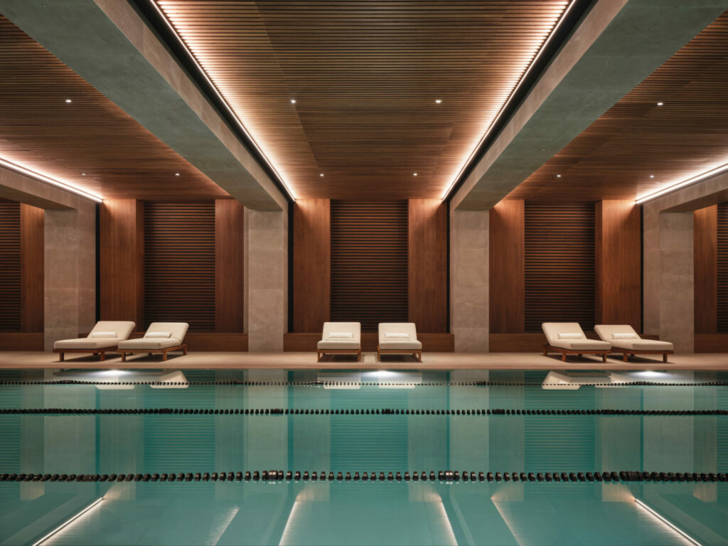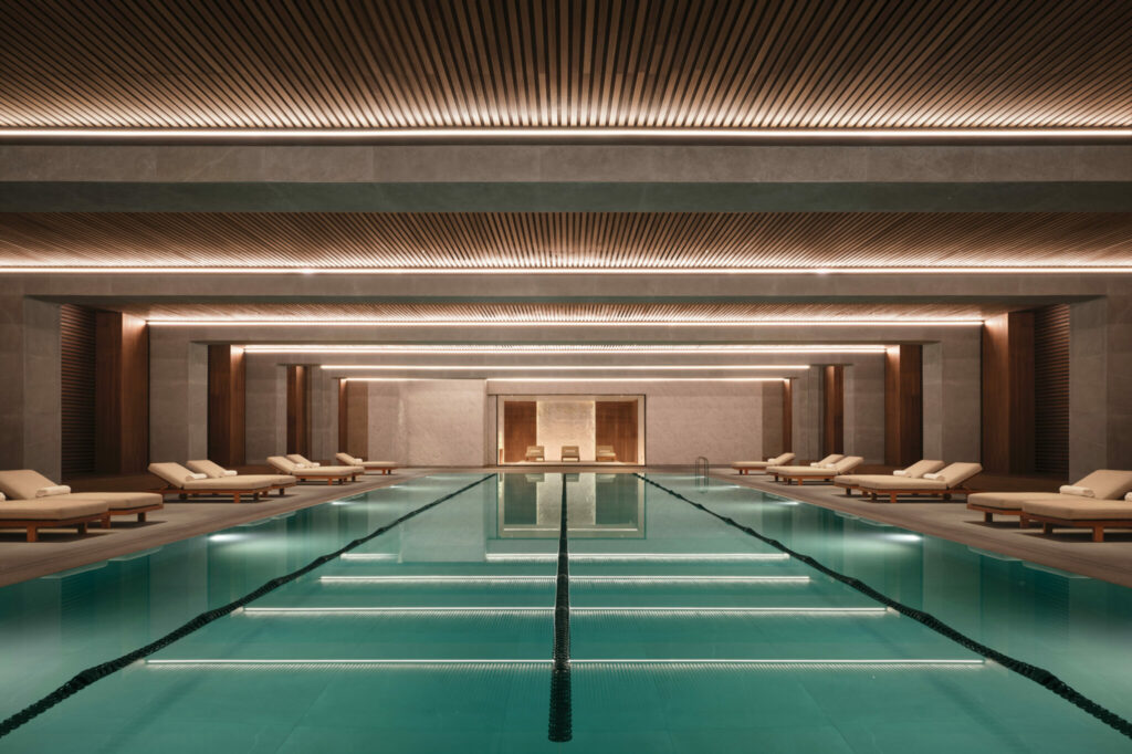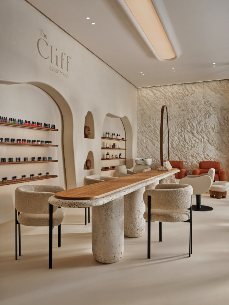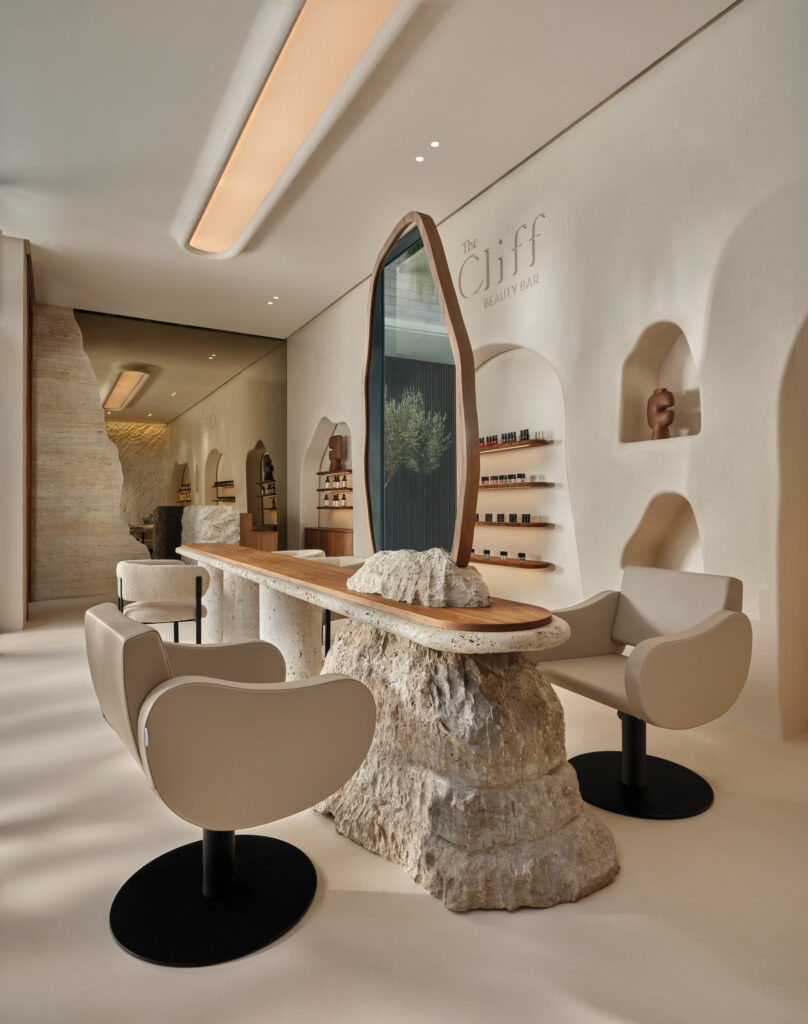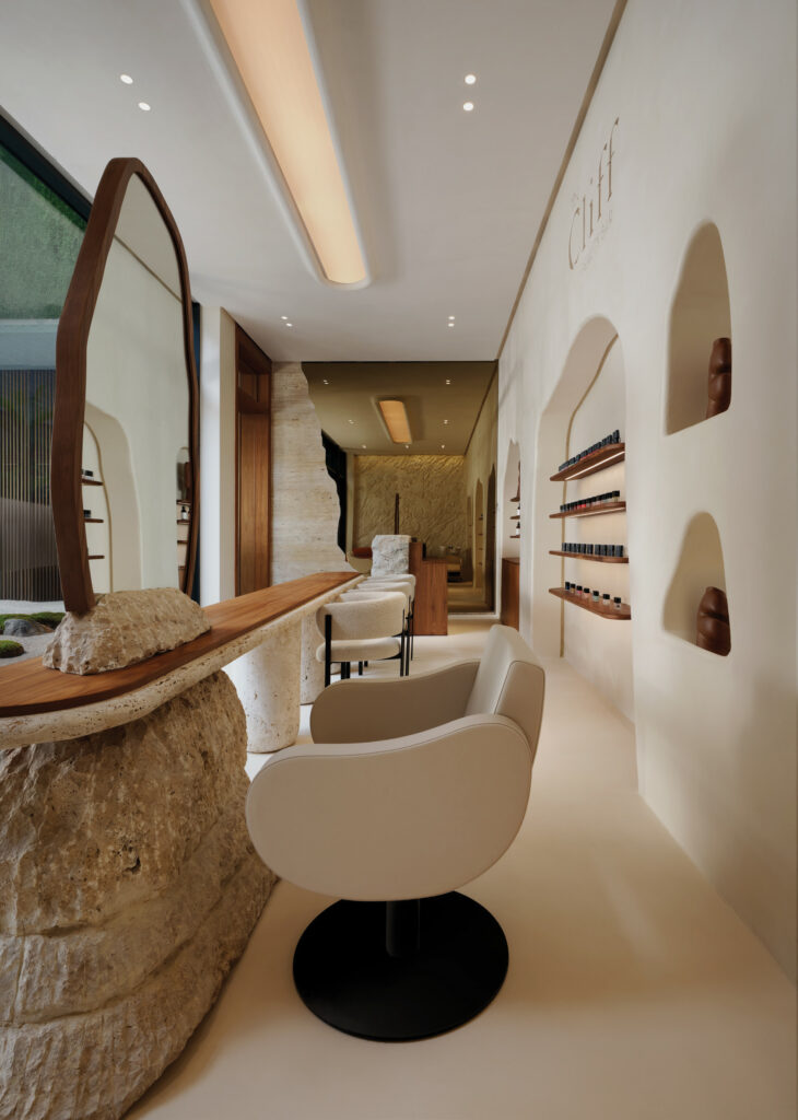 Un Beauty Bar vient enrichir l’expérience, avec pour pièce maîtresse une table singulière dessinée sur mesure, conçue comme une sculpture fonctionnelle au centre de l’espace. Le parcours s’étend également à une salle de sport et plusieurs zones de repos, où le design reste fidèle à l’esprit minéral et organique du lieu.