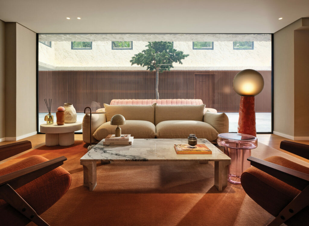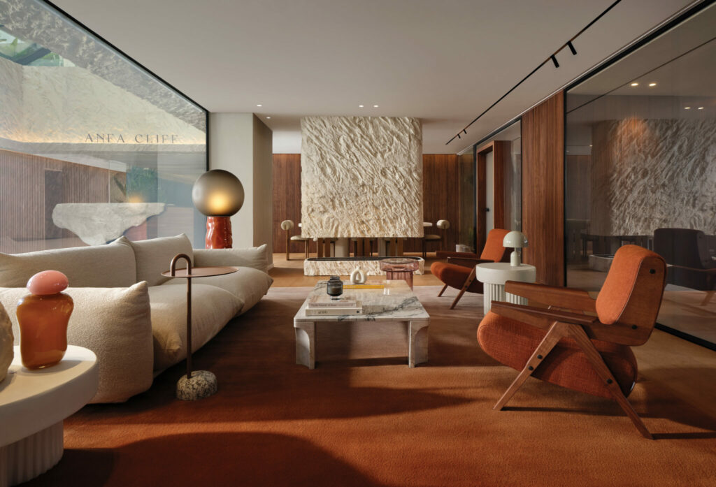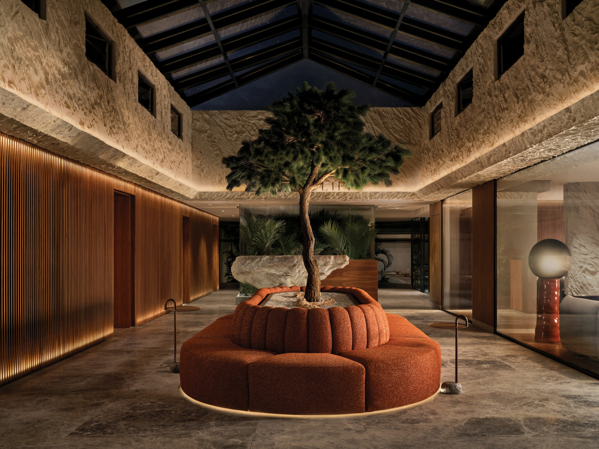 L’ensemble reprend un vocabulaire minéral et organique, où le béton ciré, les matériaux bruts et les formes sculpturales composent une atmosphère poétique et intemporelle.