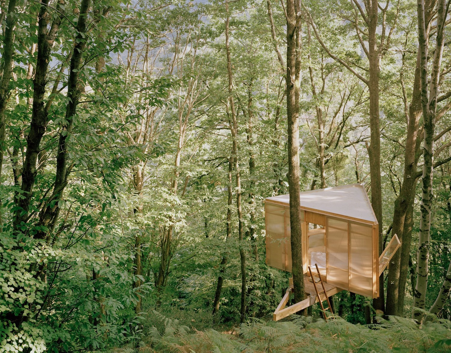 Nichée au cœur des arbres de la vallée d’Onsernone, la cabane a été conçue pour un artiste et militant écologiste suisse en quête d’un refuge en pleine nature. Les règles d’urbanisme locales interdisant une extension de maison traditionnelle ou la construction de fondations, Petzold a imaginé une structure en bois surélevée, soutenue par trois arbres.