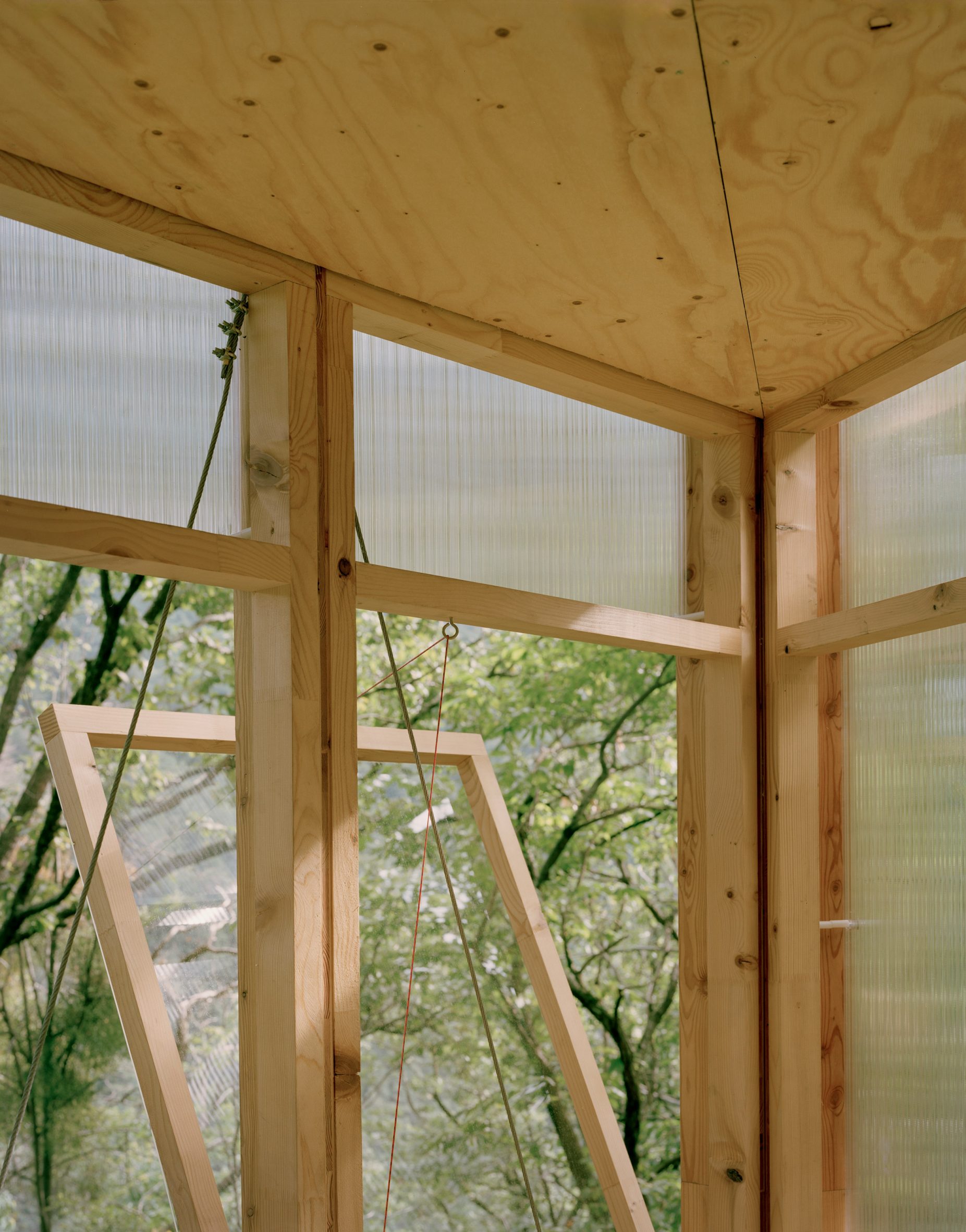 Une échelle permet d’accéder à la base triangulaire suspendue de la cabane, construite à partir de trois poutres de mélèze fixées autour de trois chênes. Revêtu de panneaux de polycarbonate, un abri en épicéa de forme triangulaire équilatérale a été installé en biais sur sa base. À l’intérieur, une longue planche de bois traverse un mur de l’atelier pour former une banquette, tandis qu’une autre fait office de bureau. Un lit se trouve sous le plancher, accessible en retirant quatre planches de bois.