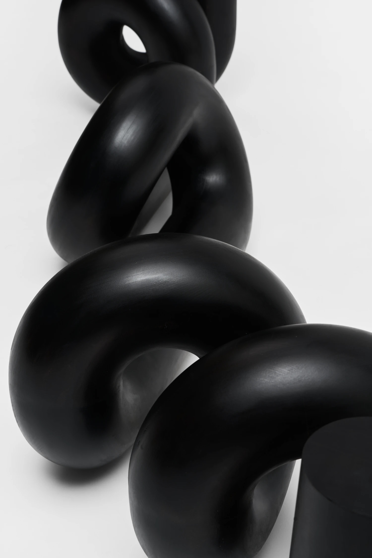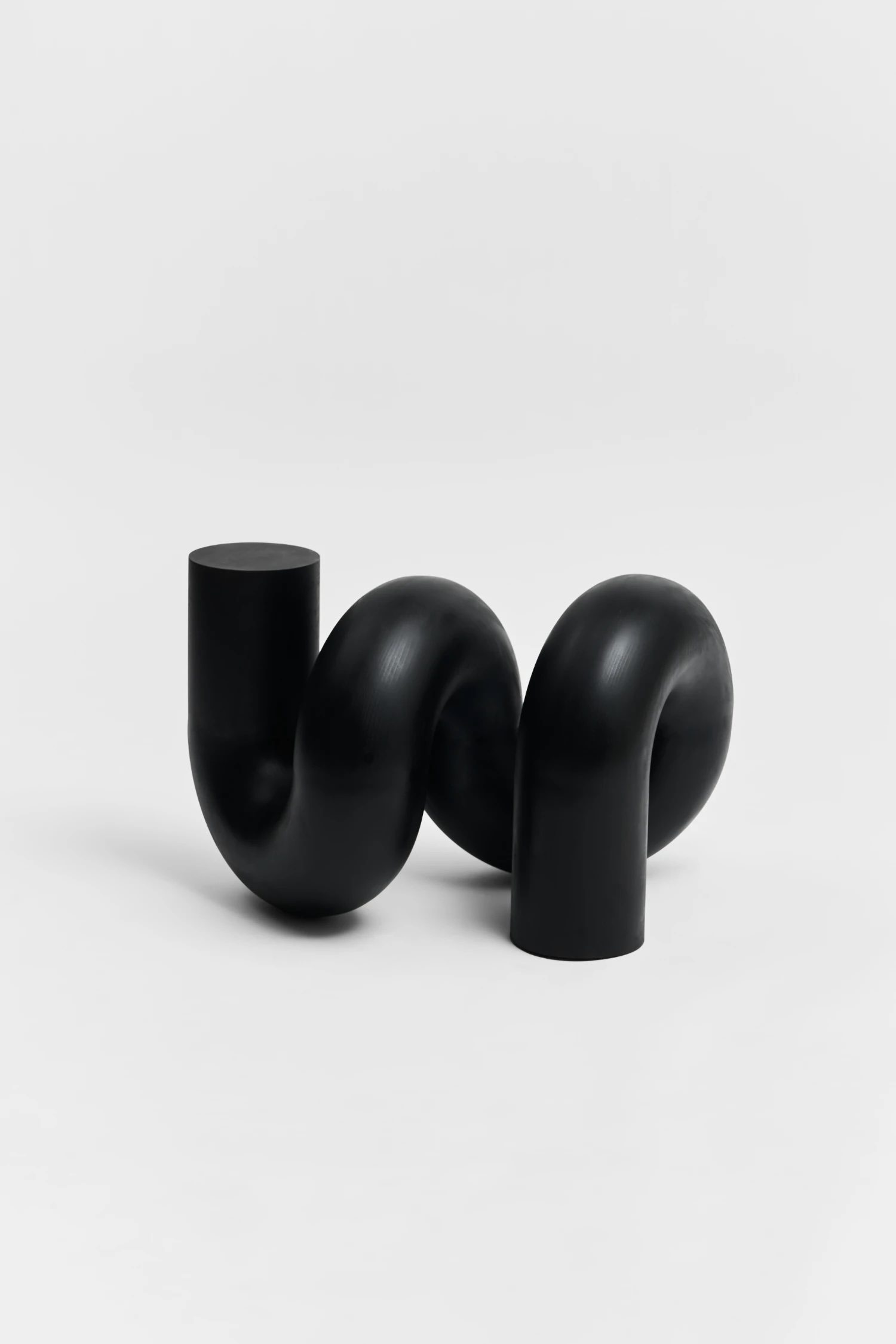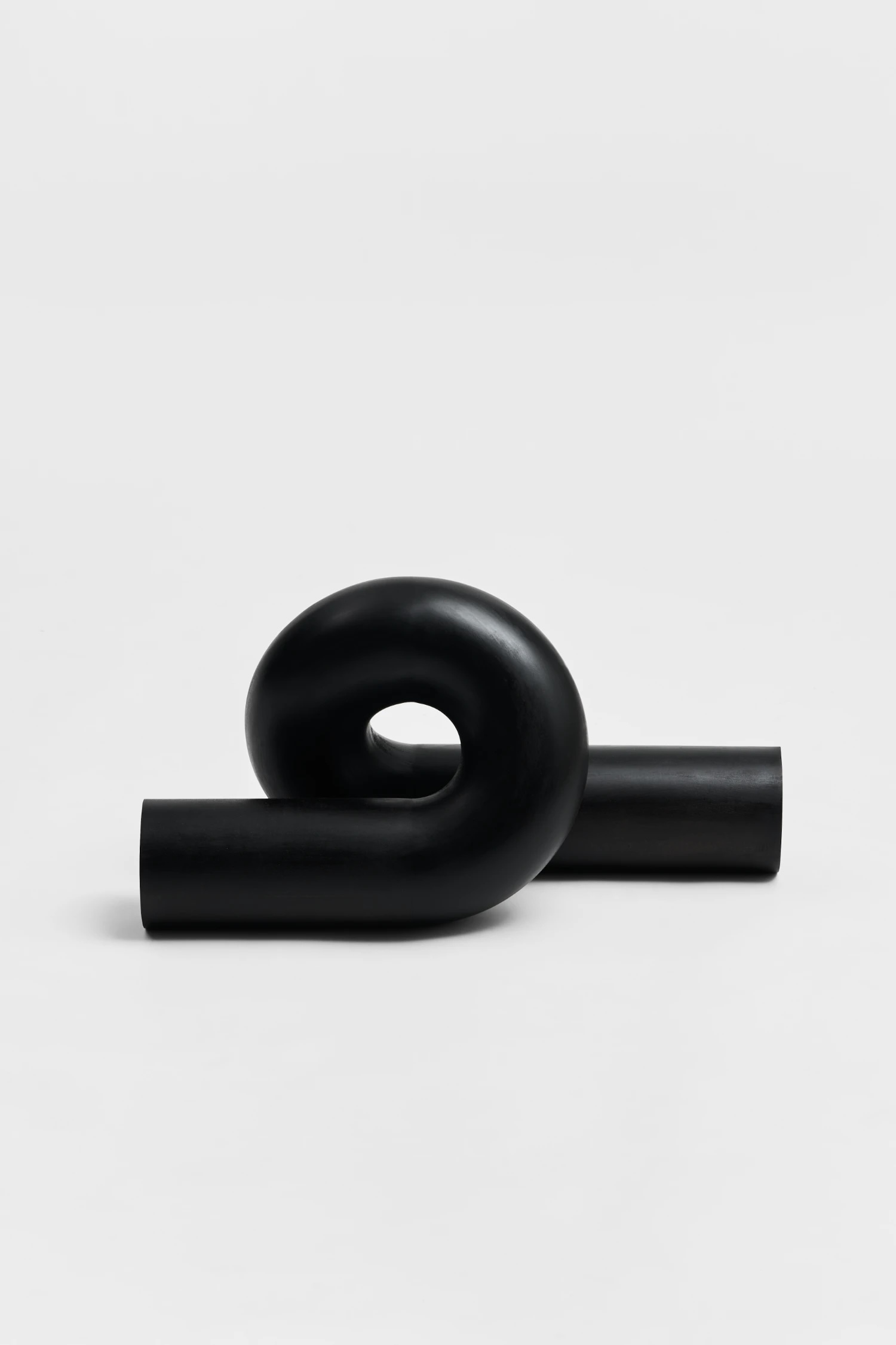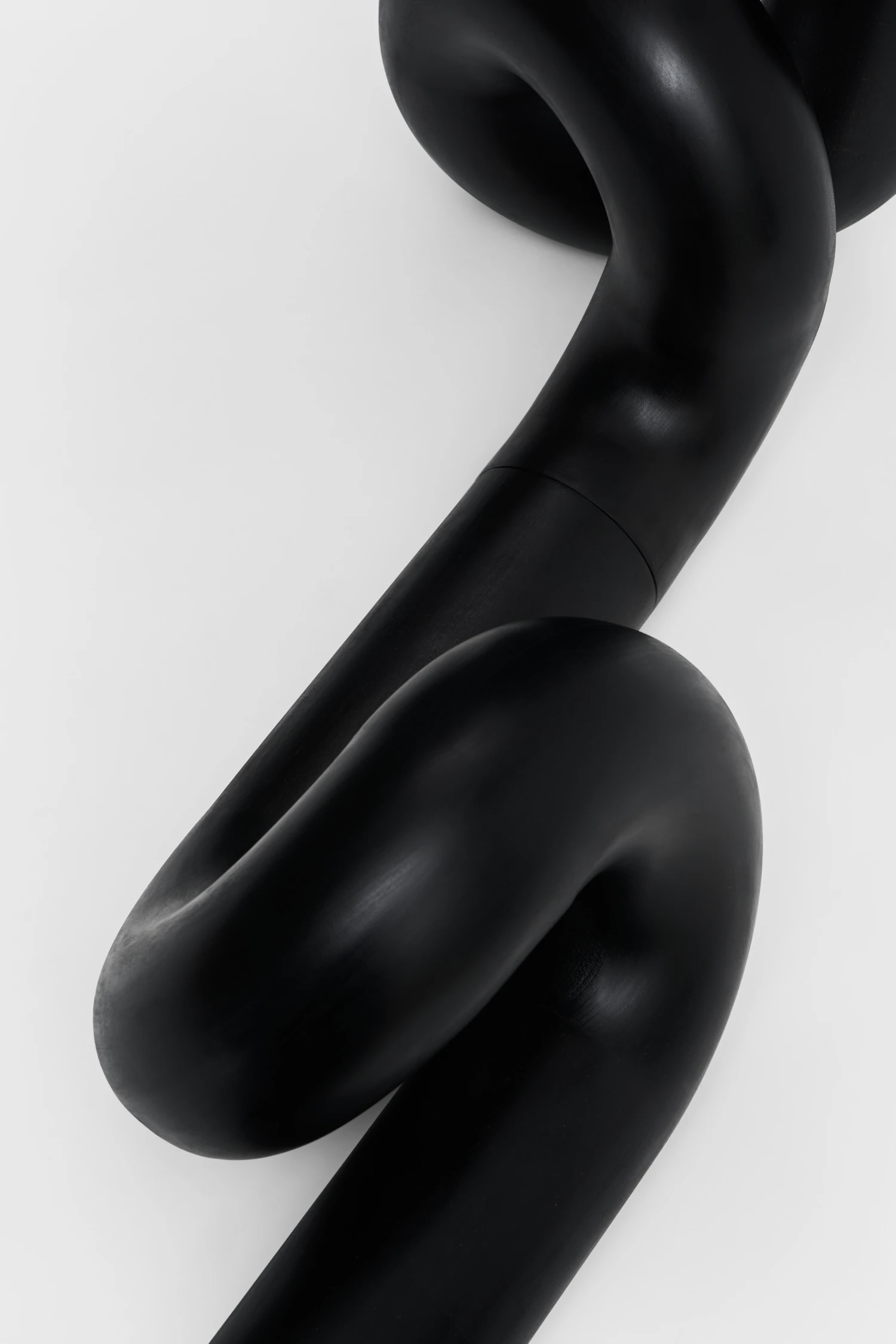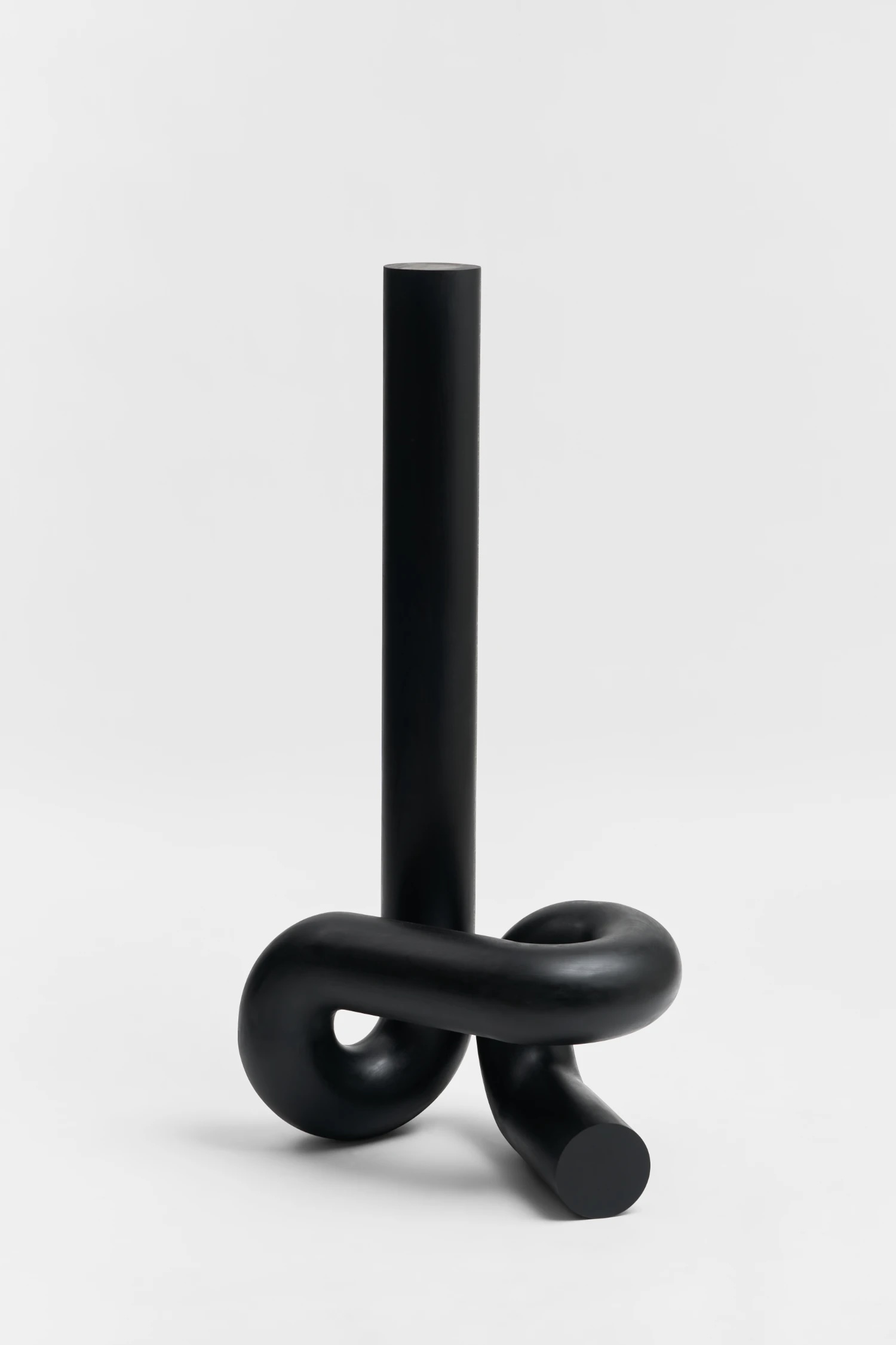 À côté des panneaux sculptés, les sculptures tubulaires introduisent un contrepoint : la fluidité dans la contrainte. Ces formes d’un noir mat – bouclées, nouées, inclinées – s’apparentent à des signes de ponctuation échappant à la linéarité du langage. Leurs courbes suggèrent un mouvement interrompu, un geste suspendu dans le vide. Là où les reliefs capturent le temps par l’accumulation, les pièces tubulaires le font par la suspension ; elles se comportent comme le temps replié sur lui-même. Leur sobriété renforce leur présence.
