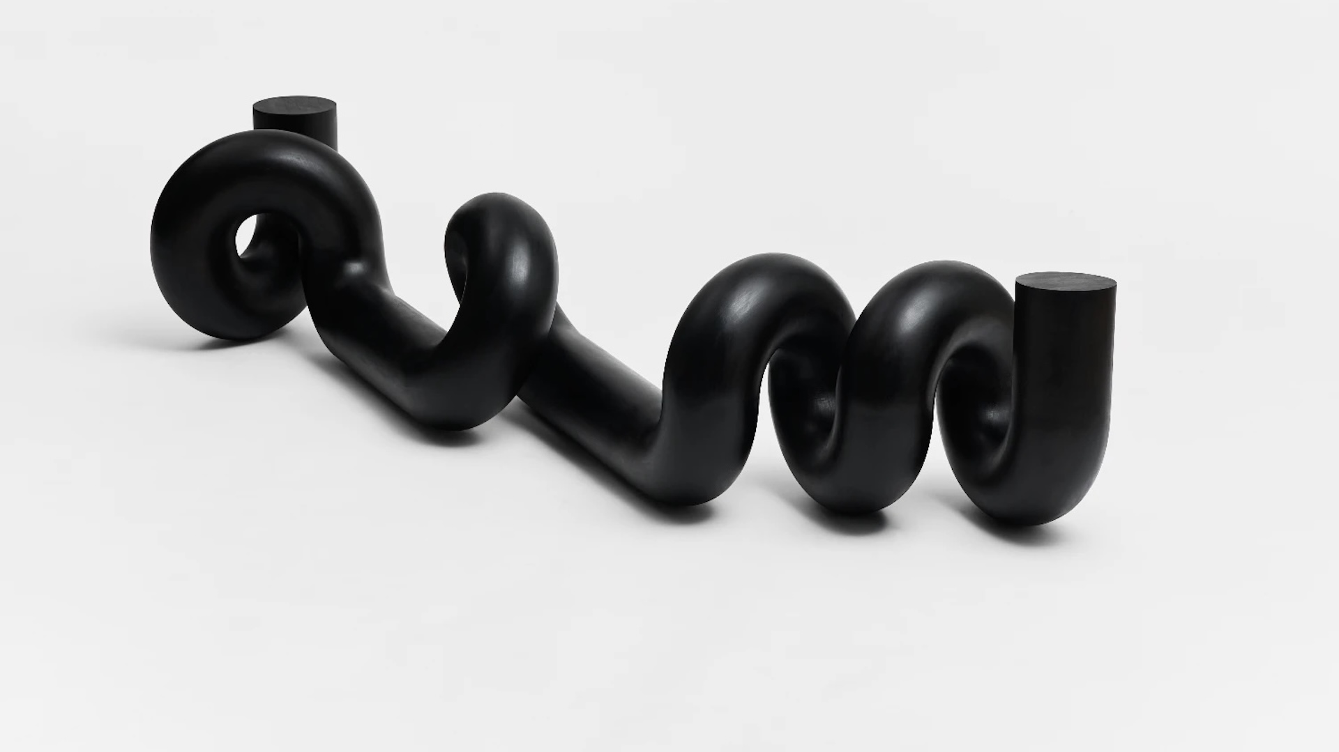 À côté des panneaux sculptés, les sculptures tubulaires introduisent un contrepoint : la fluidité dans la contrainte. Ces formes d’un noir mat – bouclées, nouées, inclinées – s’apparentent à des signes de ponctuation échappant à la linéarité du langage. Leurs courbes suggèrent un mouvement interrompu, un geste suspendu dans le vide. Là où les reliefs capturent le temps par l’accumulation, les pièces tubulaires le font par la suspension ; elles se comportent comme le temps replié sur lui-même. Leur sobriété renforce leur présence.