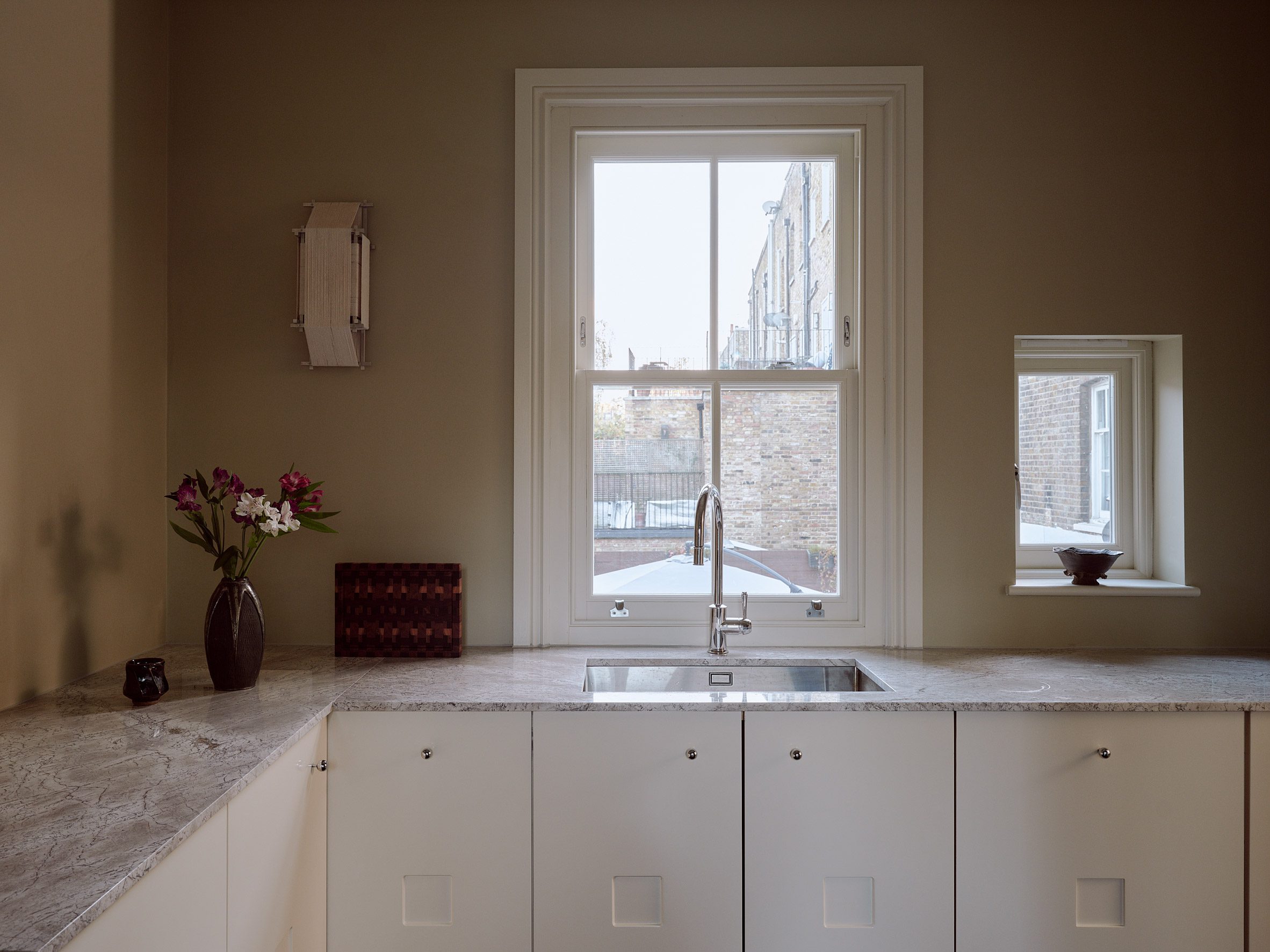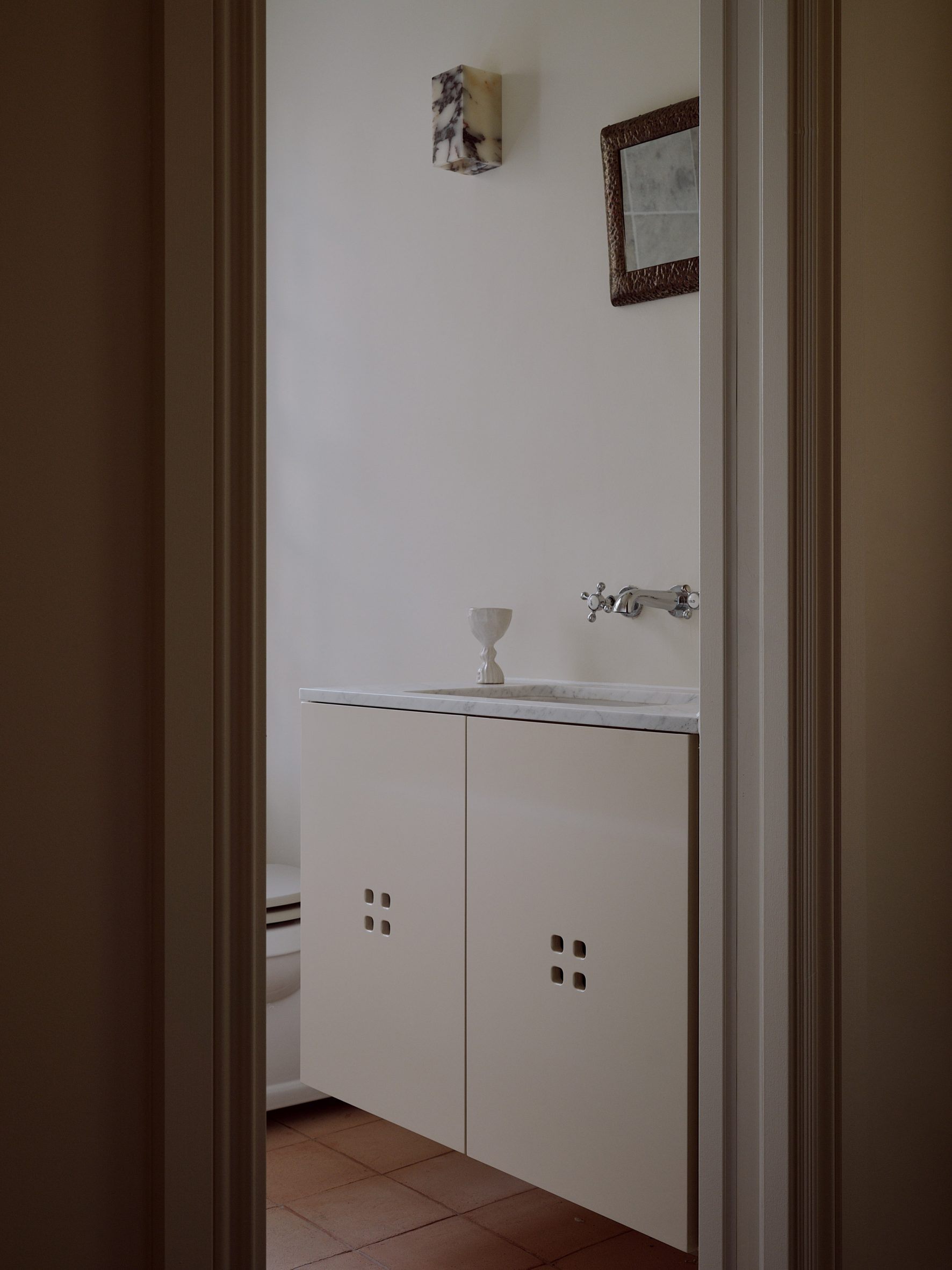 Un mélange de meubles chinés par le marchand d’antiquités Myakin et une grande œuvre surréaliste de l’artiste londonienne Kate Burling ornent le salon attenant. À l’étage, les salles de bains sont revêtues de carrelage en terre cuite et de meubles vasques sur mesure, surmontés de chutes de marbre clair. Leurs portes présentent des découpes carrées qui rappellent les meubles de cuisine du rez-de-chaussée et contribuent à l’harmonie de l’espace. La chambre principale est dominée par une tête de lit en bois de sapelli qui s’étend d’un bout à l’autre de la pièce.