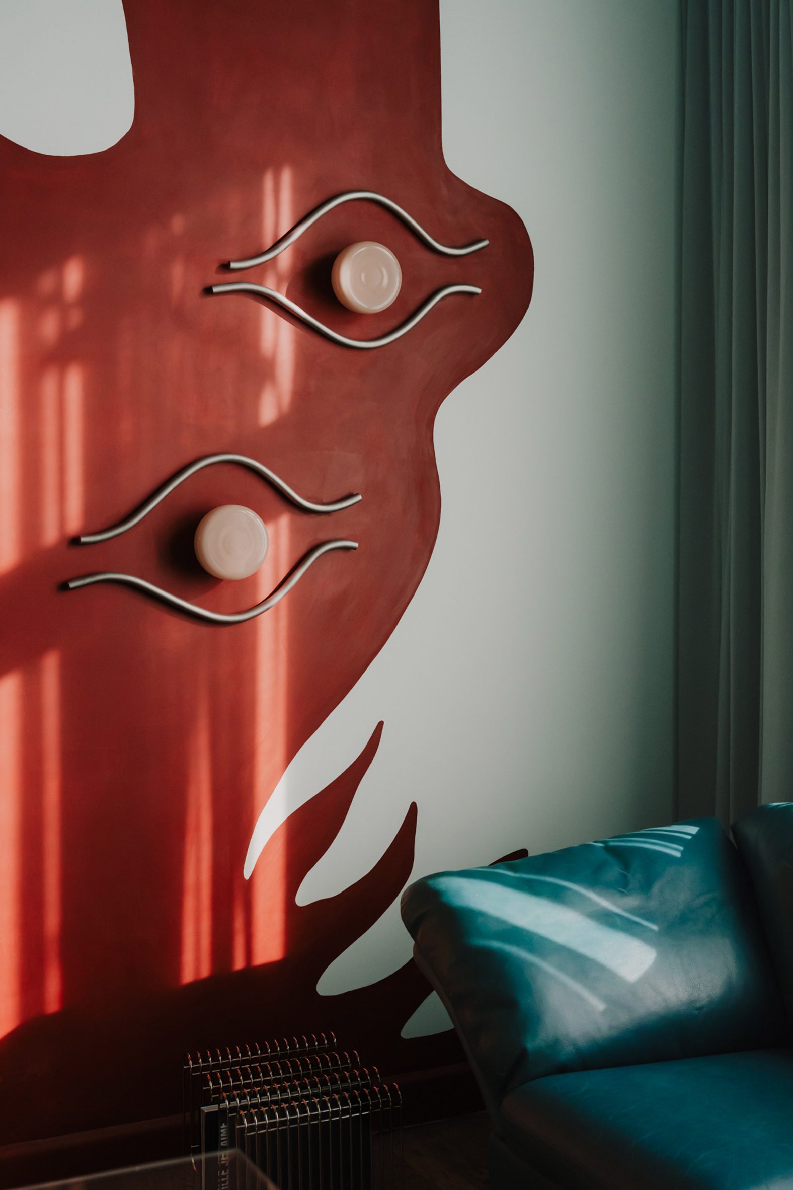 Une grande partie du mobilier de l’appartement a été conçue par COI Studio, des étagères colorées aux tables et lampes, en passant par des accessoires subtils, notamment des décorations ludiques en forme d’œil fixées aux murs.