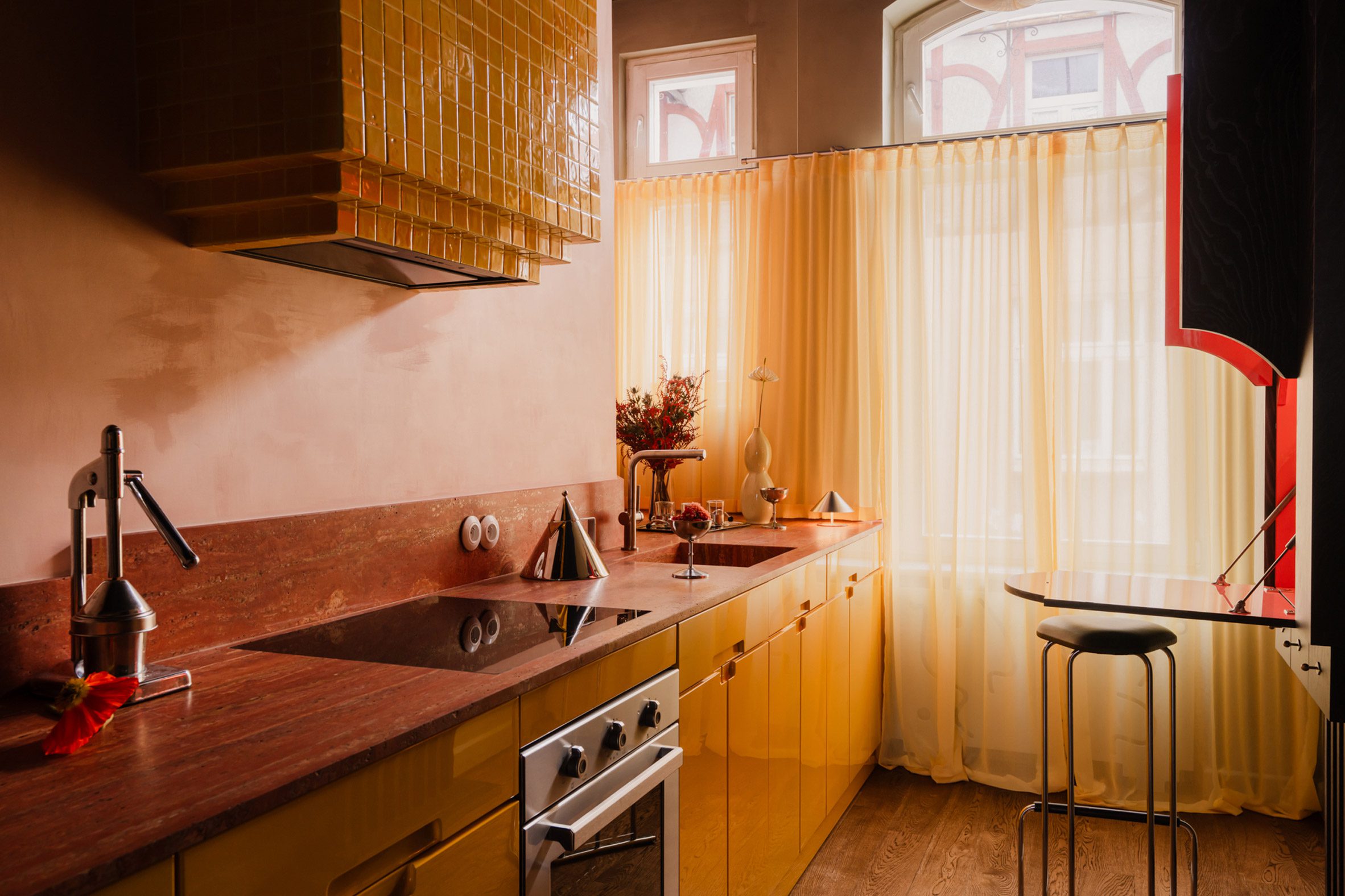 La cuisine est baignée de lumière naturelle grâce à de grandes baies vitrées, dissimulées derrière des rideaux jaunes translucides et vaporeux.