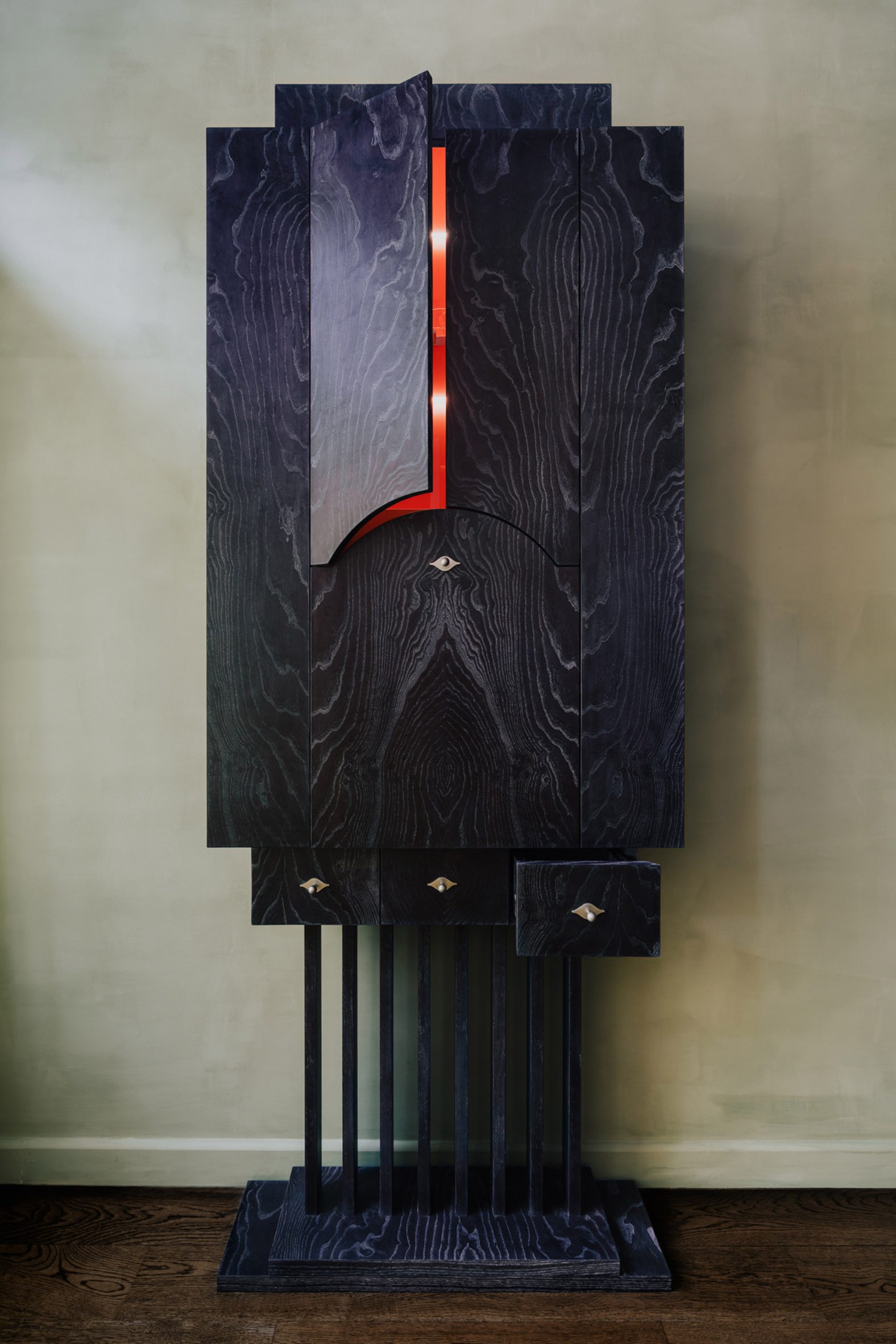 Des commodes sur mesure, conçues par COI Studio, affirment leur style dans toute la maison, notamment une grande armoire asymétrique dans la salle à manger et un bureau en loupe de chêne massif dans la cuisine.