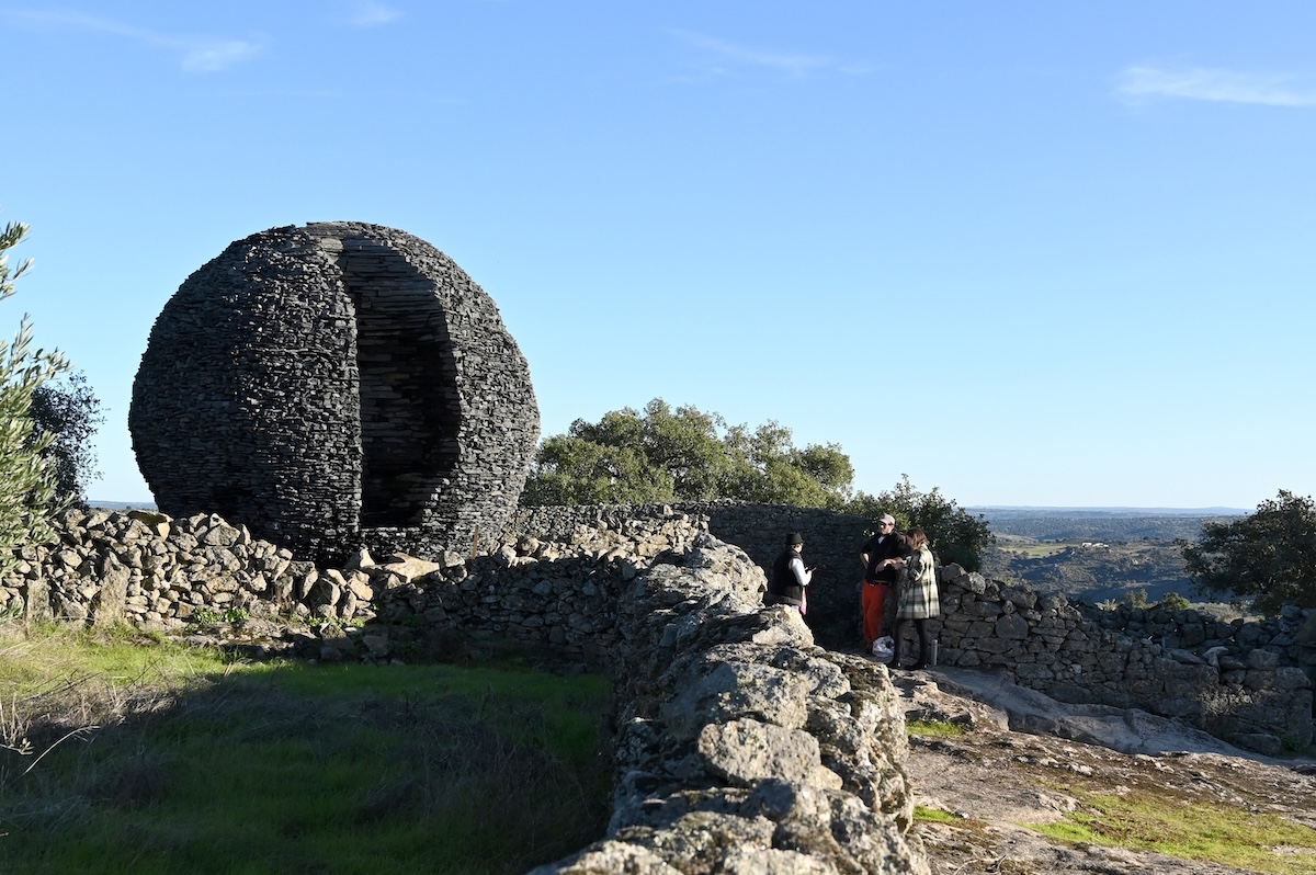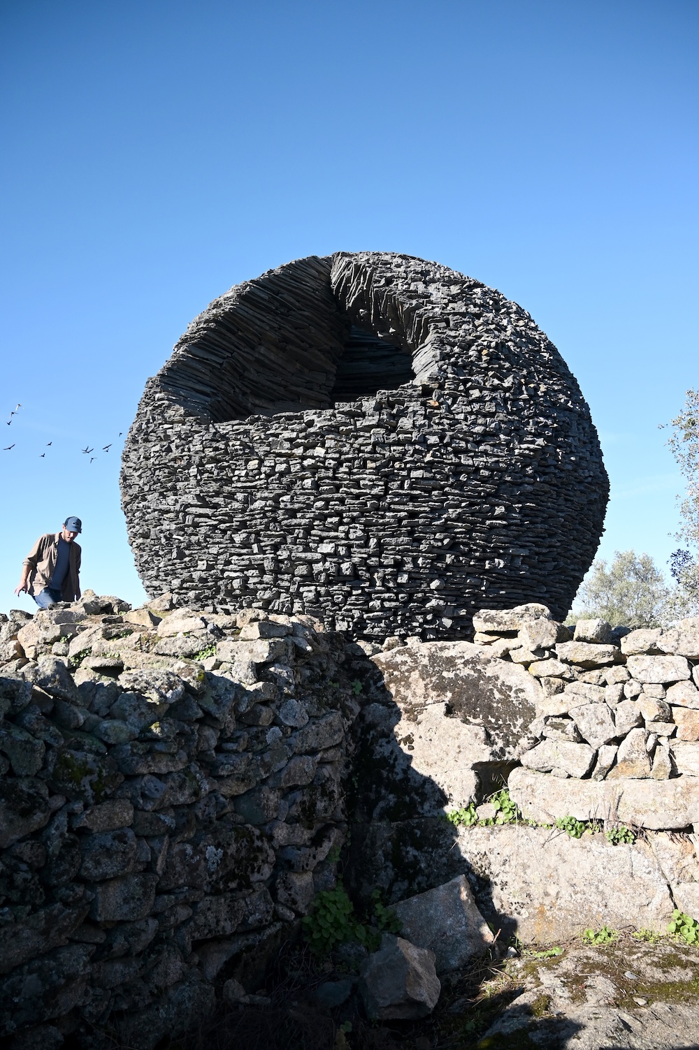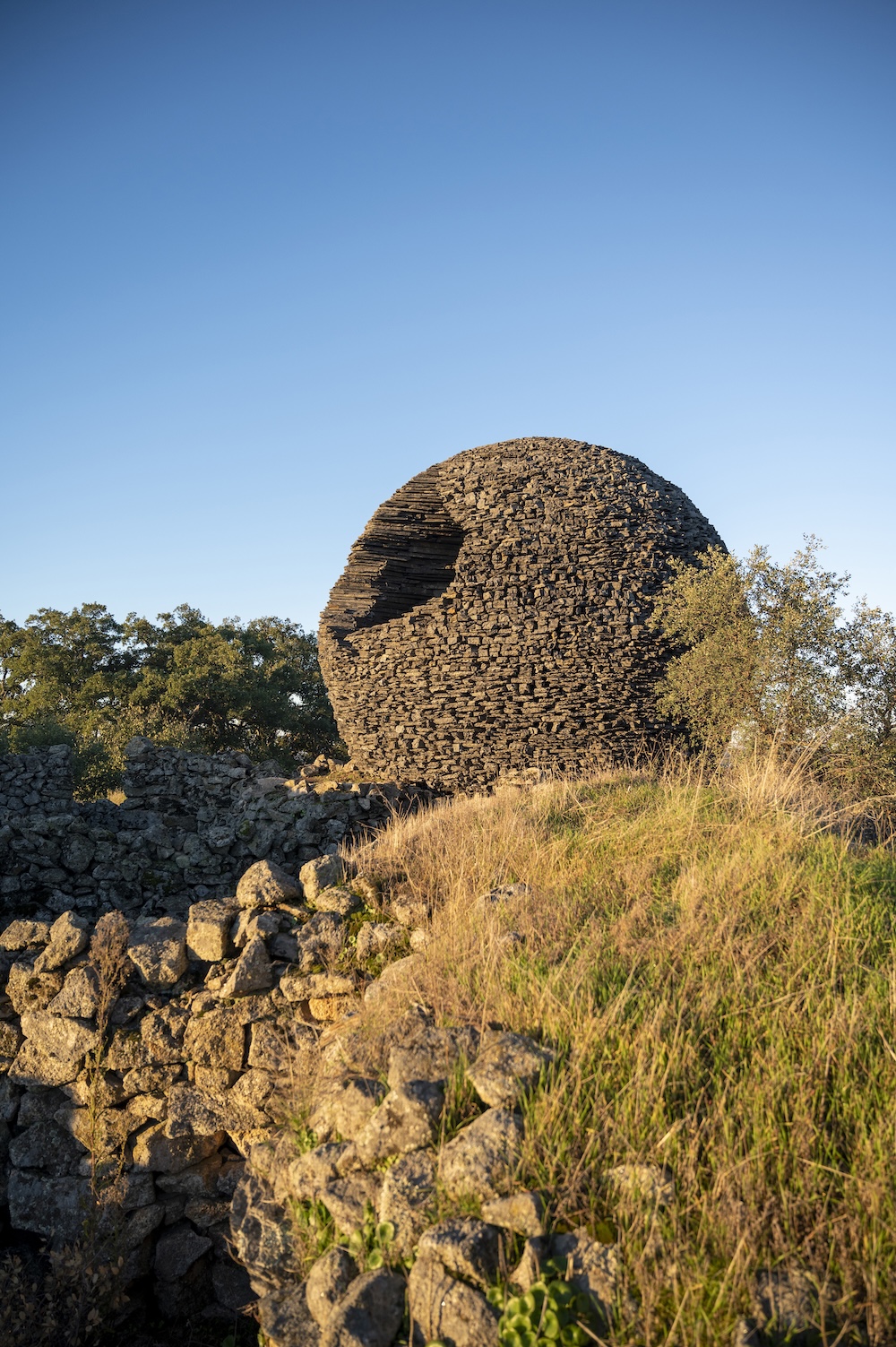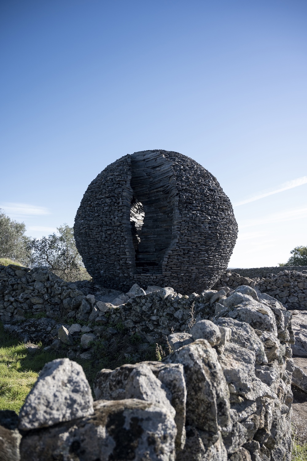L’Atelier YokYok vient de nous partager sa dernière réalisation dans le paysage de Salvaterra do Extremo, à l’extrême est du Portugal. Une sphère de cinq mètres de diamètre, construite pierre à pierre en schiste noir local, sur un ancien site d’élevage aujourd’hui abandonné.