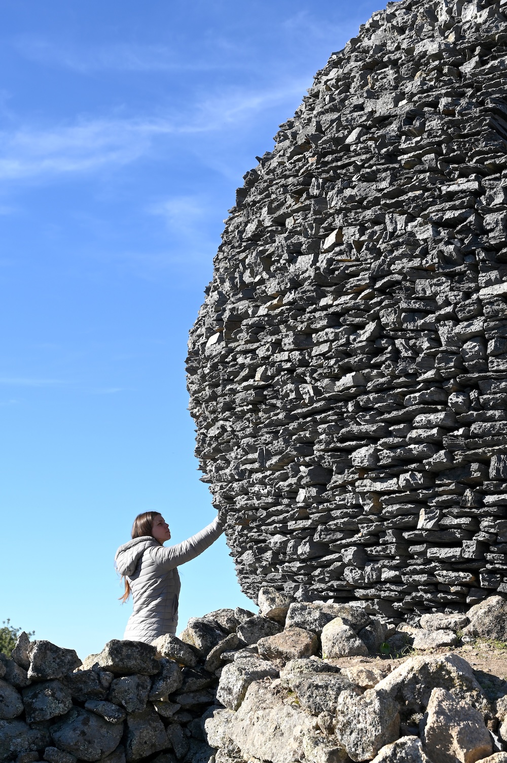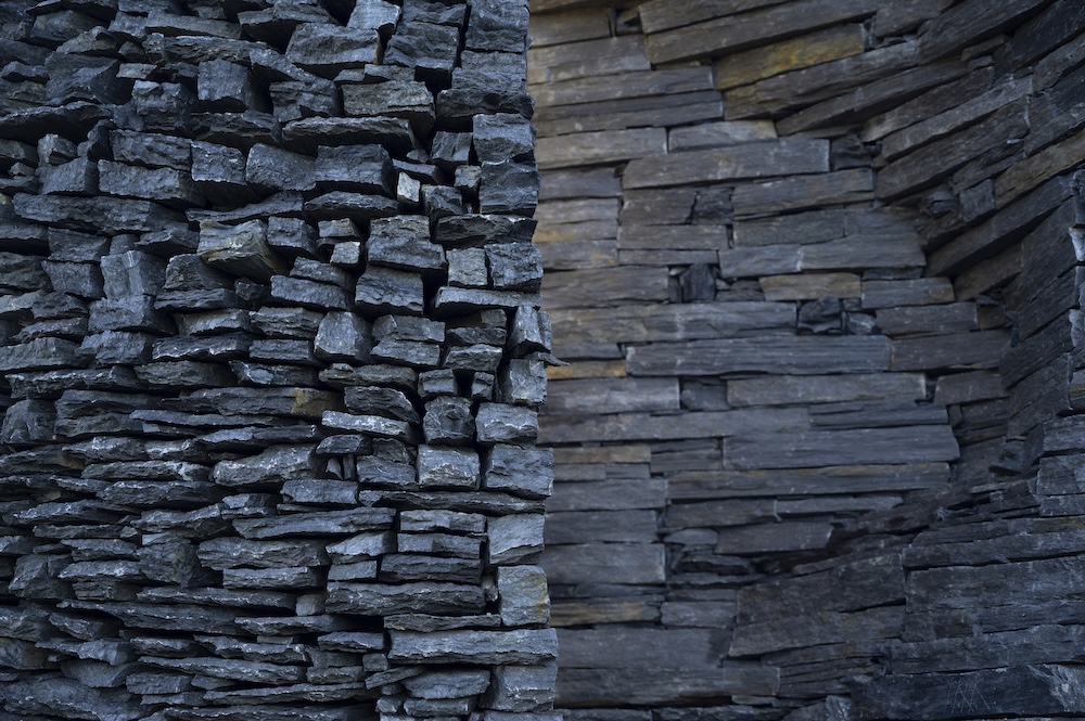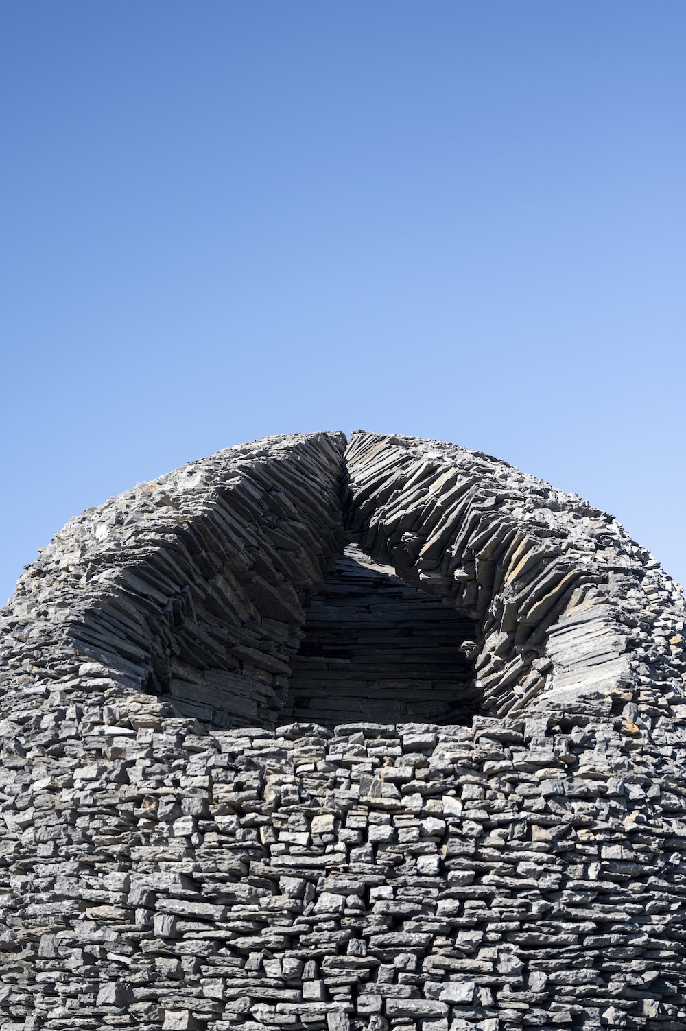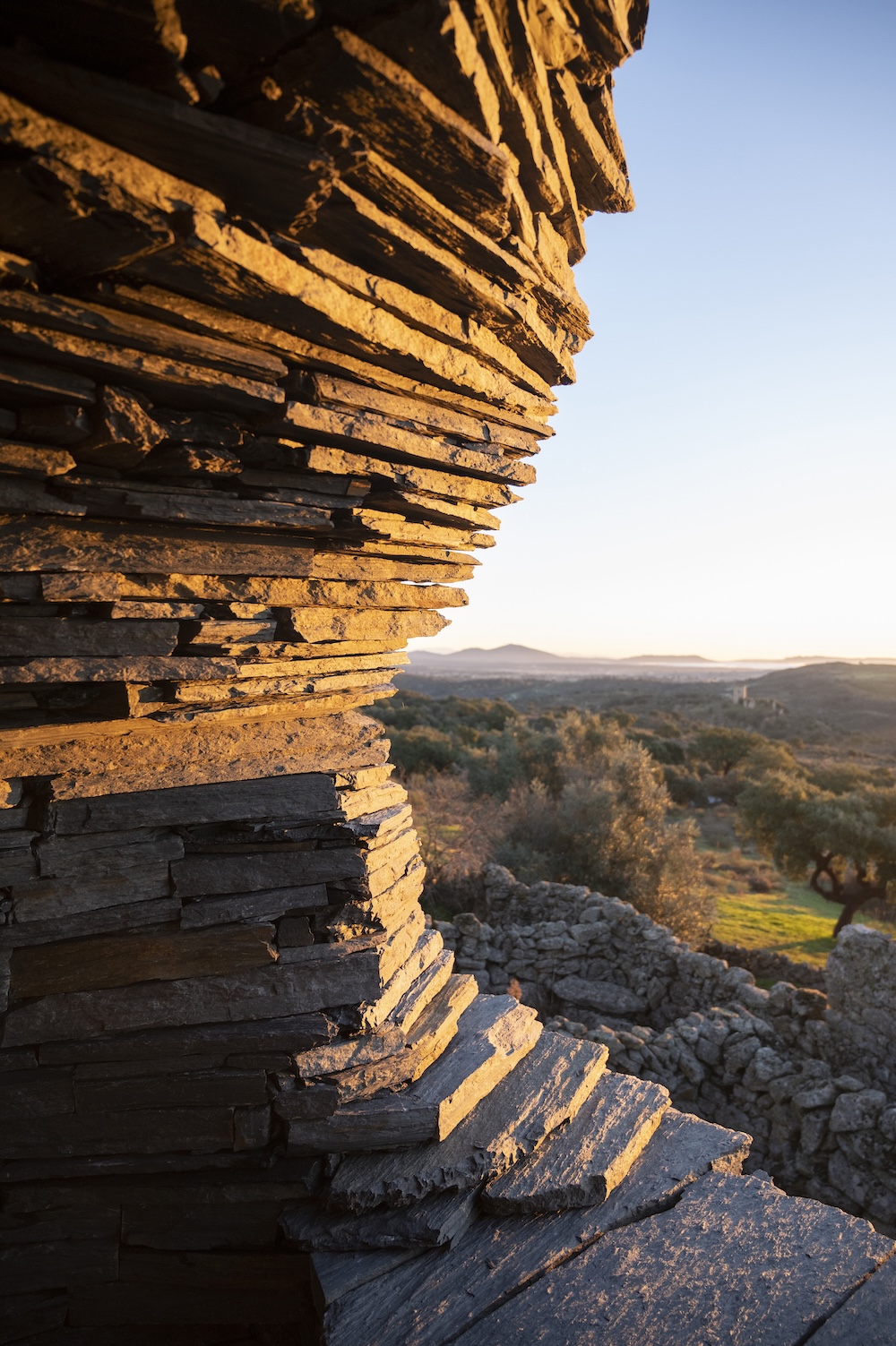 Le schiste noir, composé de couches est ici mis en scène et met en résonance deux échelles de temps : celui de la géologie et celui de la construction. Issu de la terre qui forge l’identité du centre du Portugal, il contraste ici avec le granite du sol tout en renforçant les liens culturels entre le territoire et ses habitants. La sphère, d’un diamètre de 5 mètres, a été conçue et réalisée suite à plusieurs résidences sur le site de Salvaterra qui ont donné lieu à des échanges et des ateliers avec les habitants autour du projet. Elle a été construite à la main par les artistes et la communauté locale, selon des méthodes simples et low-tech, choisies pour respecter le site et impliquer les habitants. Avec patience, curiosité et énergie collective, ces gestes ont donné naissance à une oeuvre à la fois monumentale et intemporelle.