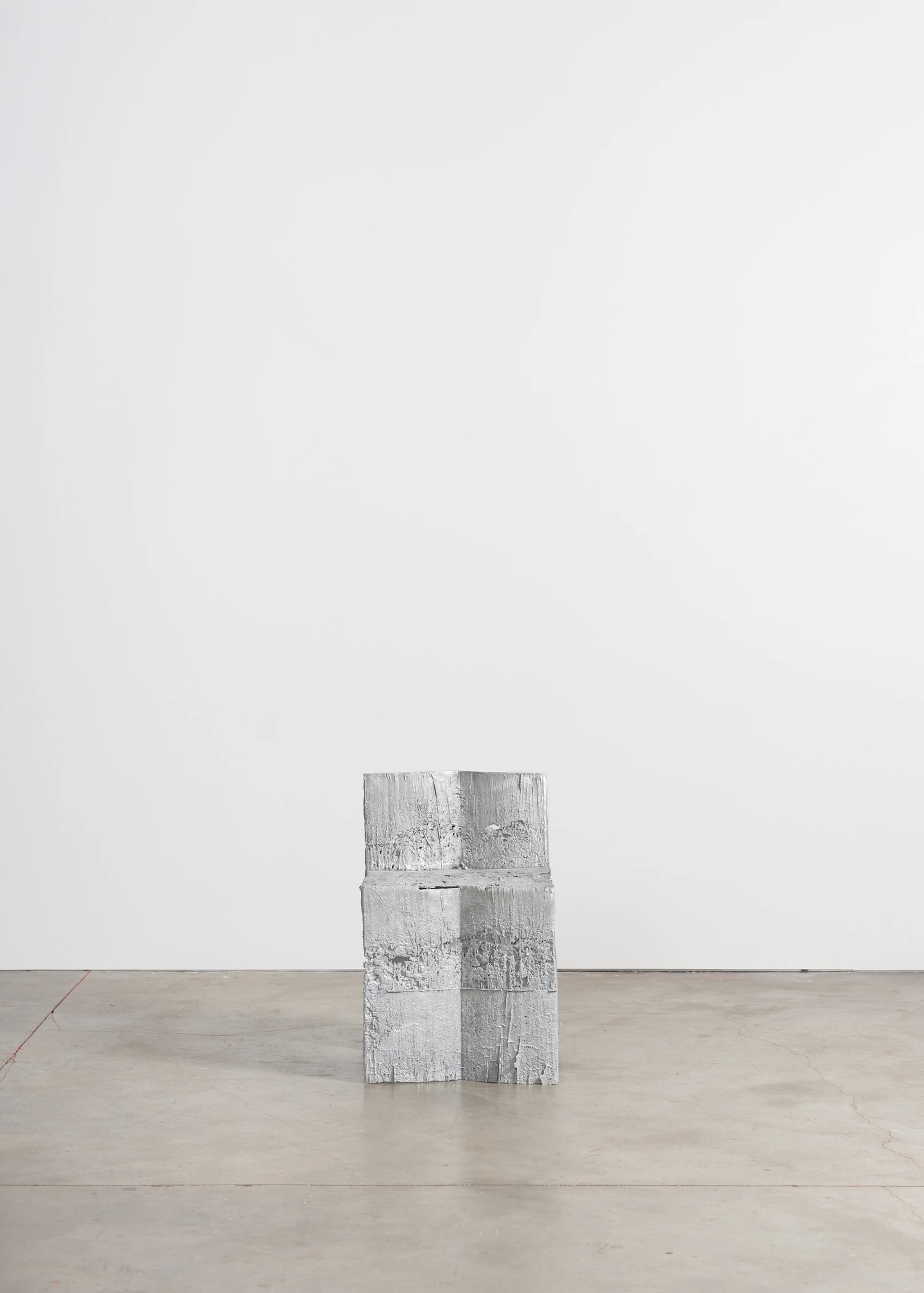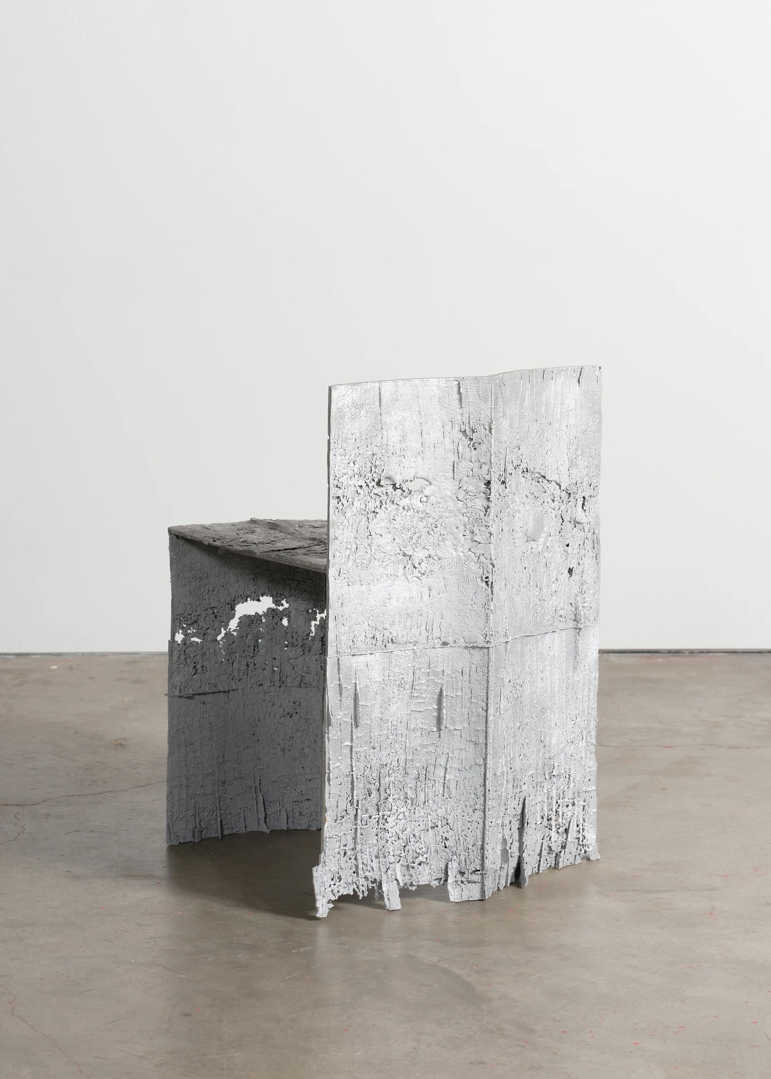 Ce qui confère à la chaise sa gravité émotionnelle n’est pas une référence explicite à la catastrophe, mais son insistance silencieuse sur les conséquences. L’aluminium n’adoucit ni ne neutralise la volatilité du bois ; au contraire, il la fige. Les textures évoquent une peau brûlée ou une pierre érodée, sans pour autant être littérales ou illustratives. L’objet se refuse à toute clarté narrative, laissant s’exprimer le comportement de la matière là où le symbolisme pourrait autrement dominer.