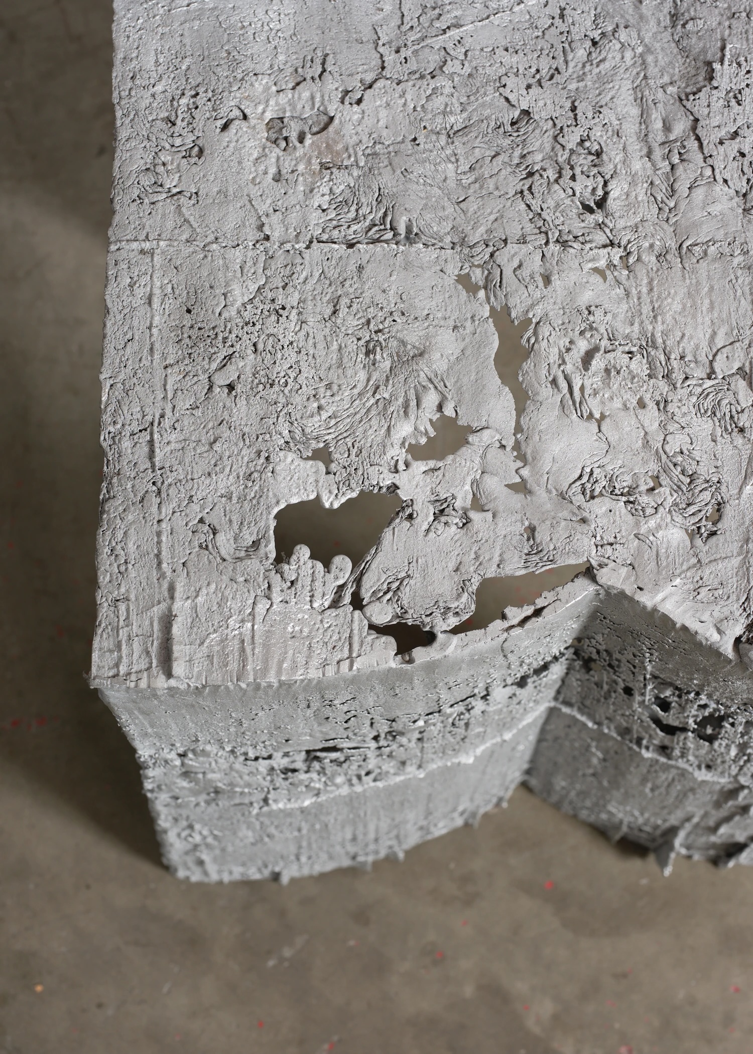 Left Over se révèle être un objet compact et pourtant puissant, qui porte en lui la densité d’un événement plutôt que son spectacle. Au premier abord, sa masse évoque un bloc géologique, plus proche d’un vestige que d’un meuble.
